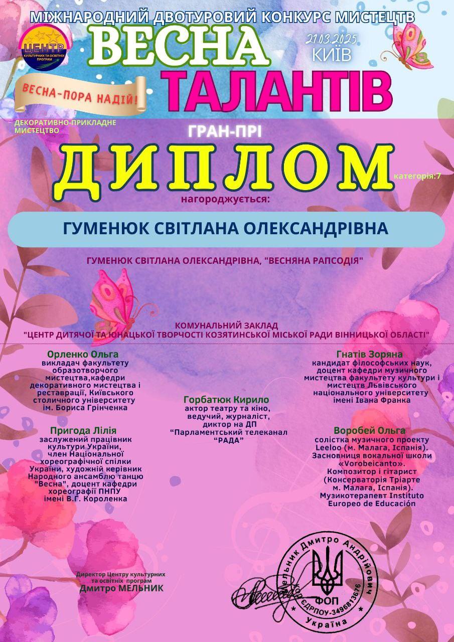 Неймовірна робота талановитої та креативної педагогині з Козятина Світлани Гуменюк «Весняна рапсодія» виборола Гран-Прі.