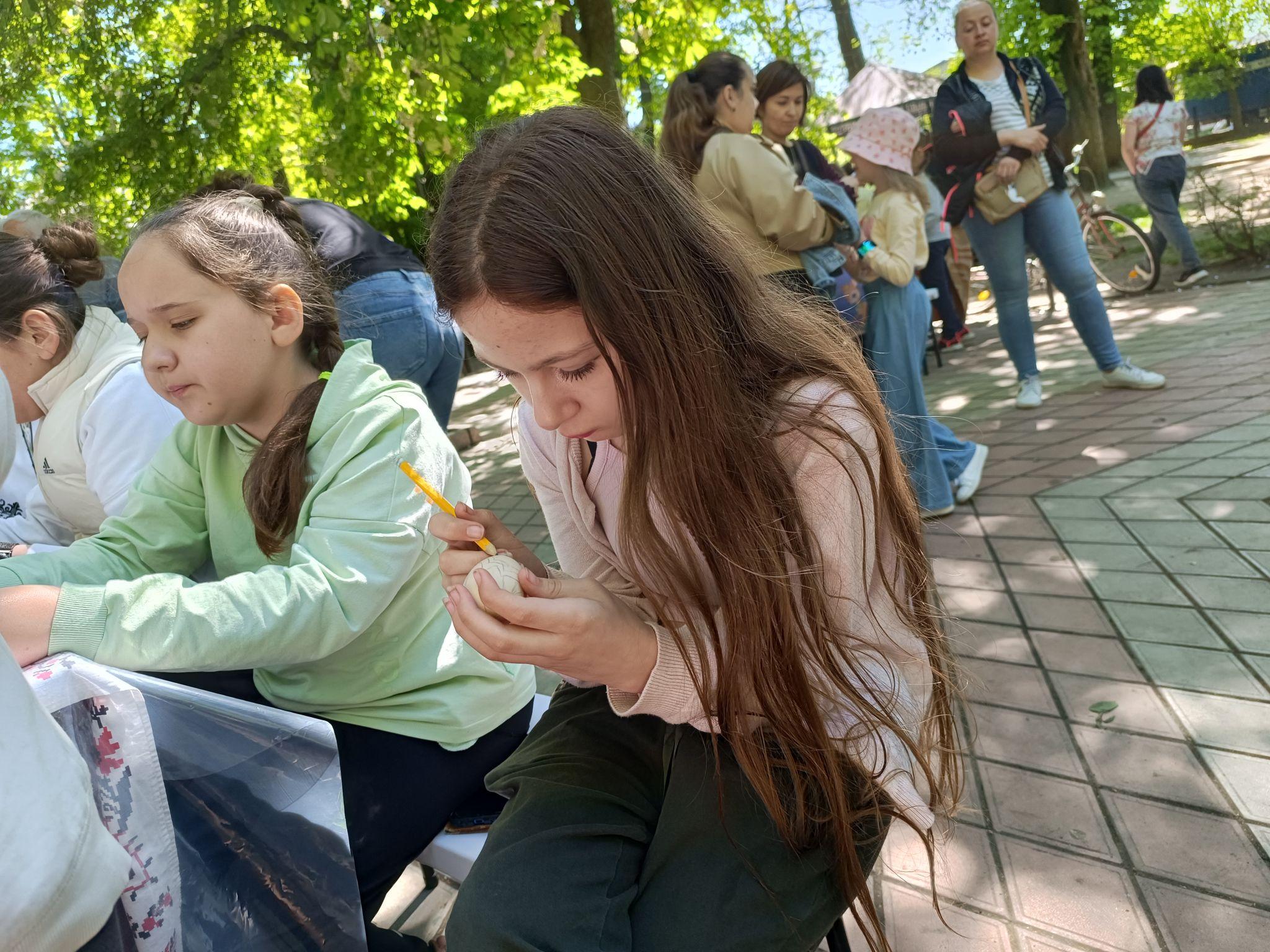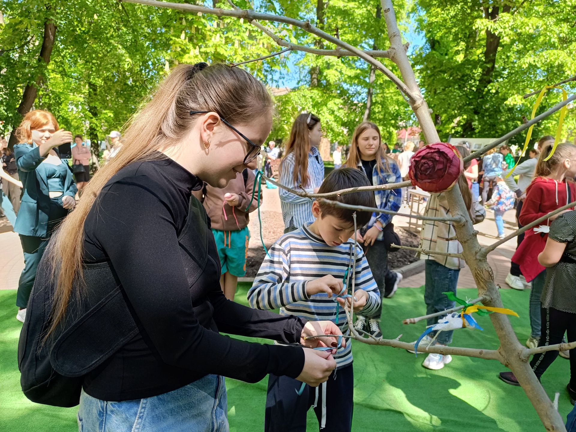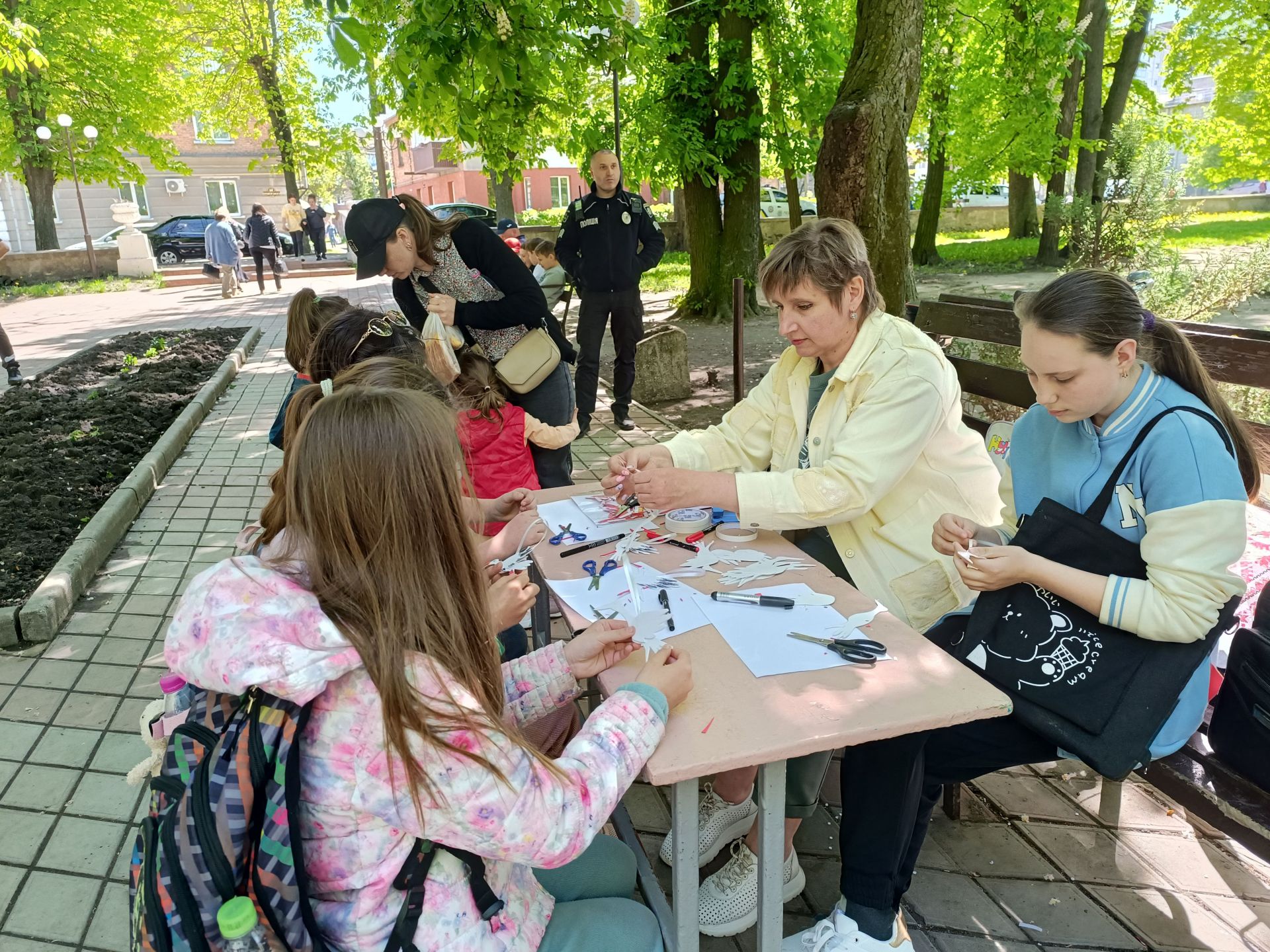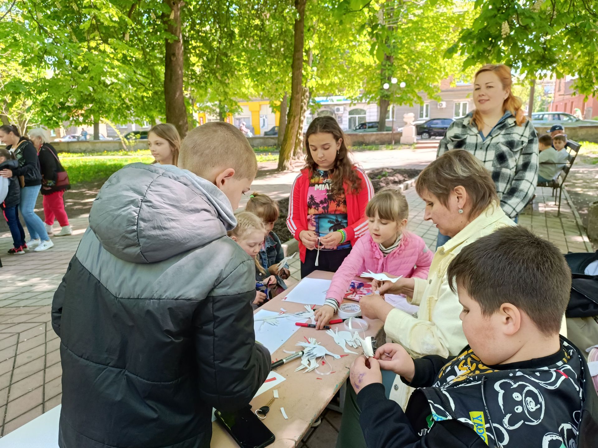 На алеї скверу облаштували локацію, де юним гостям фестивалю показували, як робити веселиків. Майстер-клас провела керівник гуртка «Сувенір» Центру дитячої та юнацької творчості Світлана Гуменюк. На столі перед майстринею — заготовки майбутньої пташки: тулуб та крила на клейовій основі. Хлопчики з дівчатками робили пташку. А щоб її зручно було тримати у руках, Світлана за допомогою дироколу робила у голові пташки отвір, аби продіти туди стрічку.