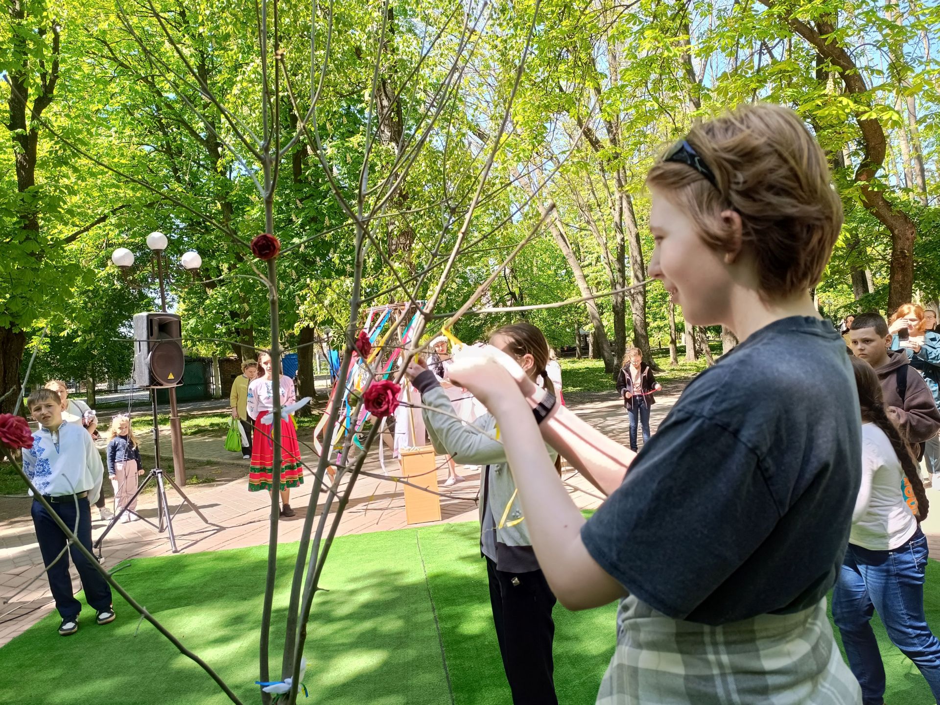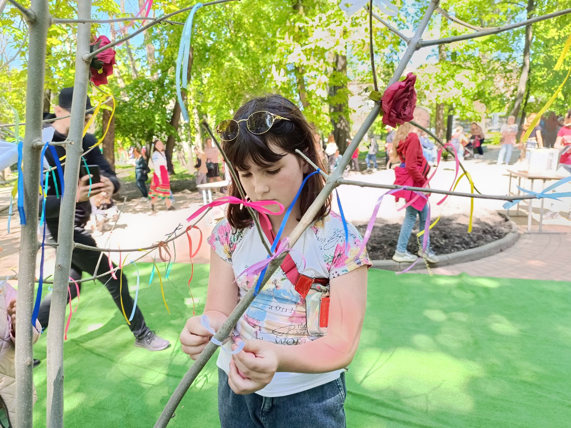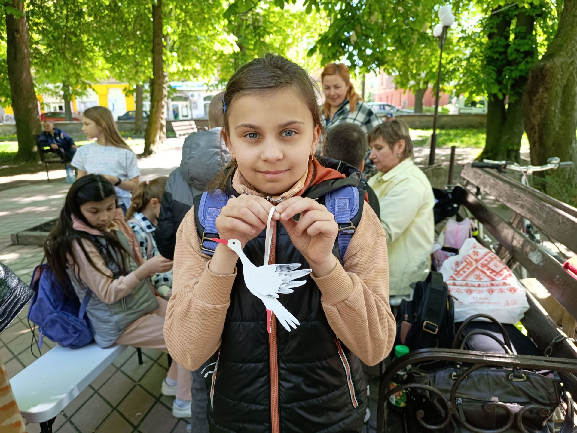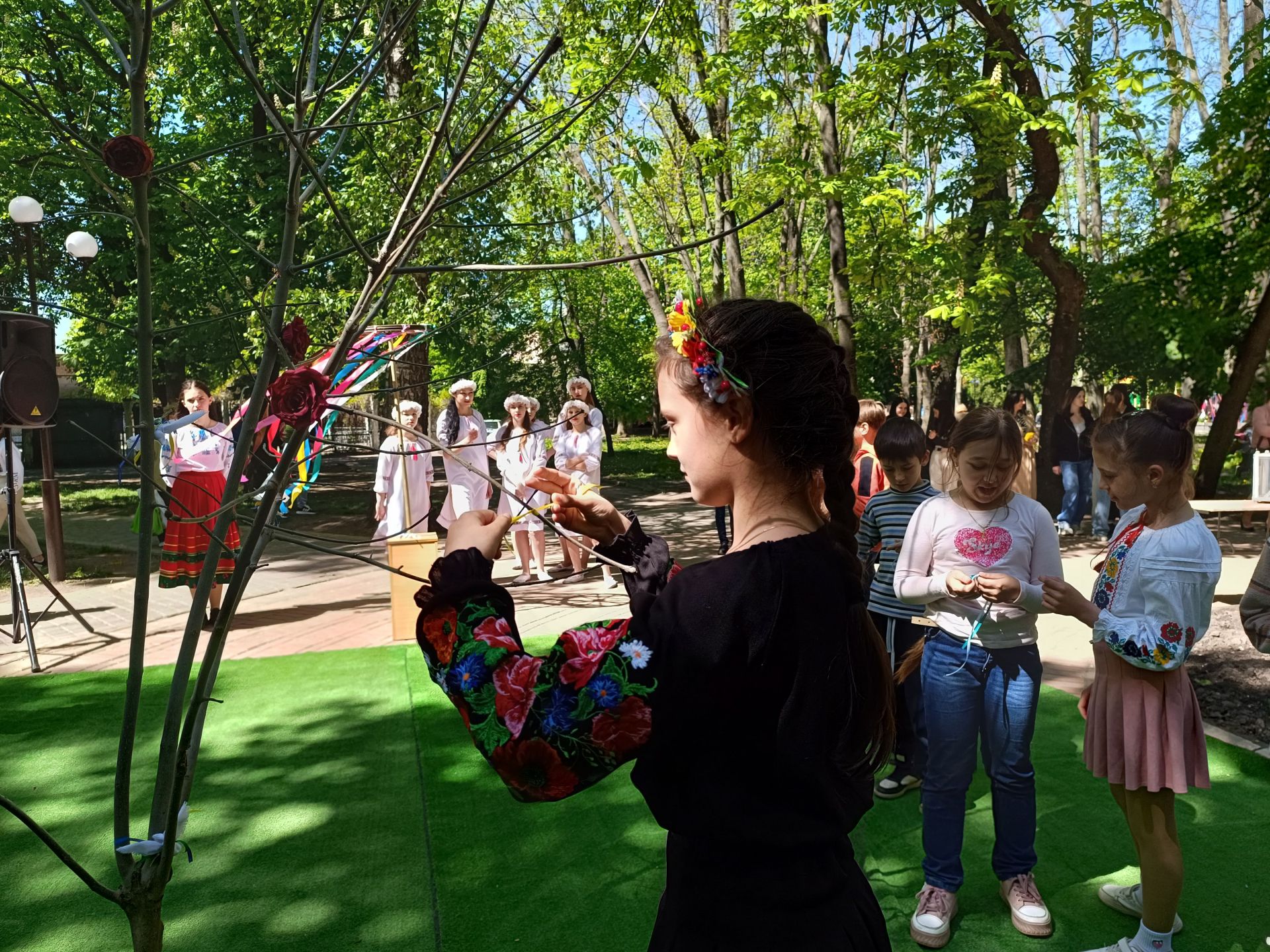 На алеї скверу облаштували локацію, де юним гостям фестивалю показували, як робити веселиків. Майстер-клас провела керівник гуртка «Сувенір» Центру дитячої та юнацької творчості Світлана Гуменюк. На столі перед майстринею — заготовки майбутньої пташки: тулуб та крила на клейовій основі. Хлопчики з дівчатками робили пташку. А щоб її зручно було тримати у руках, Світлана за допомогою дироколу робила у голові пташки отвір, аби продіти туди стрічку.