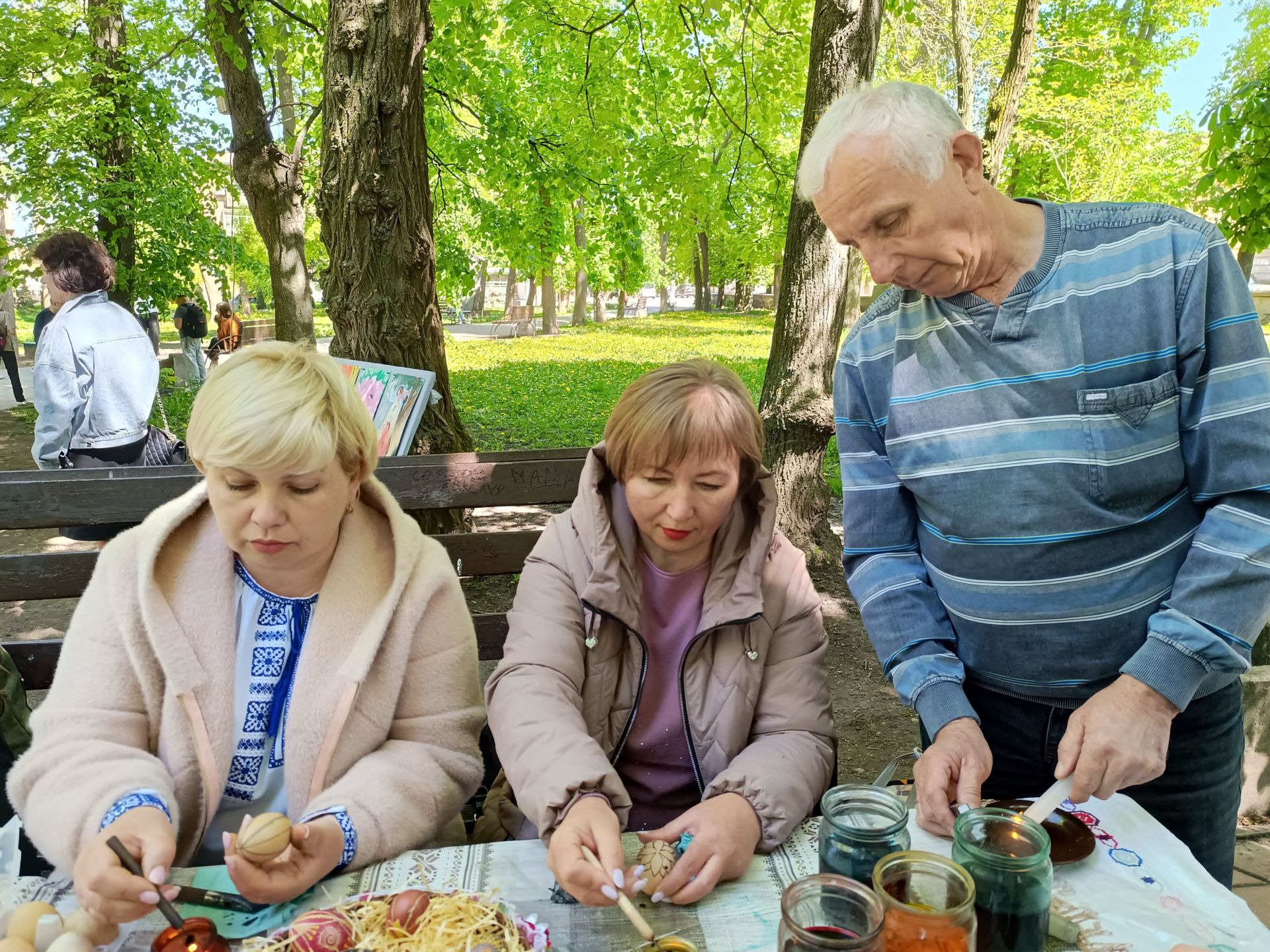 За столиком навпроти ще одна цікава локація, де проводять майстер-клас із писанкарства. Учасники обирають собі орнамент, який писатимуть на писанці, а тоді беруться до роботи. Спочатку олівцем роблять ескіз візерунку, а вже тоді за допомогою писачка наносять віск і фарбують шкаралупу.