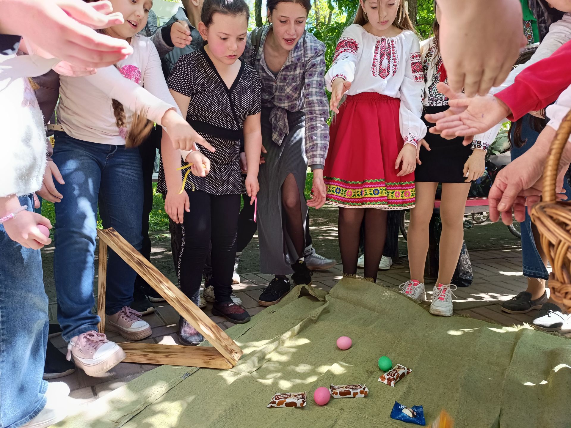 Ще одна весела гра, у яку грали юні гості Гаївок — «Катання яєць». Для цього у якості реквізиту використали дерев’яний каток. Директорка Музею історії міста Лілія Макаревич розклала цукерки і пустила з катка крашанку.