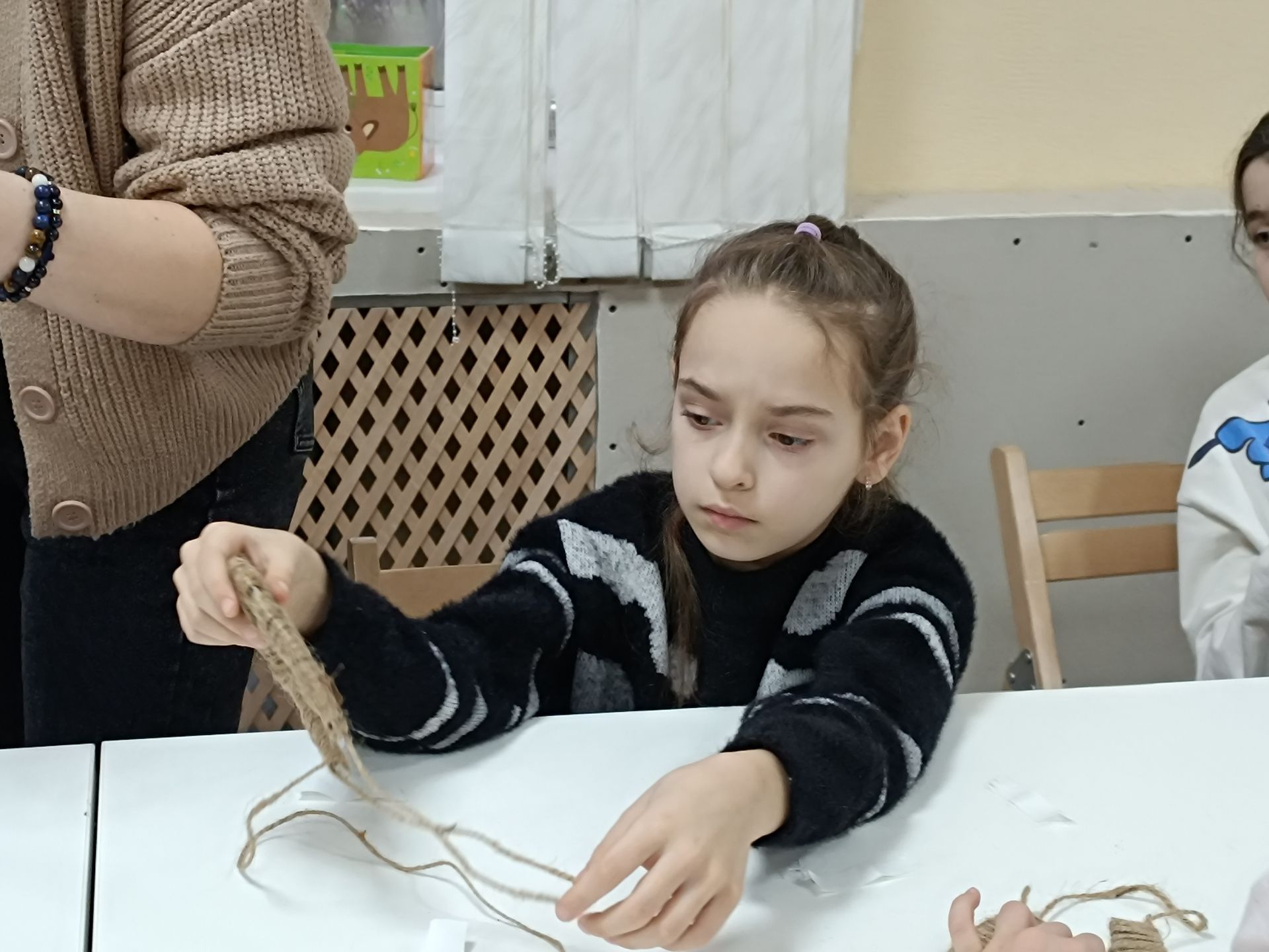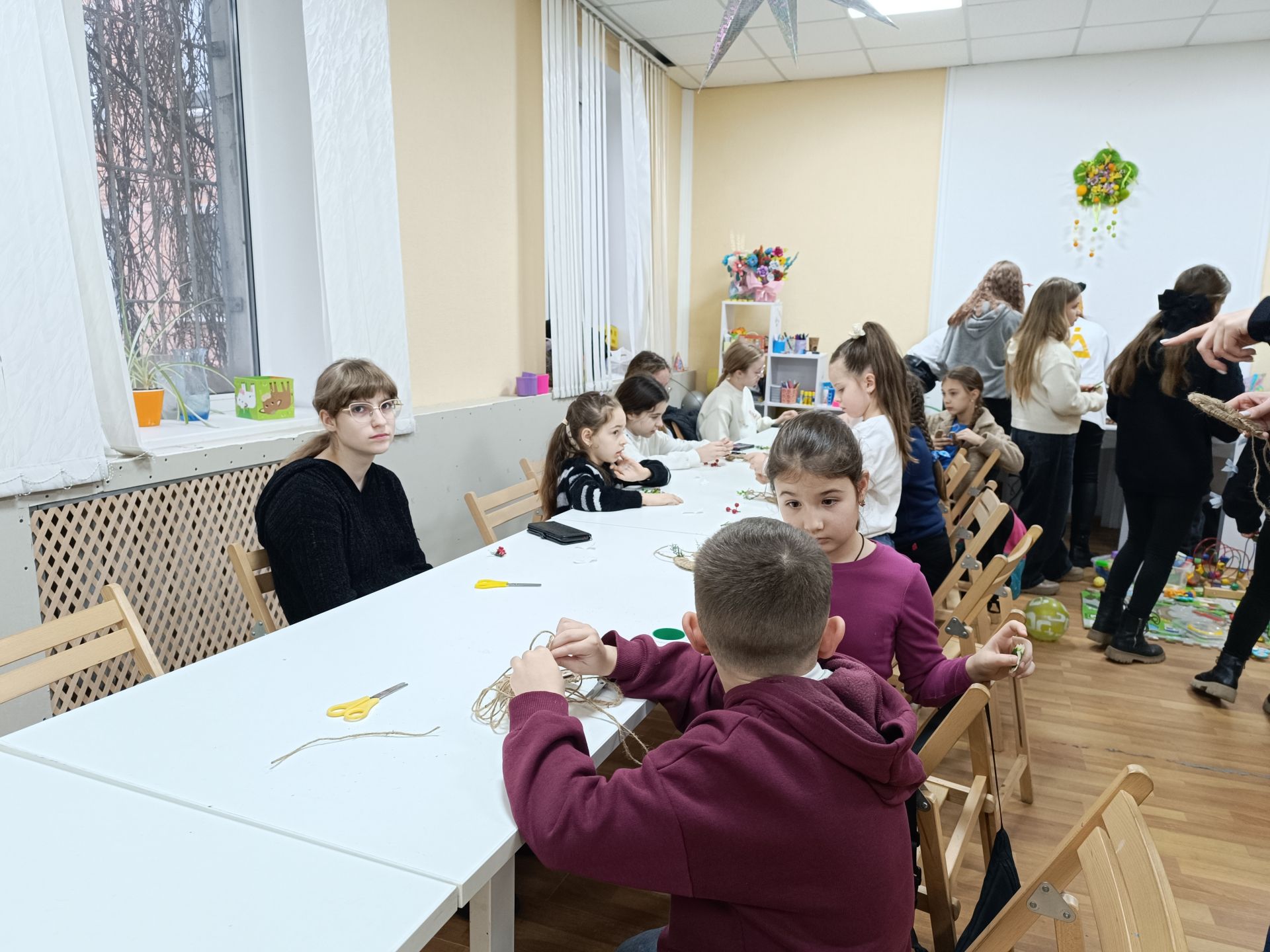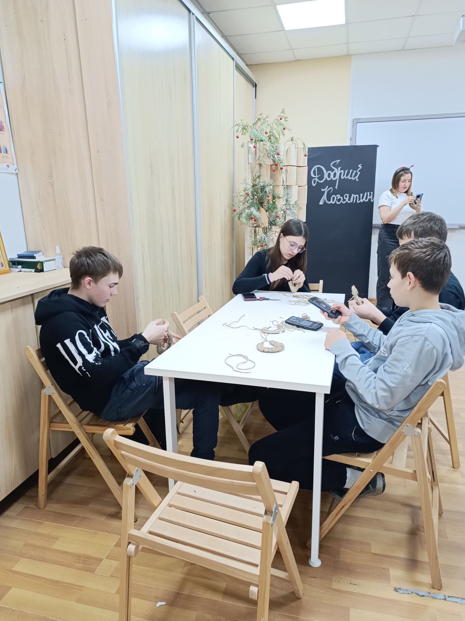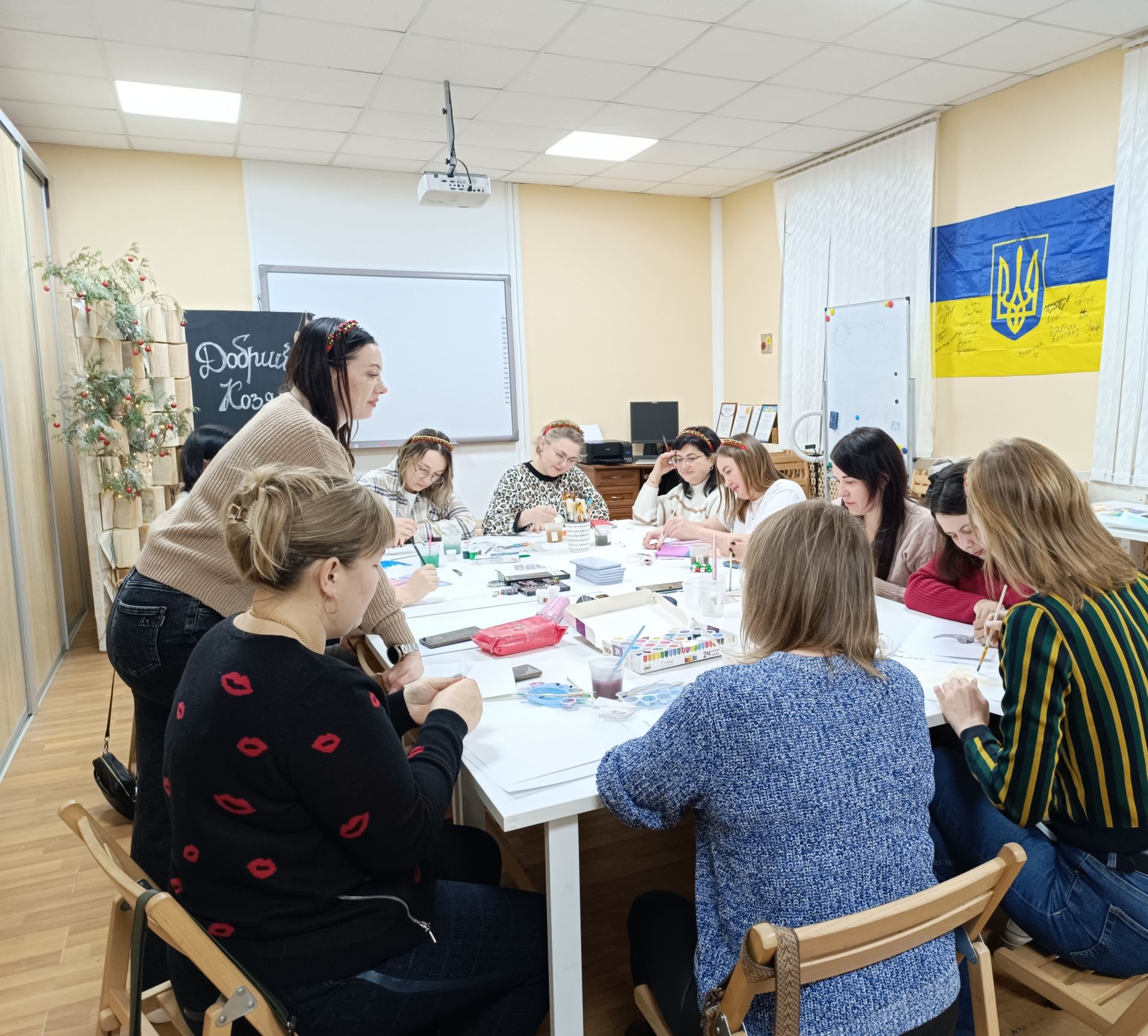 Наступний майстер-клас — Різдвяна підкова. Спершу картонну основу обмотують джутовим шпагатом, а потім волонтери допомагають приклеїти ягоди, гілочки та листочки. Настя зі своїм завданням вже впоралася.
