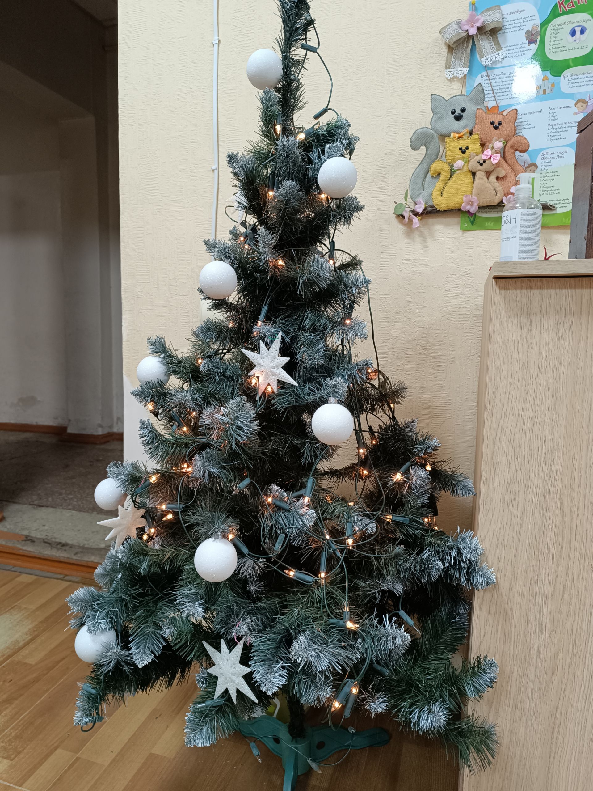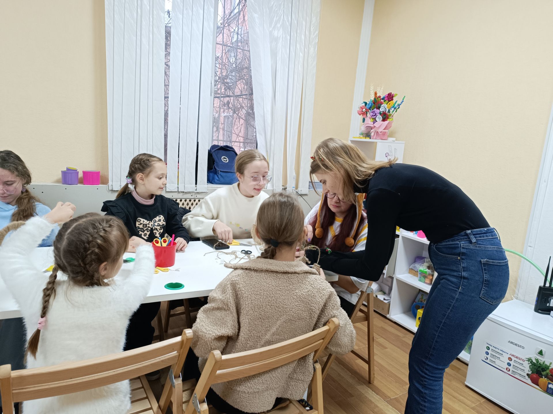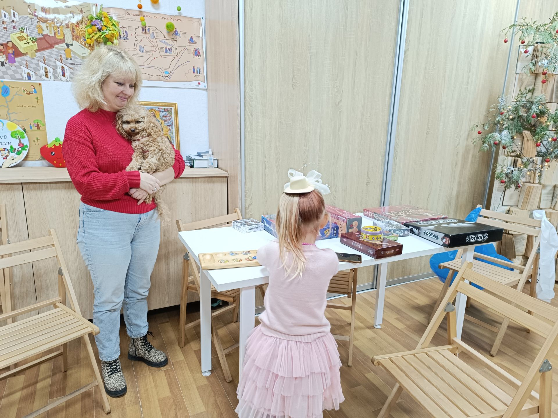Почали з «Різдвяного коника». За столиком волонтерки Інна Гончаренко, Марія Линник та Віка Гонтар допомагають дітям виготовити різдвяного коника з паперу. Хлопчики з дівчатками прикрашають своїх коників різнокольоровими блискітками, крихітними ялинками, сніжинками та малюнками.