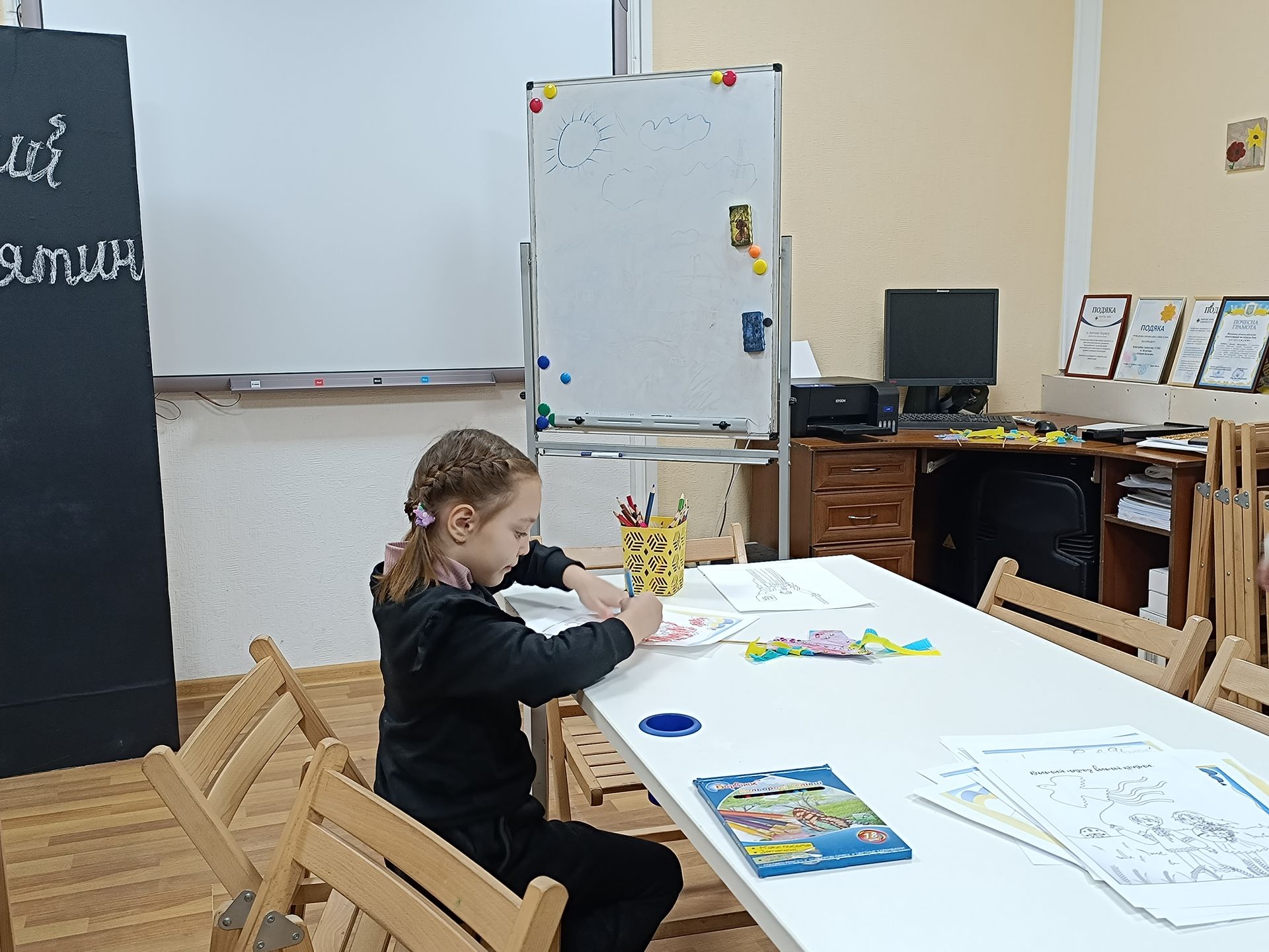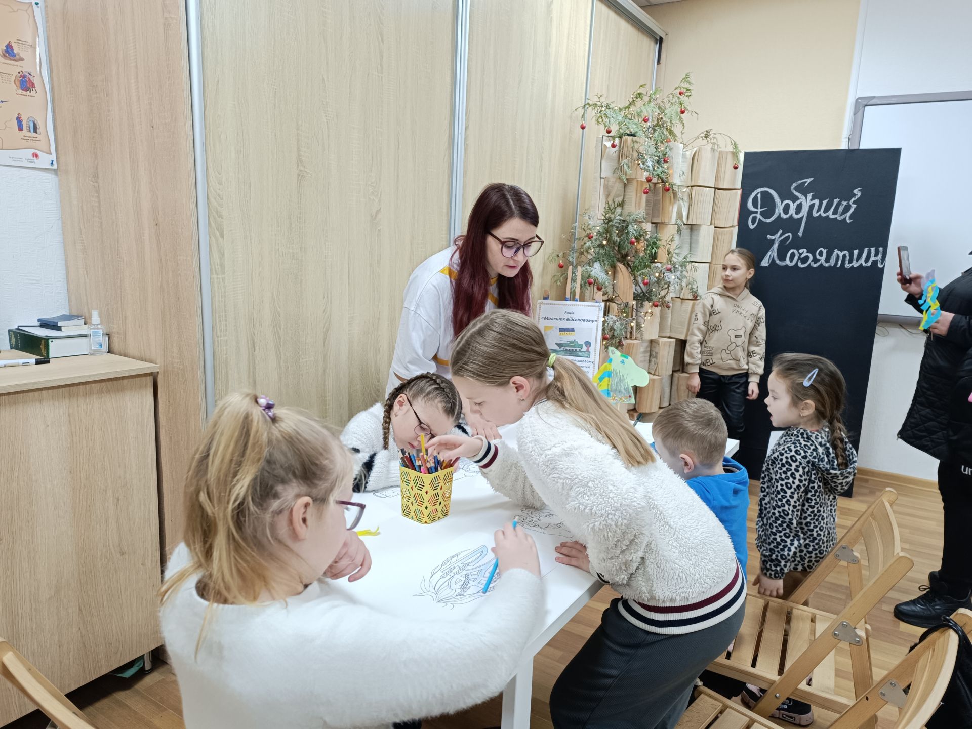 Тим часом за столиком навпроти триває акція «Малюнок військовому». Хлопчики та дівчатка розфарбовують олівцями патріотичні розмальовки для захисників на фронті і в шпиталі. Допомагає і дає підказки волонтерка Олена Чупрова.