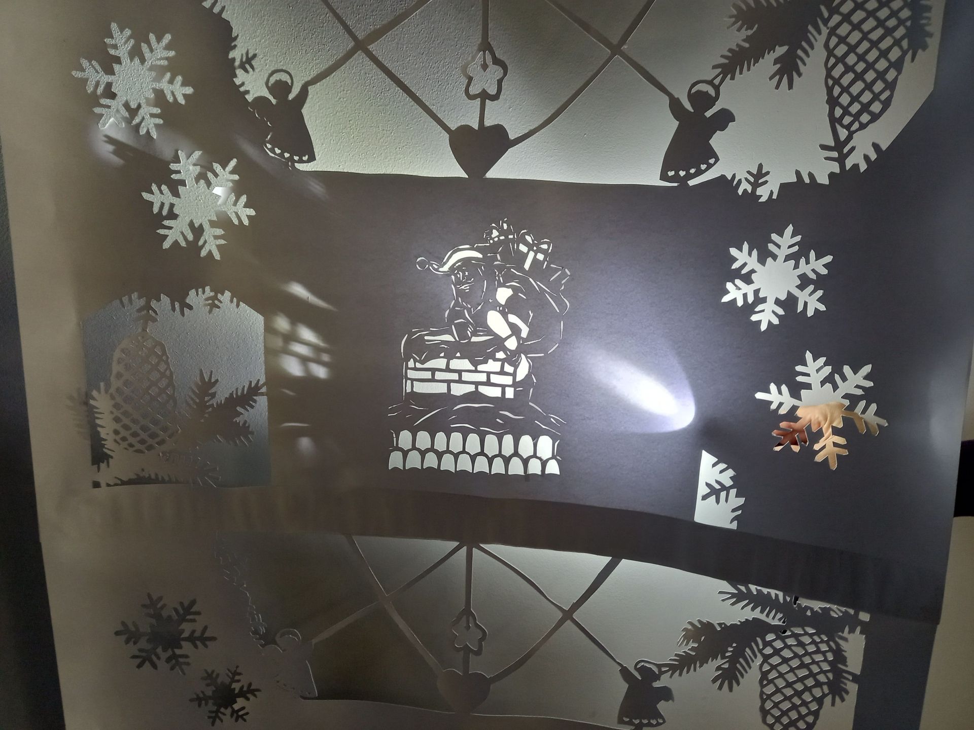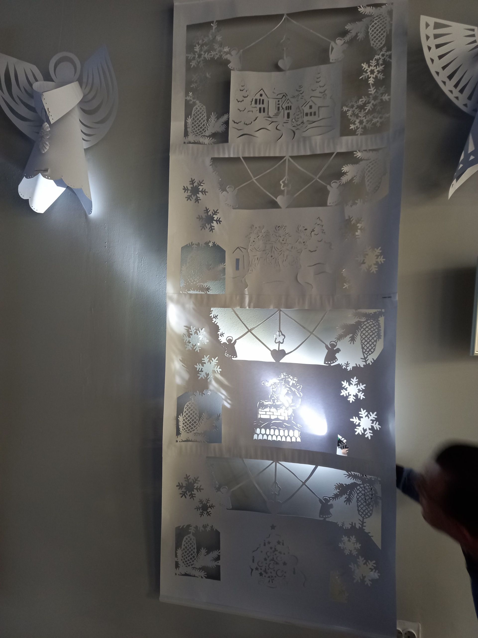 Долучилася до проєкту також авторка цієї статті. Моя витинанка розповідає історію про те, як Санта-Клаус поспішає до чемних діточок із подарунками під ялинку.