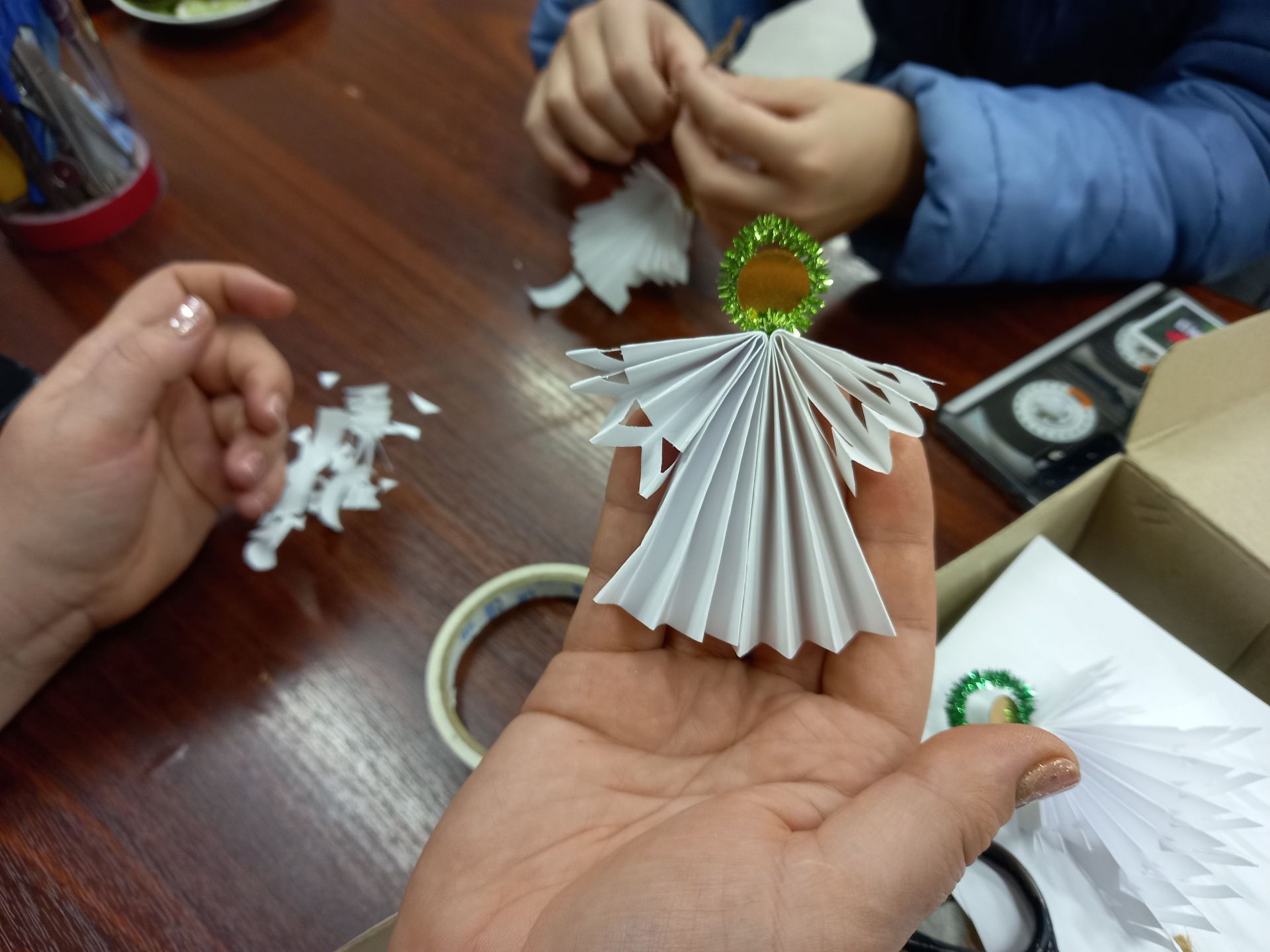 Основа для такого янгола — декоративна проволока, паєтка та папір. Паєтку Олена прикріплює до проволки, закручує і виходить голова та німб. Завдання Єгора, який прийшов на майстер-клас — зробити тіло янгола. Для цього із двох однакових половинок паперу треба зробити віяла. Аби вони вийшли рівними, майстриня ділиться невеликим секретом.