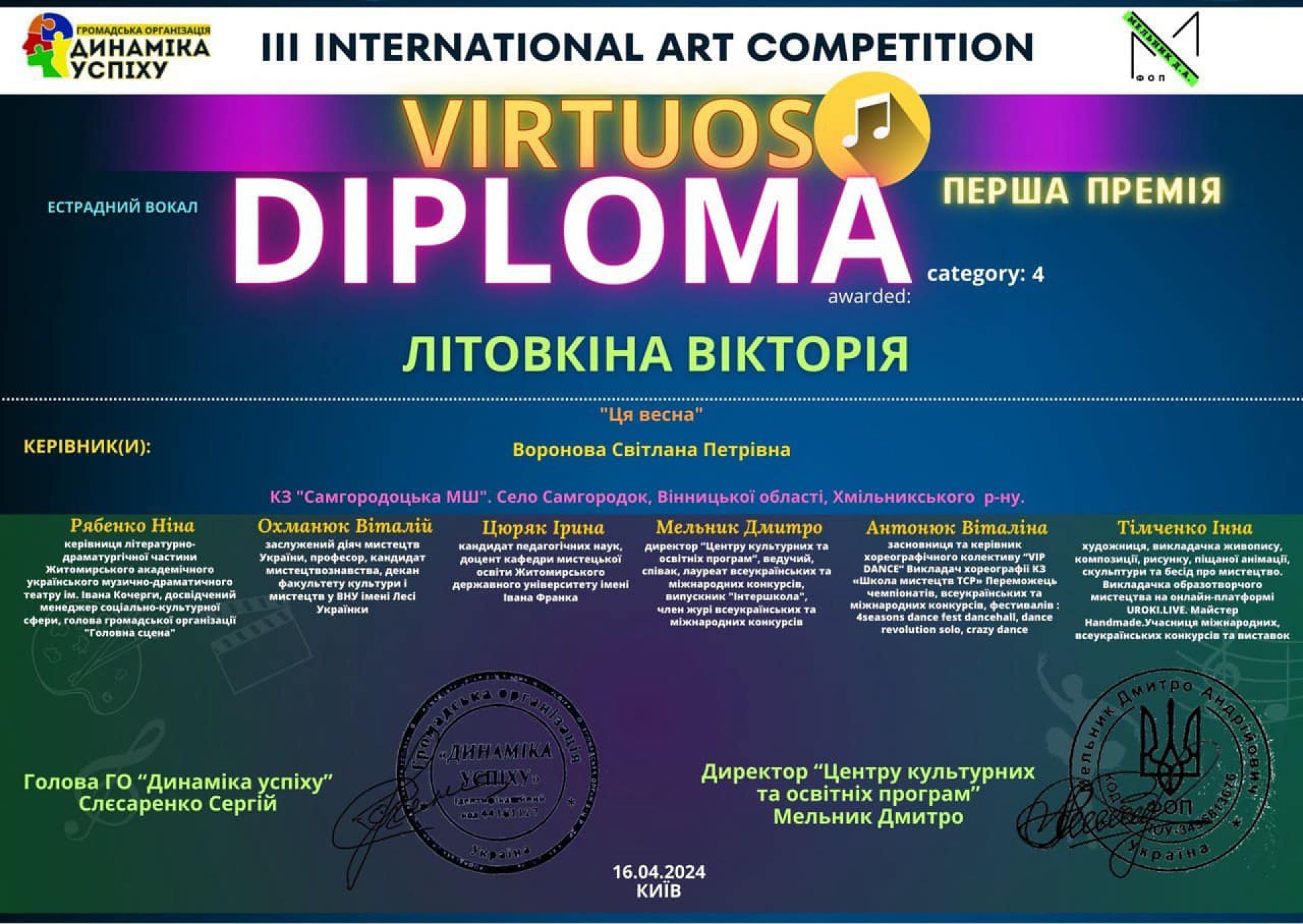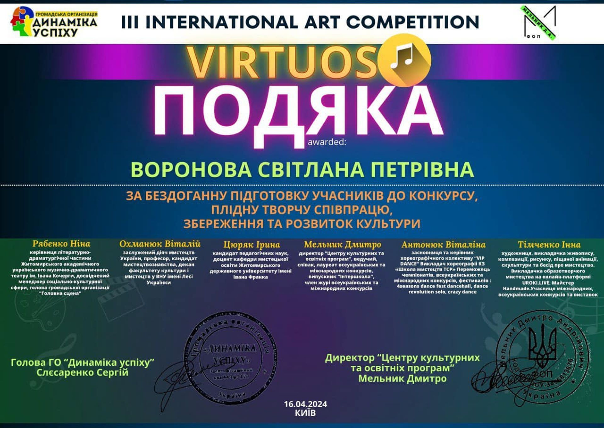 Учні стали лауреатами першої премії у III Міжнародному конкурсі мистецтв «VIRTUOS» (16.04.2024 м. Київ).