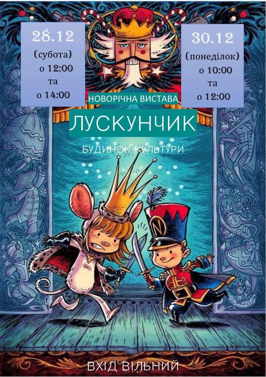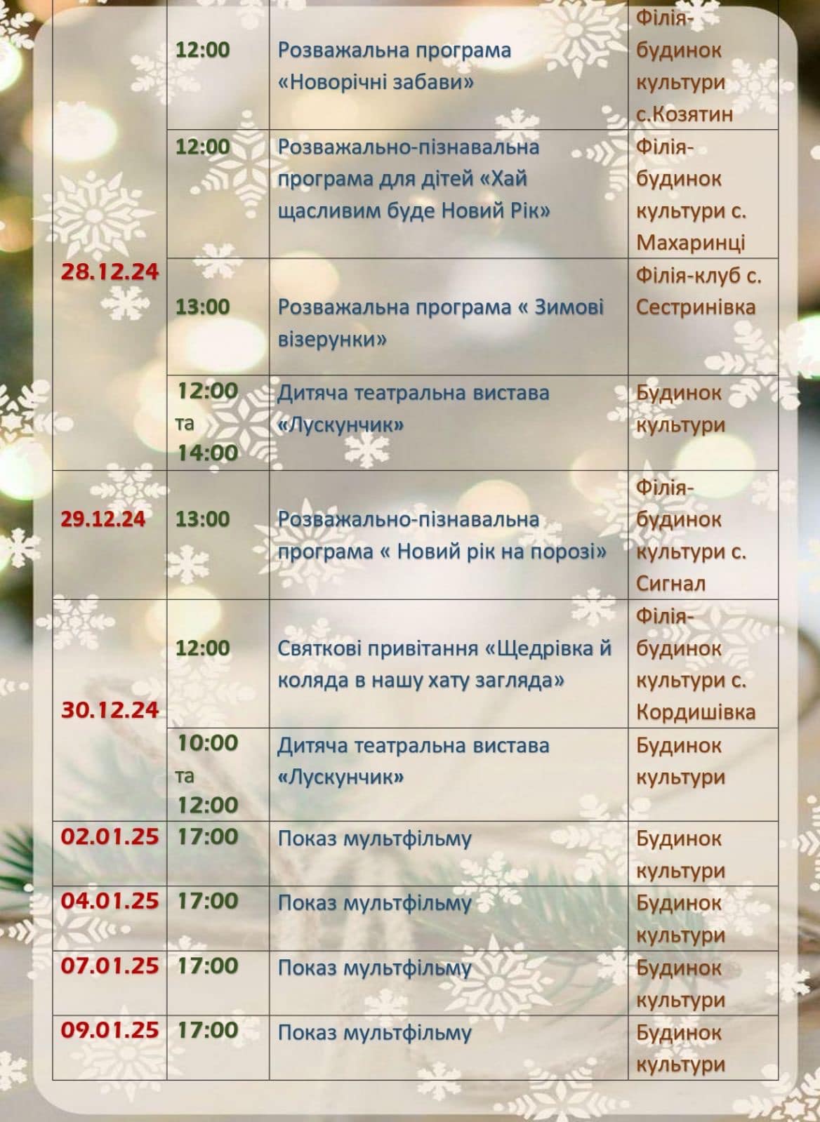 30 грудня у Кордишівському будинку культури на 12:00 відбудуться святкові привітання «Щедрівка й колядау нашу хату загляда», а у Козятинському будинку культури цього ж дня о 10:00 та 12:00 ще раз показуватимуть дитячу-театральну виставу «Лускунчик».