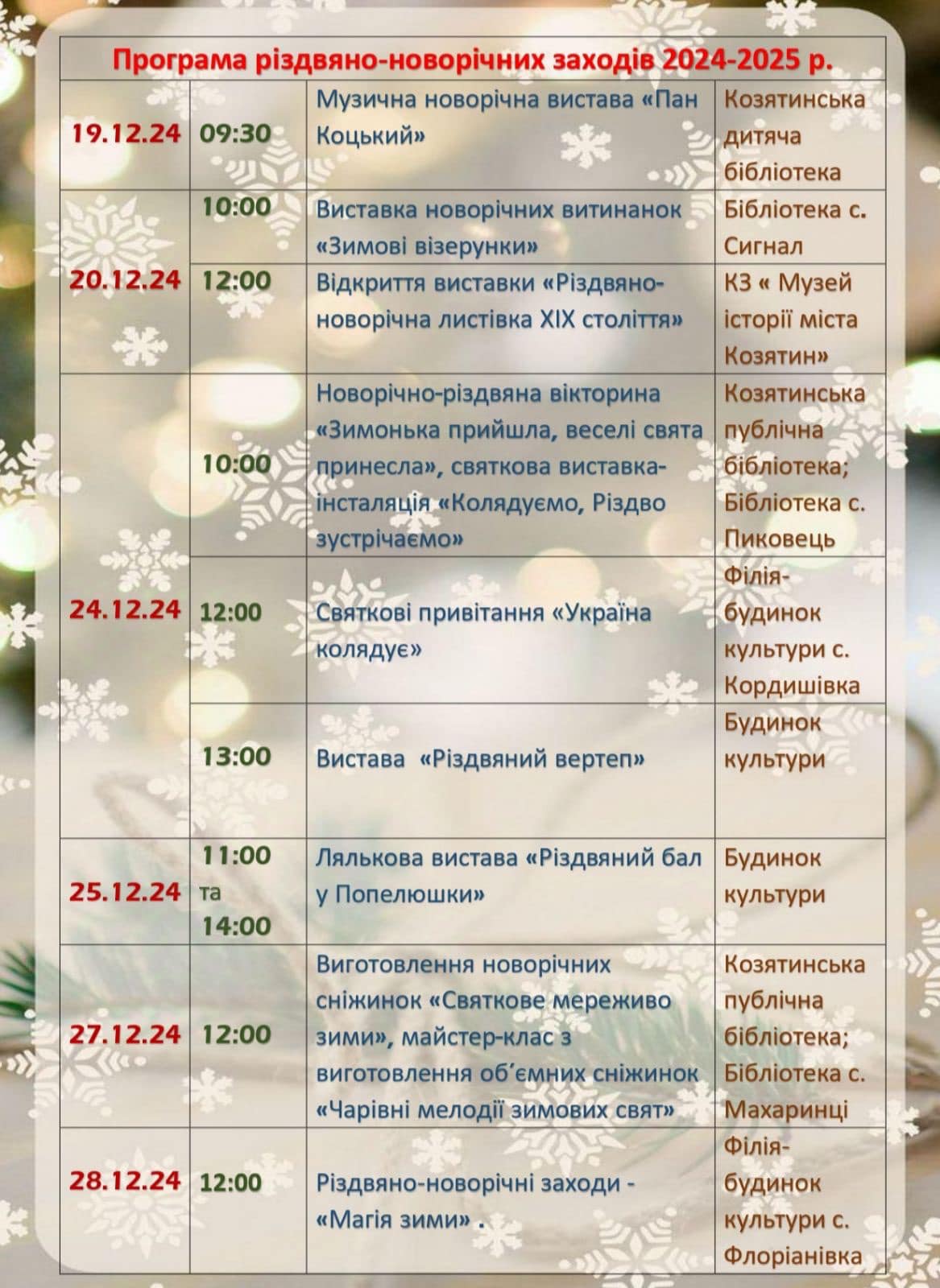 У Культурі Козятинської громади опублікували програму різдвяно-новорічних заходів.