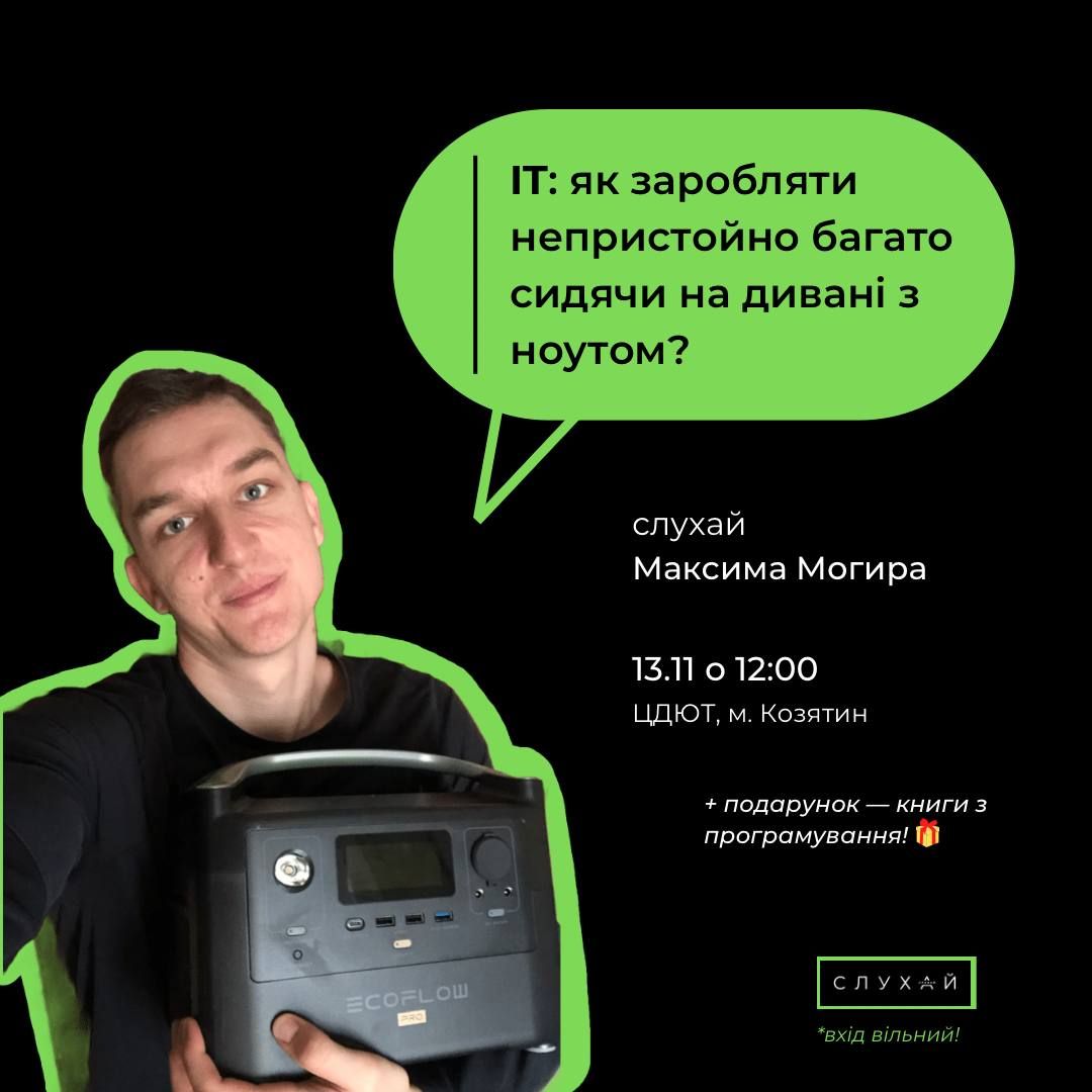 - Максим Могир, спеціаліст зі сфери ІТ, розкаже як заробляти непристойно багато сидячи на дивані з ноутом (12.00)