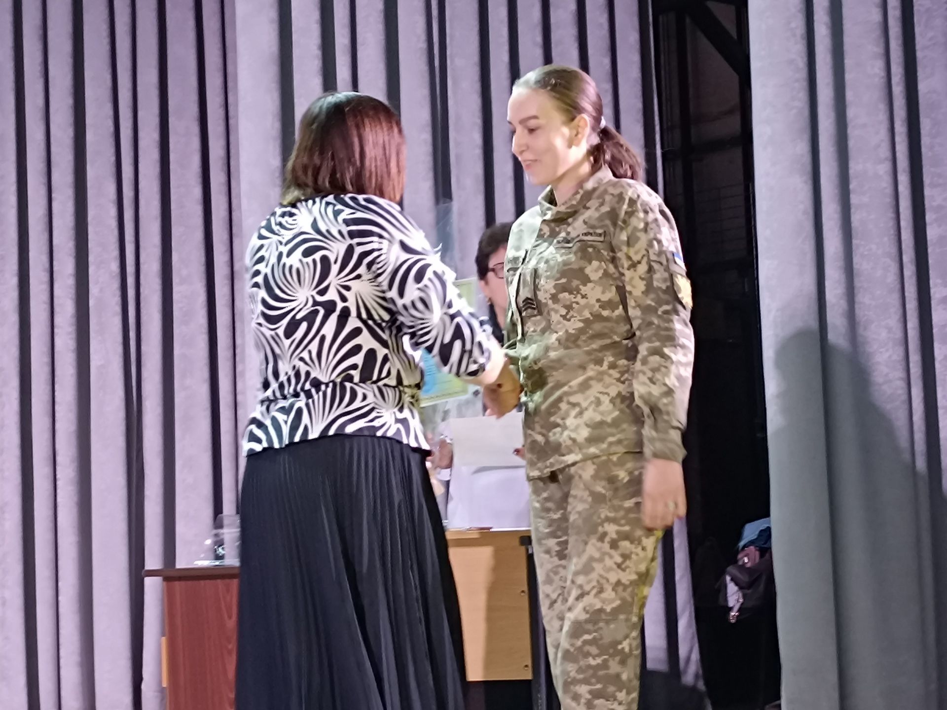 — Із кожним днем нас все більше і більше оточують військові, — знову взяла слово ведуча Лариса Ромасько. — Хтось приїхав побачити новонародженого сина, хтось провідати батьків, хтось освідчитися у коханні, у когось завдання. Більшість з нас хочуть підійти до них, усміхнутися, запропонувати свою допомогу, подякувати їм. Кожного хочеться обійняти і сказати добре слово, а ми чомусь соромимося. Я пропоную підтримати проект «Завдяки тобі». Якщо ми не знаємо, що робити, коли бачимо перед собою українського військового, просто кладемо долоню на серце. Таким чином ми висловлюємо всю свою вдячність та повагу до наших Героїв.