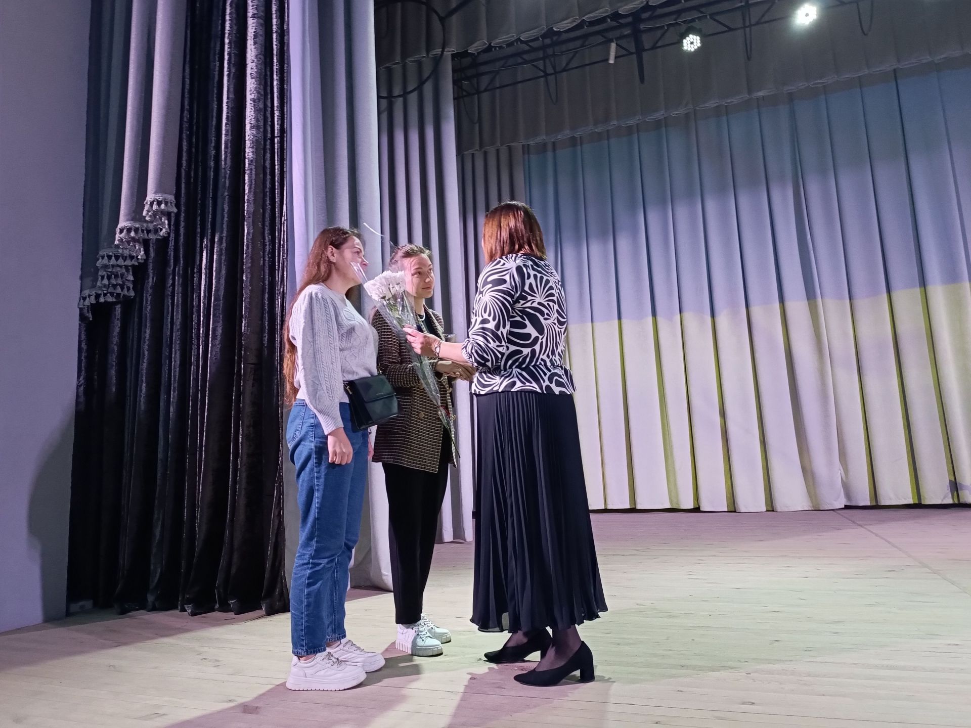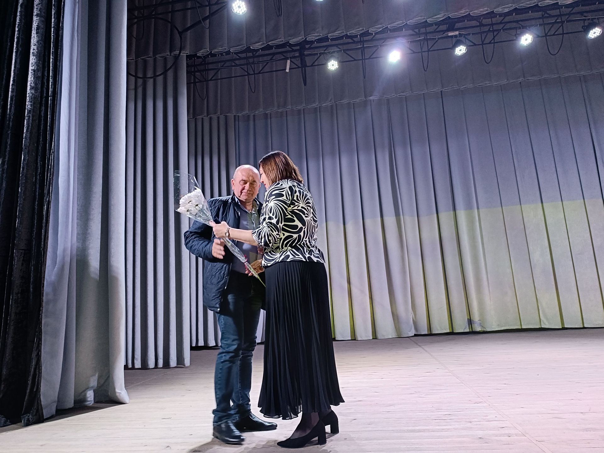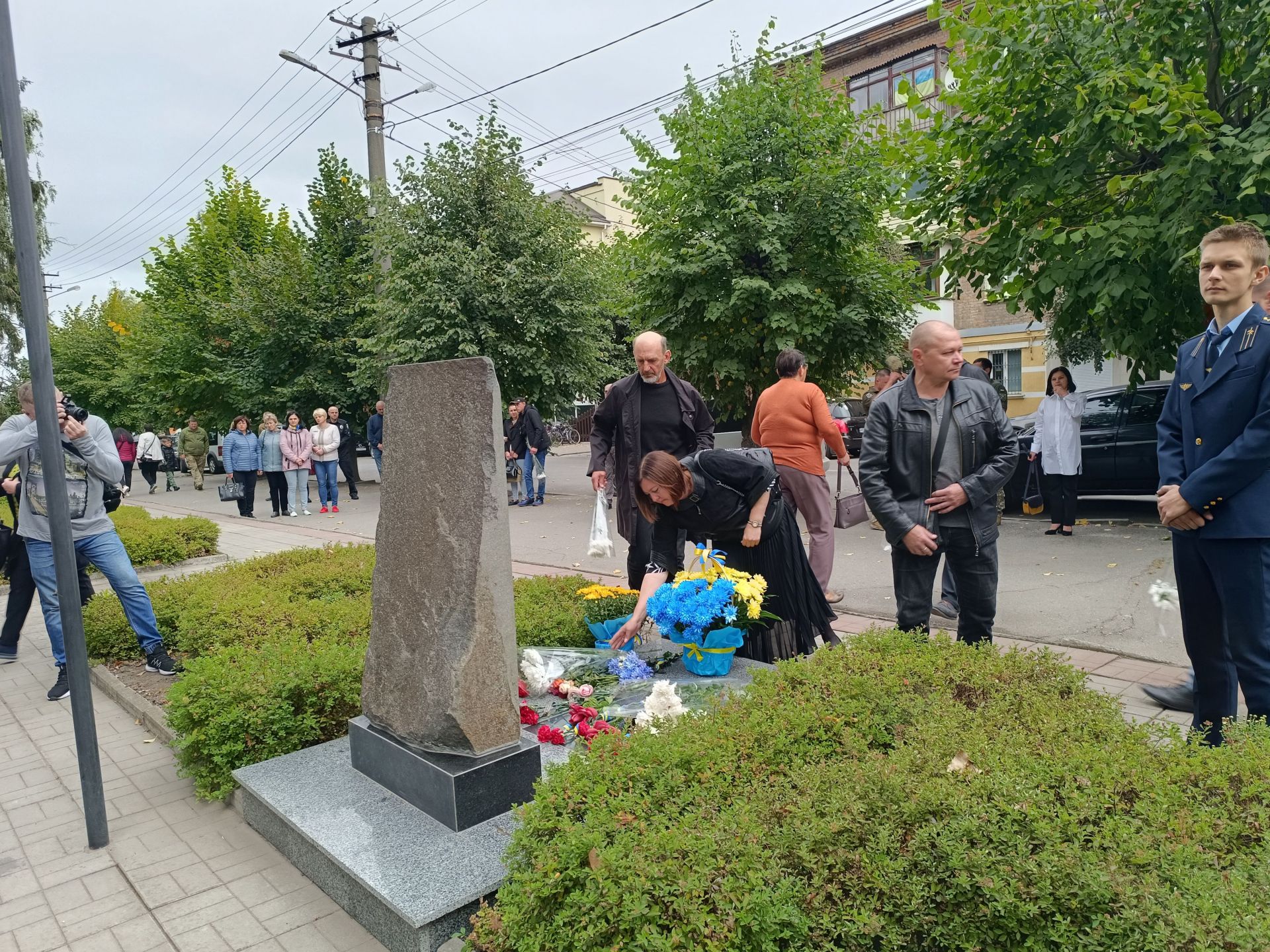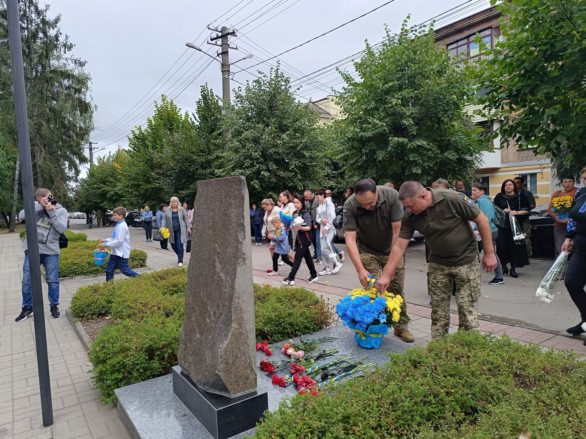 Глядачі вийшли з будинку культури і всі разом вирушили до пам’ятного знаку загиблим Героям. Вони поклали квіти до пам’ятника полеглим на війні і до дошки пам’яті.