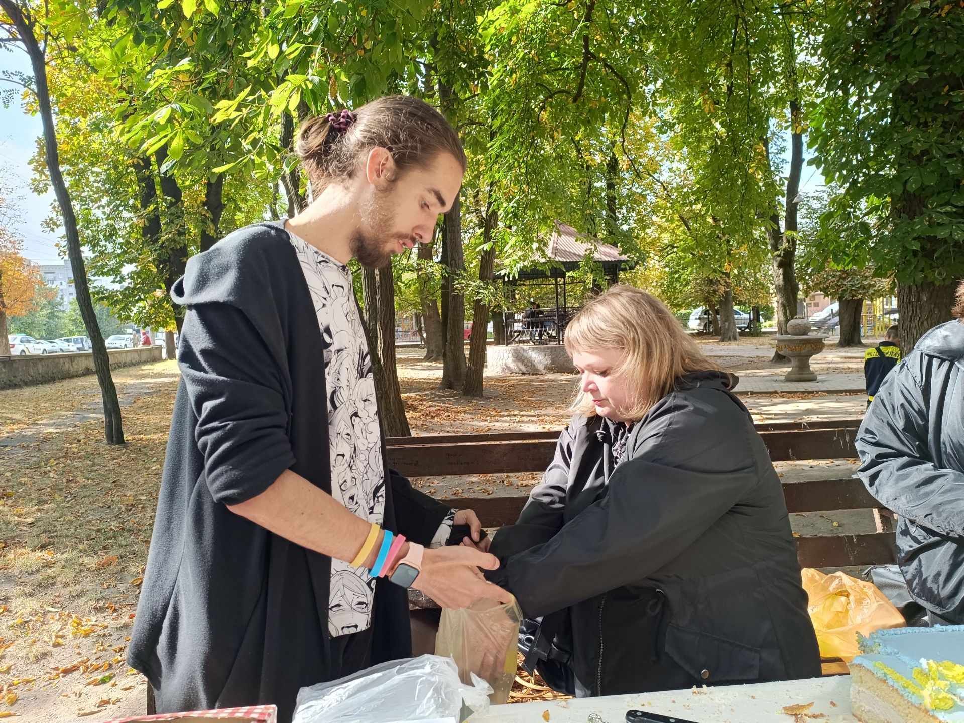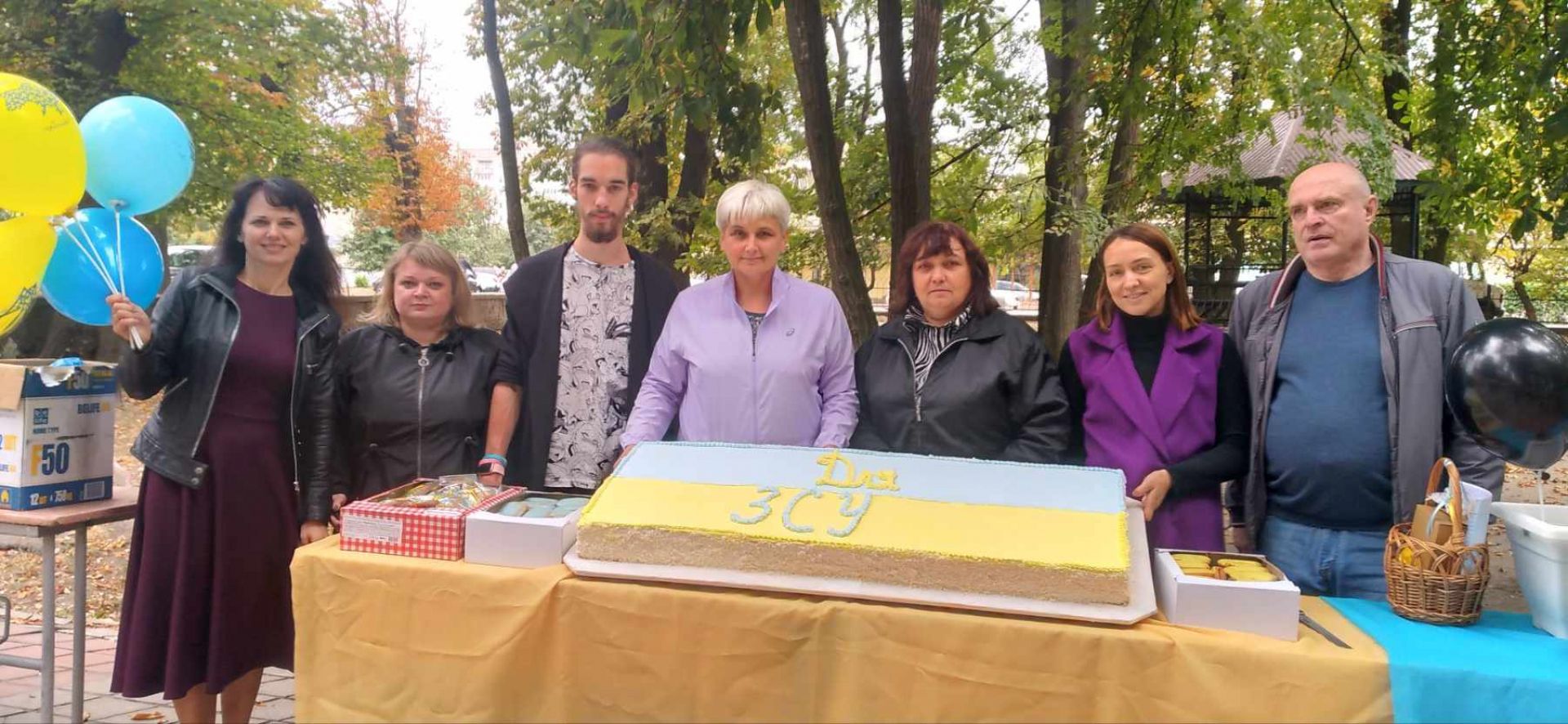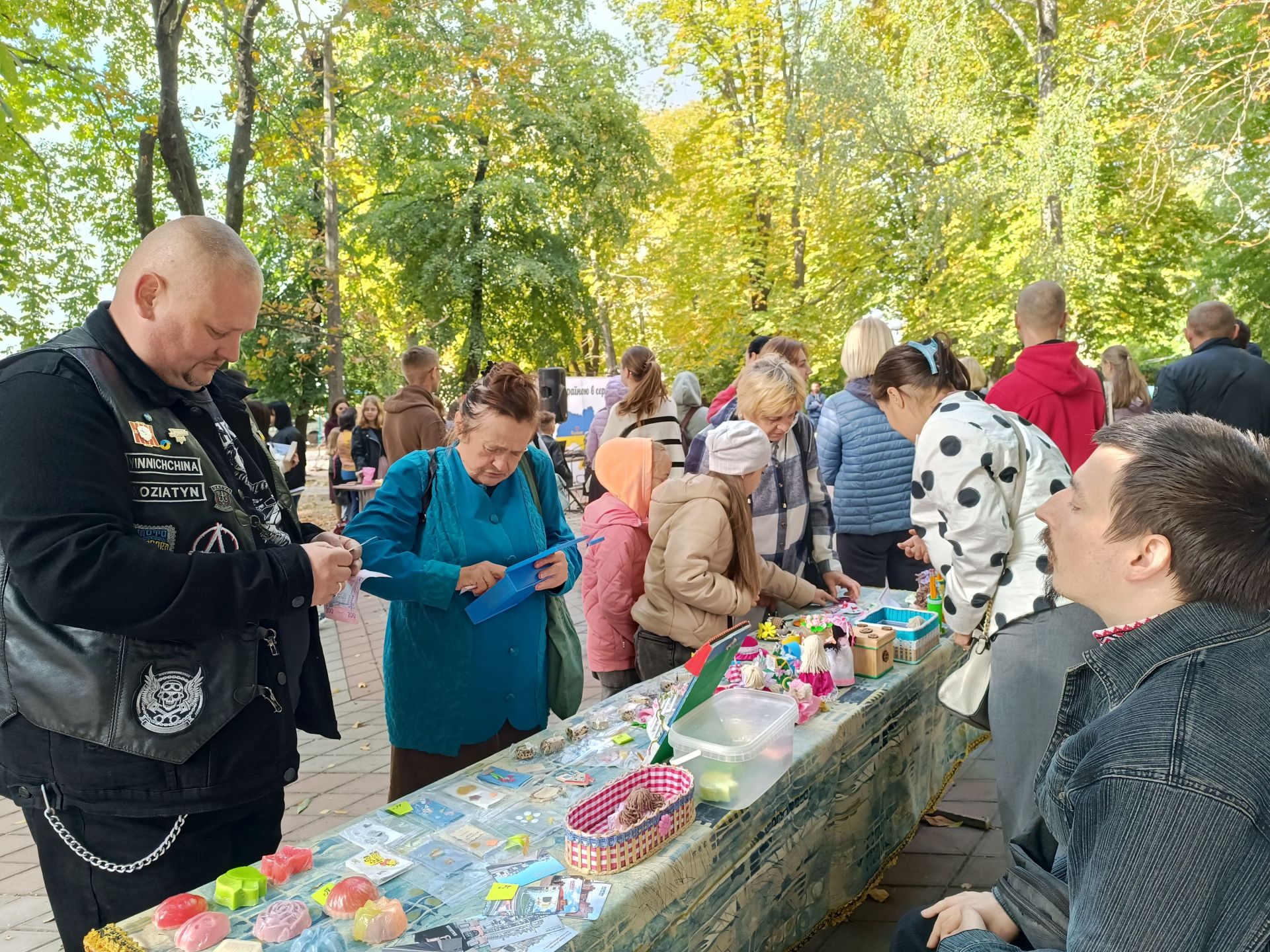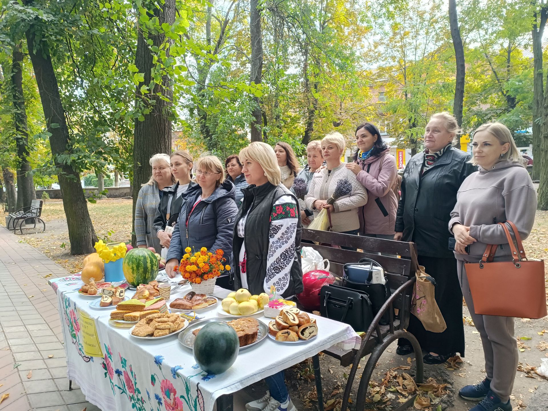 Тим часом у сквері завершили останні приготування до благодійного ярмарку. Тістечка, величезний торт у жовто-блакитних кольорах із написом «Для ЗСУ», желе та інші смаколики, гарбузи, сувеніри, обереги та іграшки запропонували гостям заходу. До ярмарку долучилися навчальні заклади громади, центр дитячої та юнацької творчості, громадська організація «Товариство батьків дітей з інвалідністю «Дом», родина Луцкових. Кожен куплений смаколик, оберіг чи сувенір — невеликий внесок у нашу спільну перемогу. Адже усі зароблені кошти, підуть на ЗСУ. Та не всі смаколики були за гроші — усіх охочих безкоштовно пригощали бутербродами із салом.