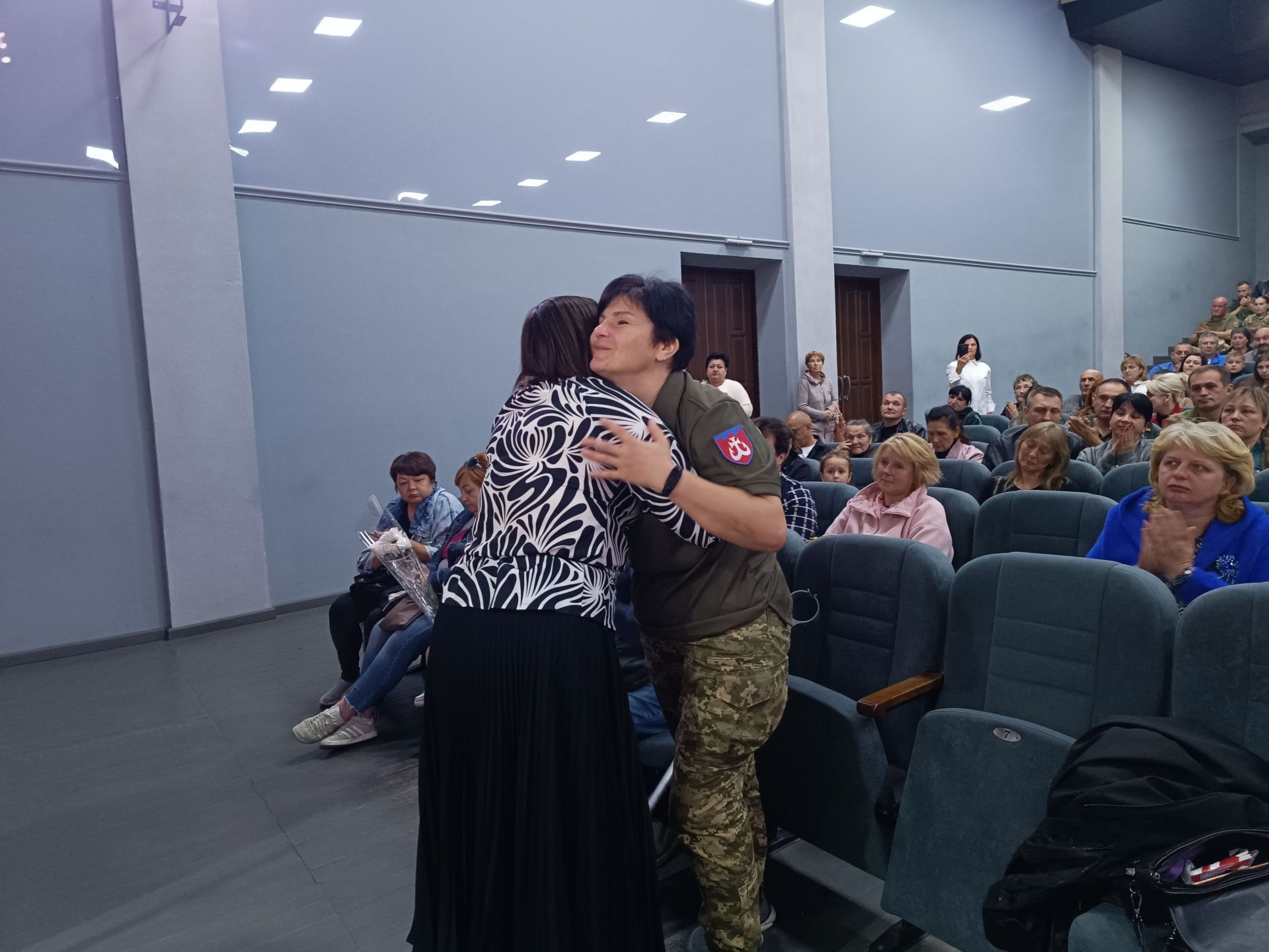Усіх, хто не причетний до військової служби, попросили підвестися. Глядачі поклали долоню на серце і подякували військовим за те, що світ не закінчився 24 лютого, що вони зупиняють вогонь і не дають спалити усіх, за кожну збиту ракету і приземлений дрон, за те, що оберігають кожну родину від «освобождєнія», за майбутню новину про Перемогу.
