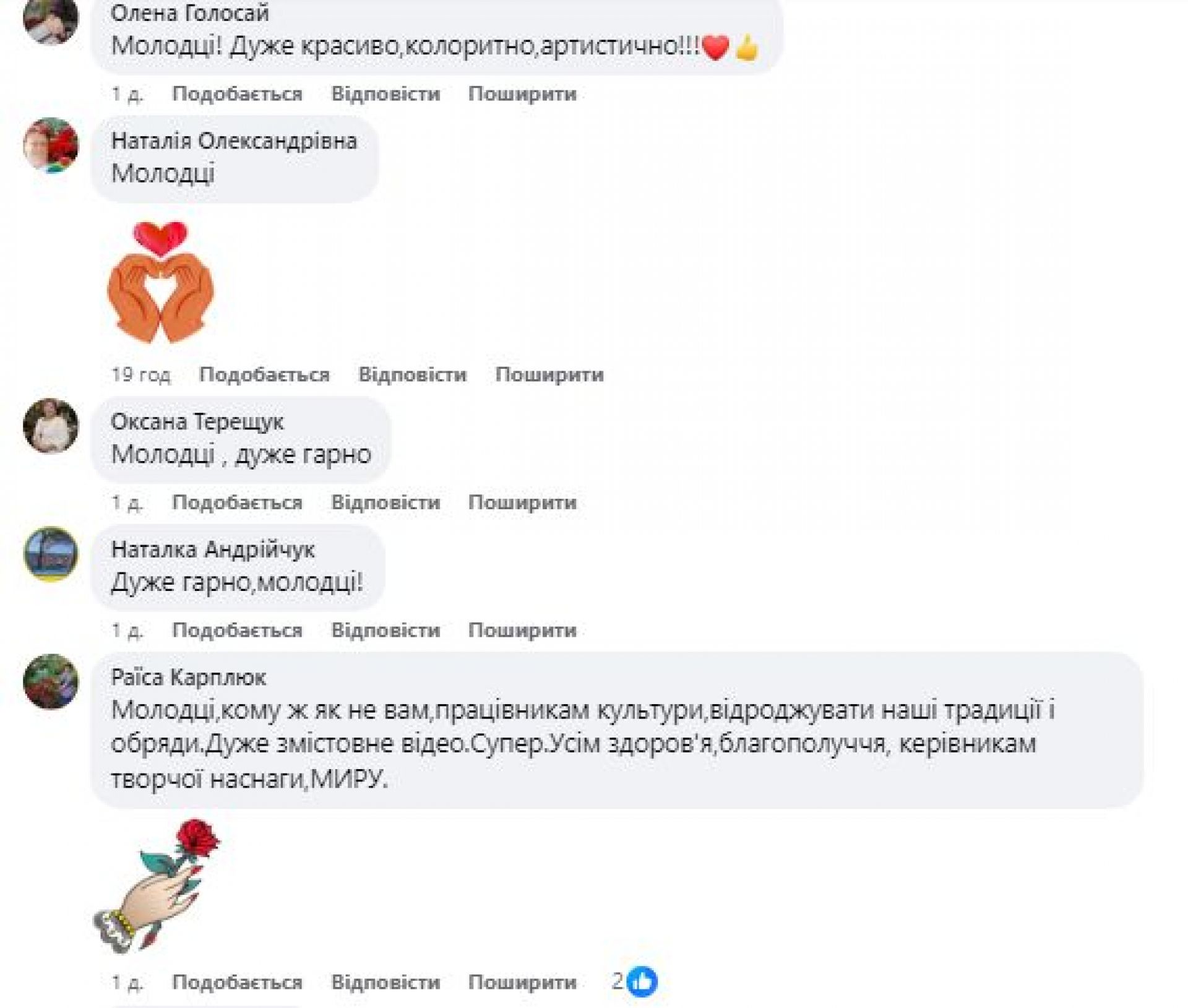 — Нематеріальна культурна спадщина — найголовніший інструмент збереження української нації. Позаду: пошукова робота, запис обряду, його відтворення, репетиції, зйомки. Дякуємо кожному, хто долучився до надзвичайної ініціативи, вклавши у відеороботу багато сил, умінь, таланту та старань, — пишуть у Самгородоцькому центрі культури і дозвілля