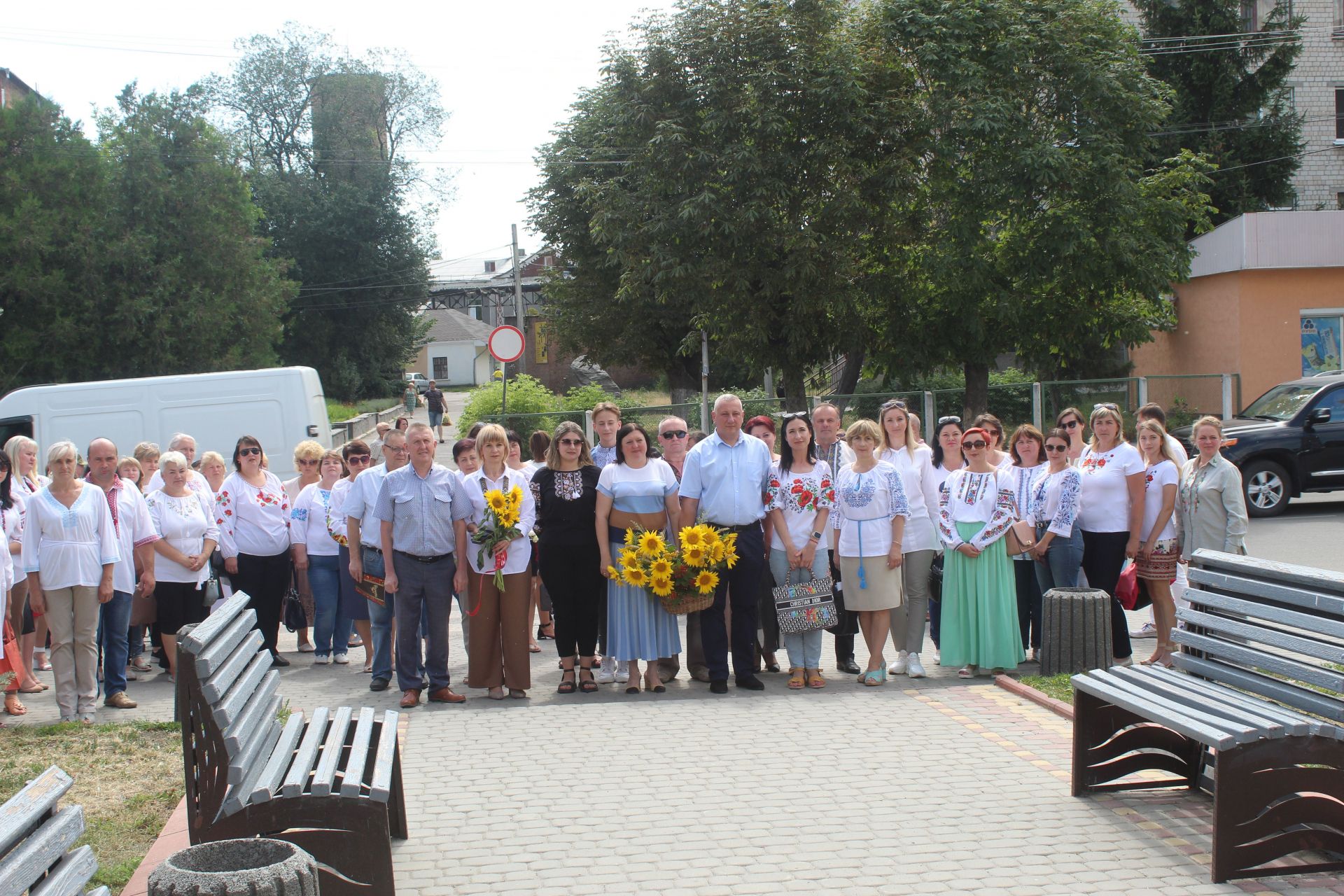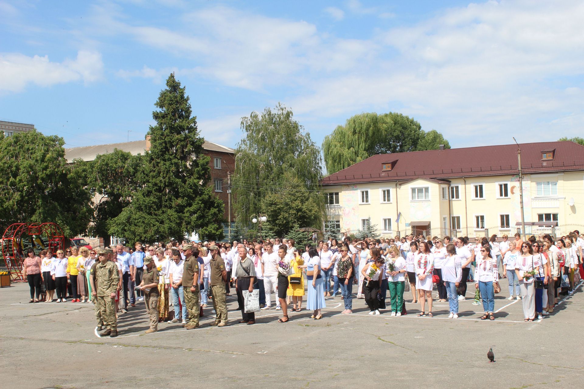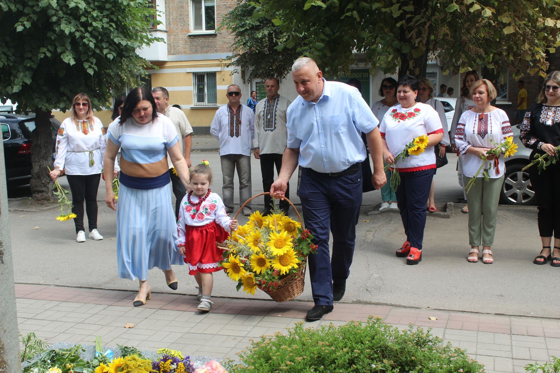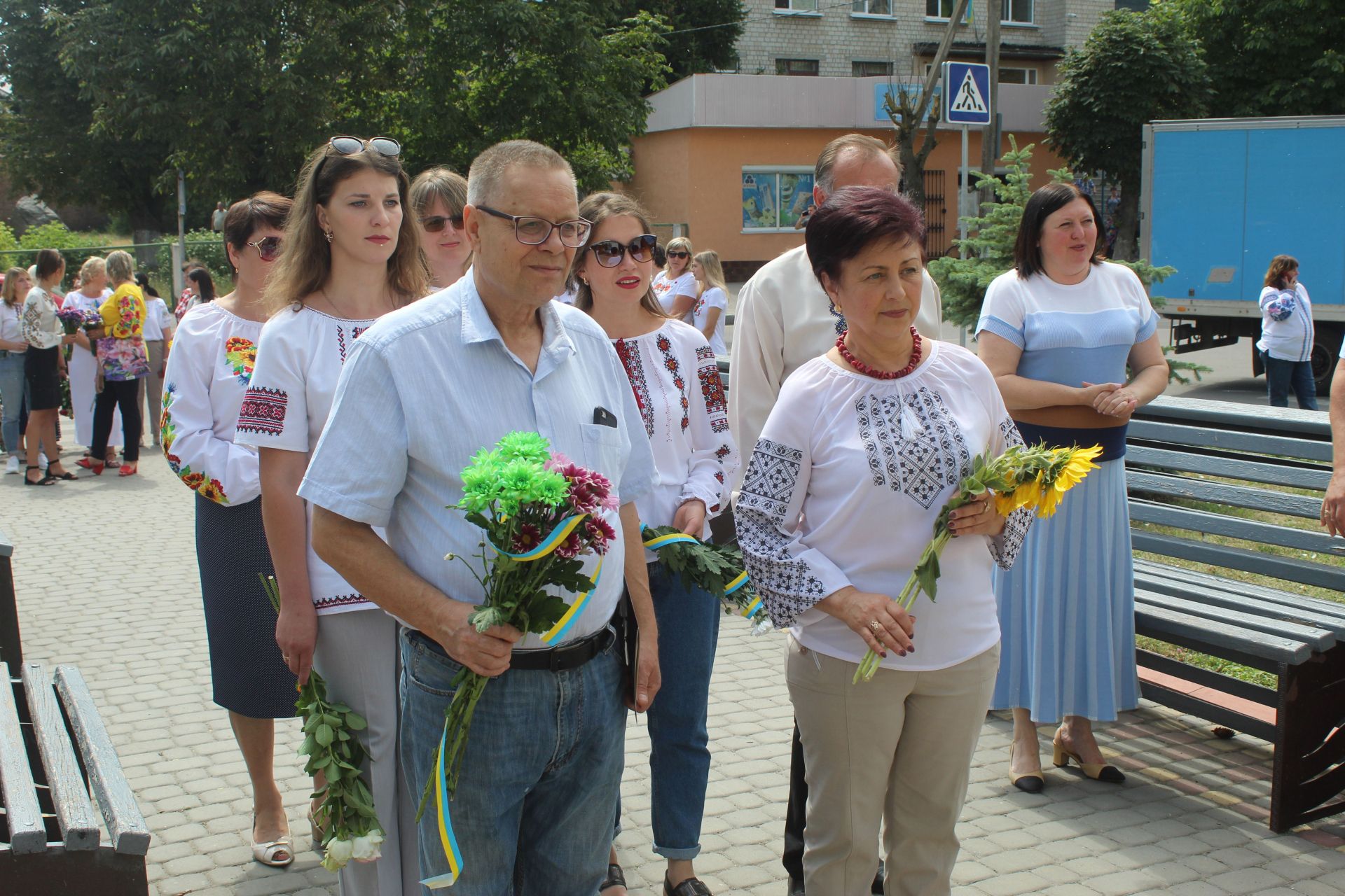 Міський голова Тетяна Єрмолаєва нагородила відзнаками військовослужбовців, які проявили себе з агресором на полі бою. Керівник Хмільницького району Юрій Слапчук виразив подяку представникам Козятинської громади. Ними стали директор залізничного училища Андрій Стецюк та керуюча справами виконкому Аліна Тимощук. Не обійшлося без пісні. Музичне вітання прозвучало від Тетяни Фабіцької. Після основної частини святкового заходу всі пішли на середину площі, де люди у вишиванках створили живий герб України.
