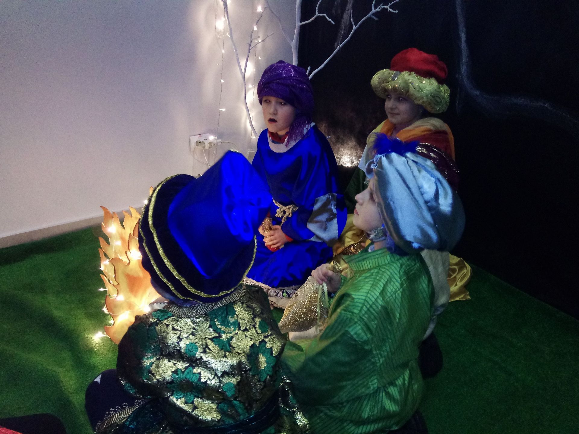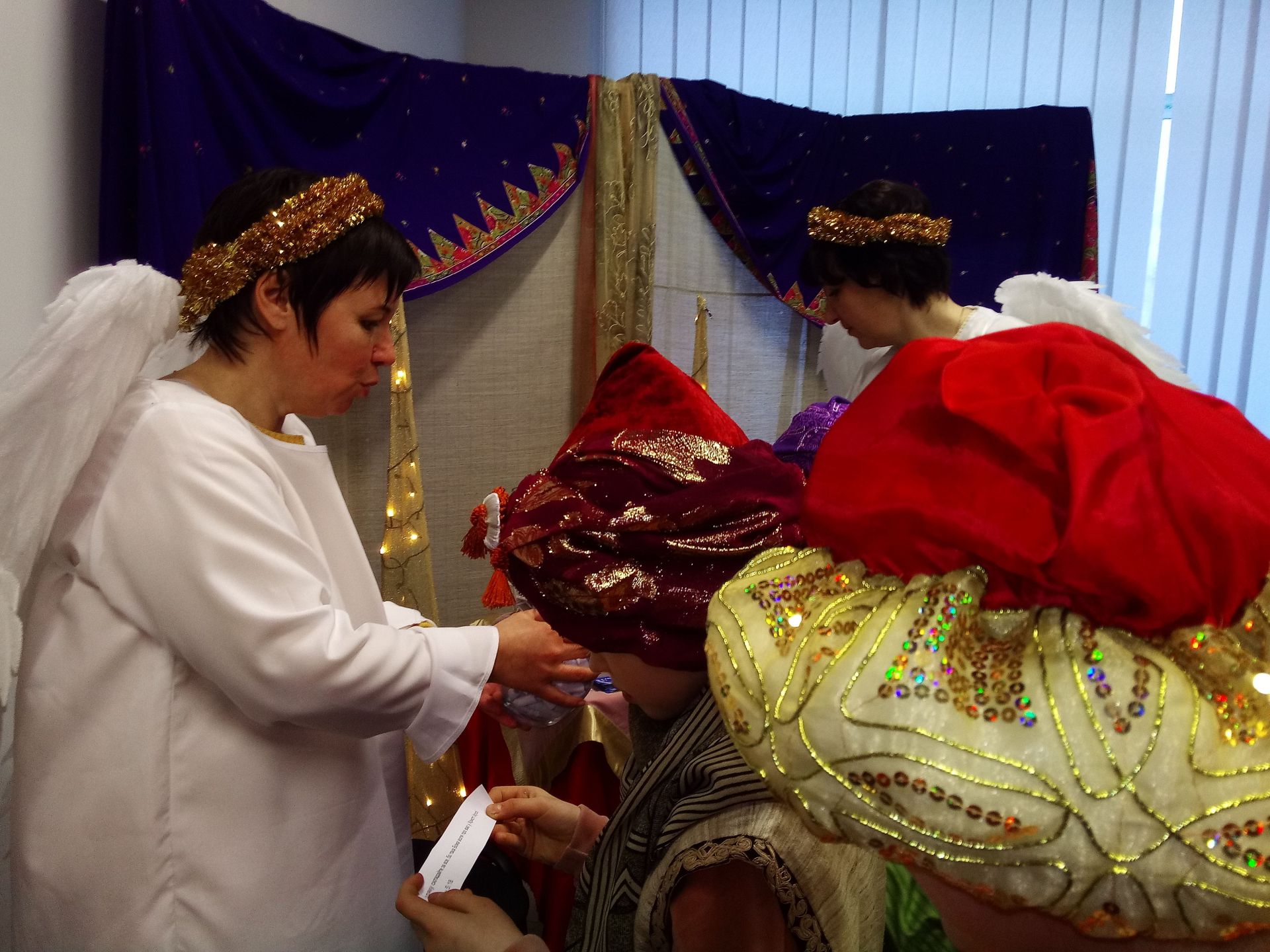 Біля виходу з кімнати на маленьких мудреців вже чекають три янгола. Вони тримають у руках ємності зі згортками паперу. Кожен глядач бере собі згорток. На ньому — слово Боже. Наостанок янголи благословляють юних мудреців.
