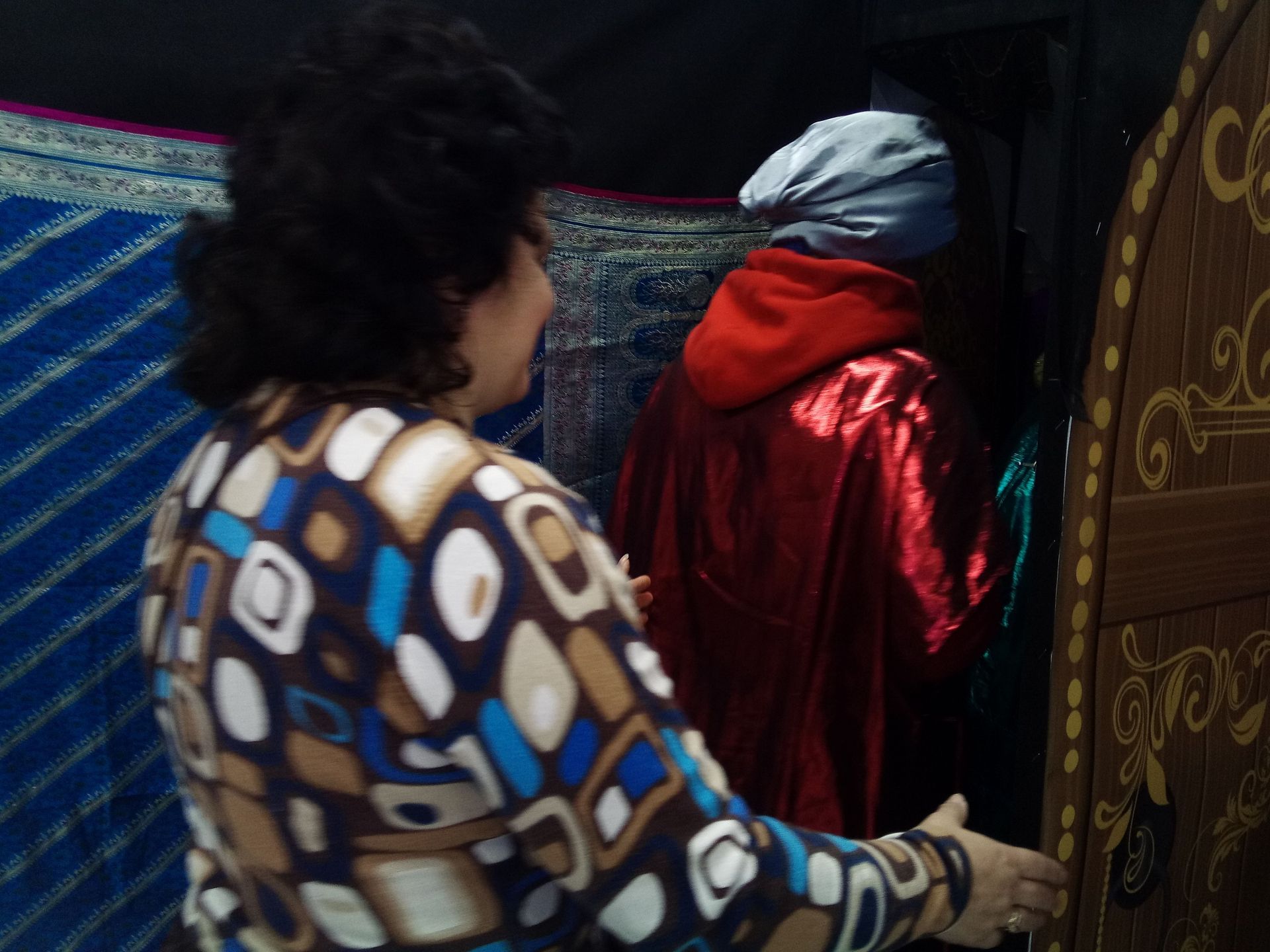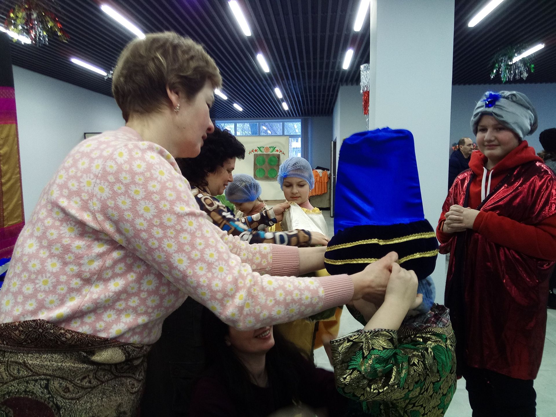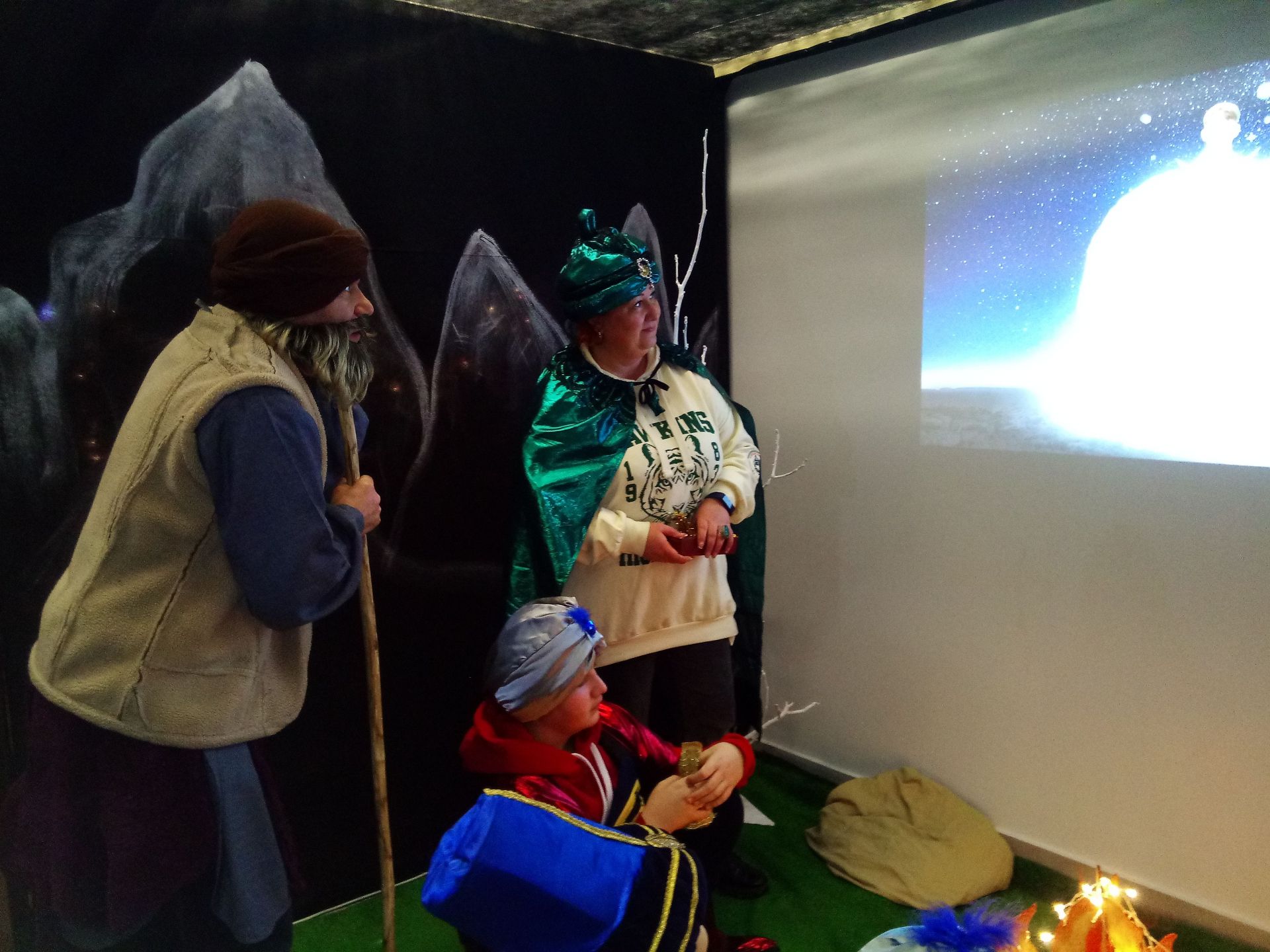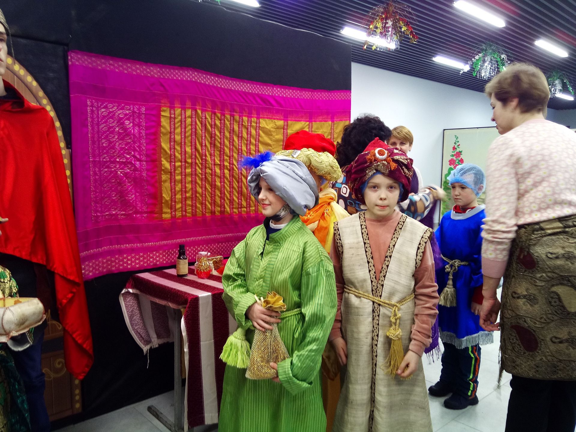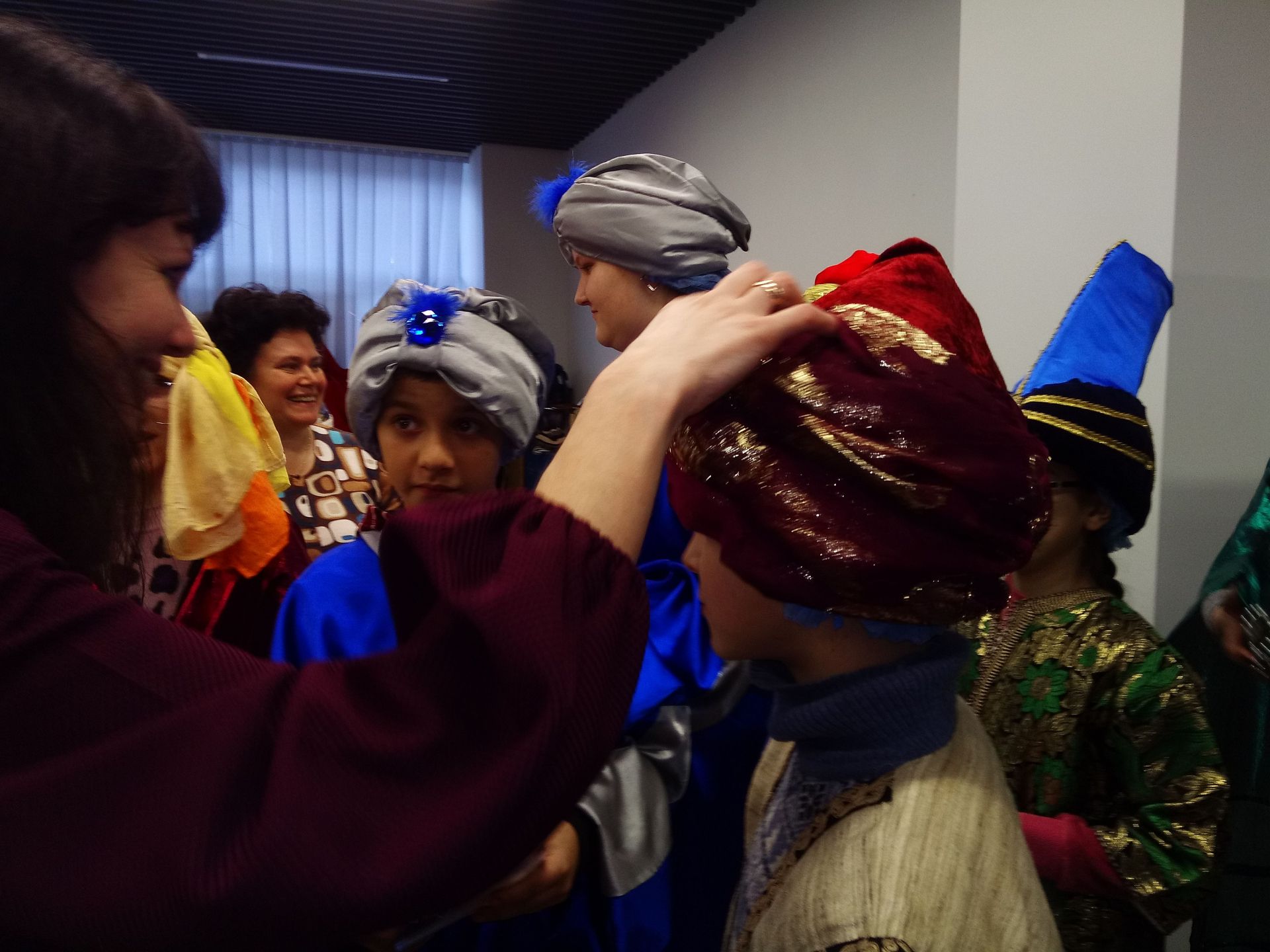Ліворуч від входу до глядацької зали облаштували локації, де відбувалося театралізоване дійство. Зайти досередини міг кожен, але лише за однієї умови — треба було одягнути тюрбан і накидку як наймолодшим, так і старшим.І це не просто так, адже глядачі вертепу були одночасно і його учасниками — вони пробували себе в ролі мудреців.