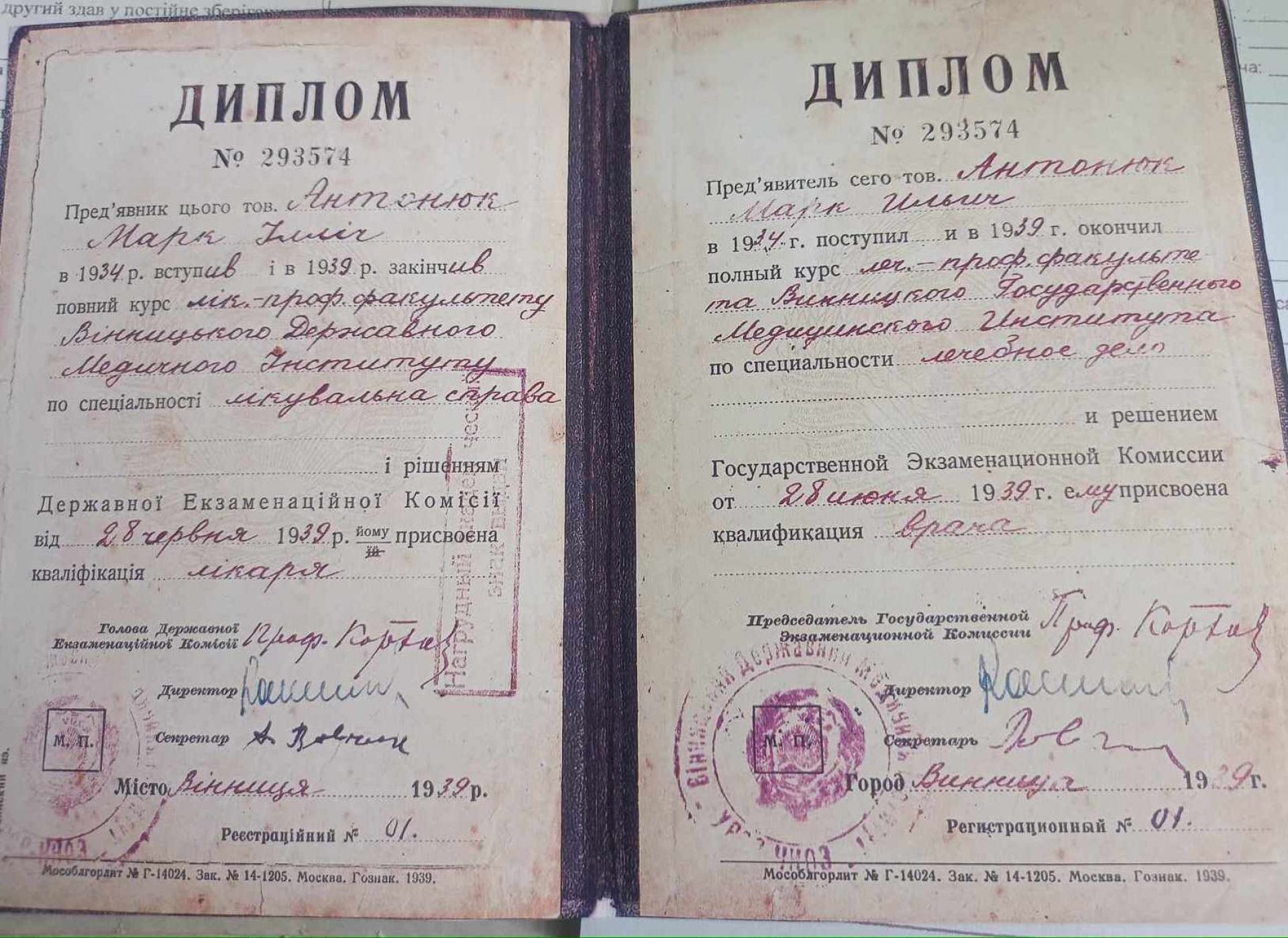 — Цю чудову з пожовклими від часу сторінками ілюстровану книгу зберіг у своїй домашній бібліотеці дідусь пані Таміли, Антонюк Марк Ілліч Він працював лікарем-отоларингологом в Козятинській районній лікарні з 1951 року. Користувався заслуженим авторитетом серед хворих і у колективі медичних працівників. Мав цікаві захоплення — писав прозу, вірші, казки. Запам'ятався мешканцям міста та району своєю неординарністю і тим, що після закнічення Вінницького Державного Медичного інституту у 1939 році за спеціальністю лікувальна справа, отримав Диплом за кваліфікацією лікаря під реєстраційним № 1, який був виписаний українською та російською мовами. Копію диплому онука відомого дідуся Таміла дозволила зісканувати для допоміжного фонду музею. Надзвичайно цікаві подарунки. Щиро вдячні родині за щедрість, — підсумувала адміністрація музею