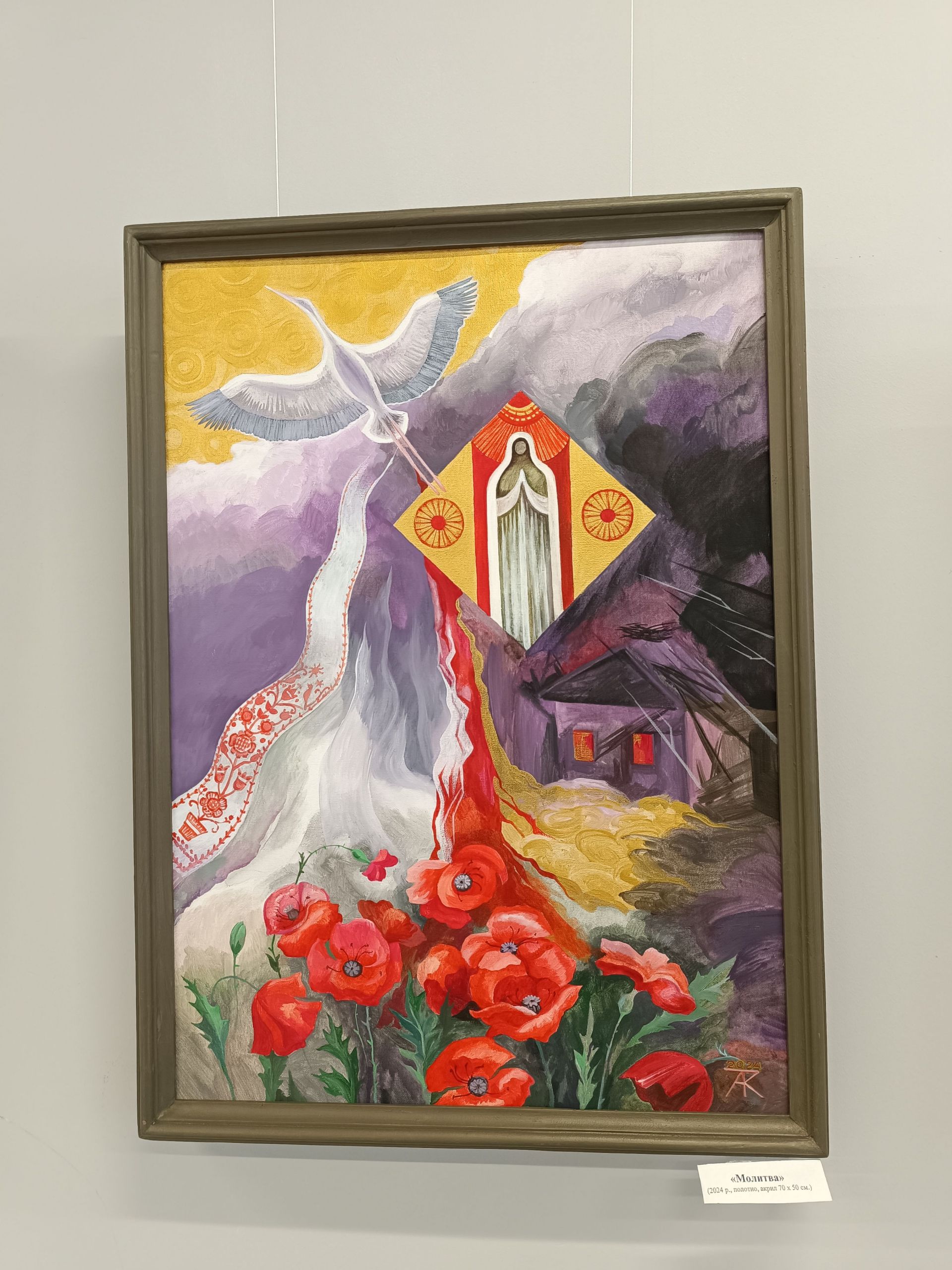 Серед картин, представлених в експозиції — «Молитва». Коли на неї дивишся, без перебільшення пробігають мурахи по шкірі. На полотні — палає хата і журавель здіймається високо у небо. Він кровоточить, але торкаючись землі ця кров перетворюється на яскраві червоні маки. «Молитва» присвячена Дмитру Хуторному, Герою, якого ми втратили на війні минулого року.