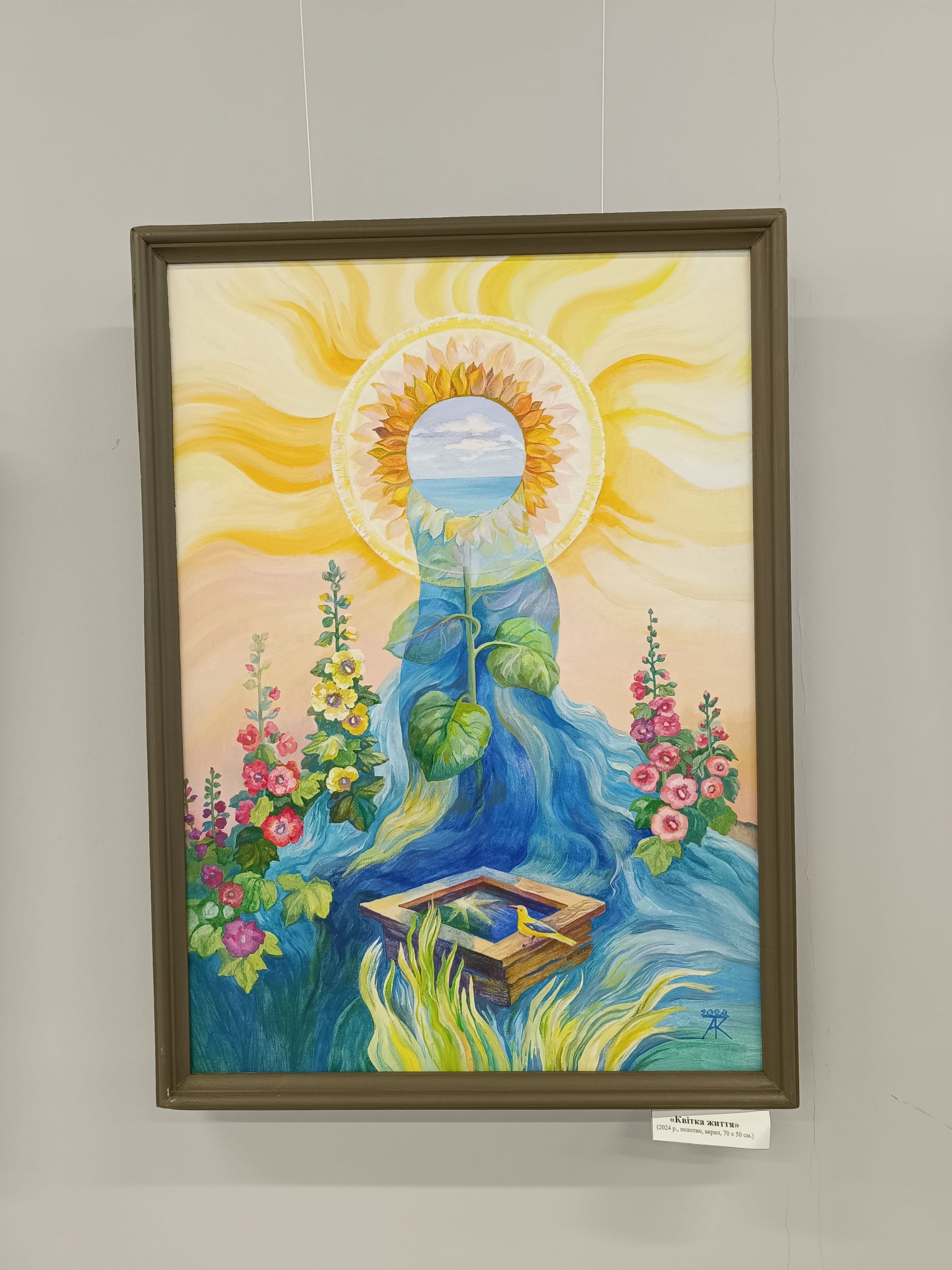 — Загальна тематика робіт— авторська рефлексія на проблеми сьогодення, природу і творчу особистість, яка цю природу осмислює і відтворює в мистецтві живопису, — каже ведуча Ольга Безпалько. — Окремим блоком виділяється цикл «Ремесла». Це десять робіт, в яких зображено приклади декоративно-ужиткового мистецтва в авторській художній інтерпретації. Програмною картиною виставки є «Квітка життя», назву якої має і сама виставка. Вона є дуже символічною. Колір сонця у поєднанні з блакитною водою дає зелений колір життя.