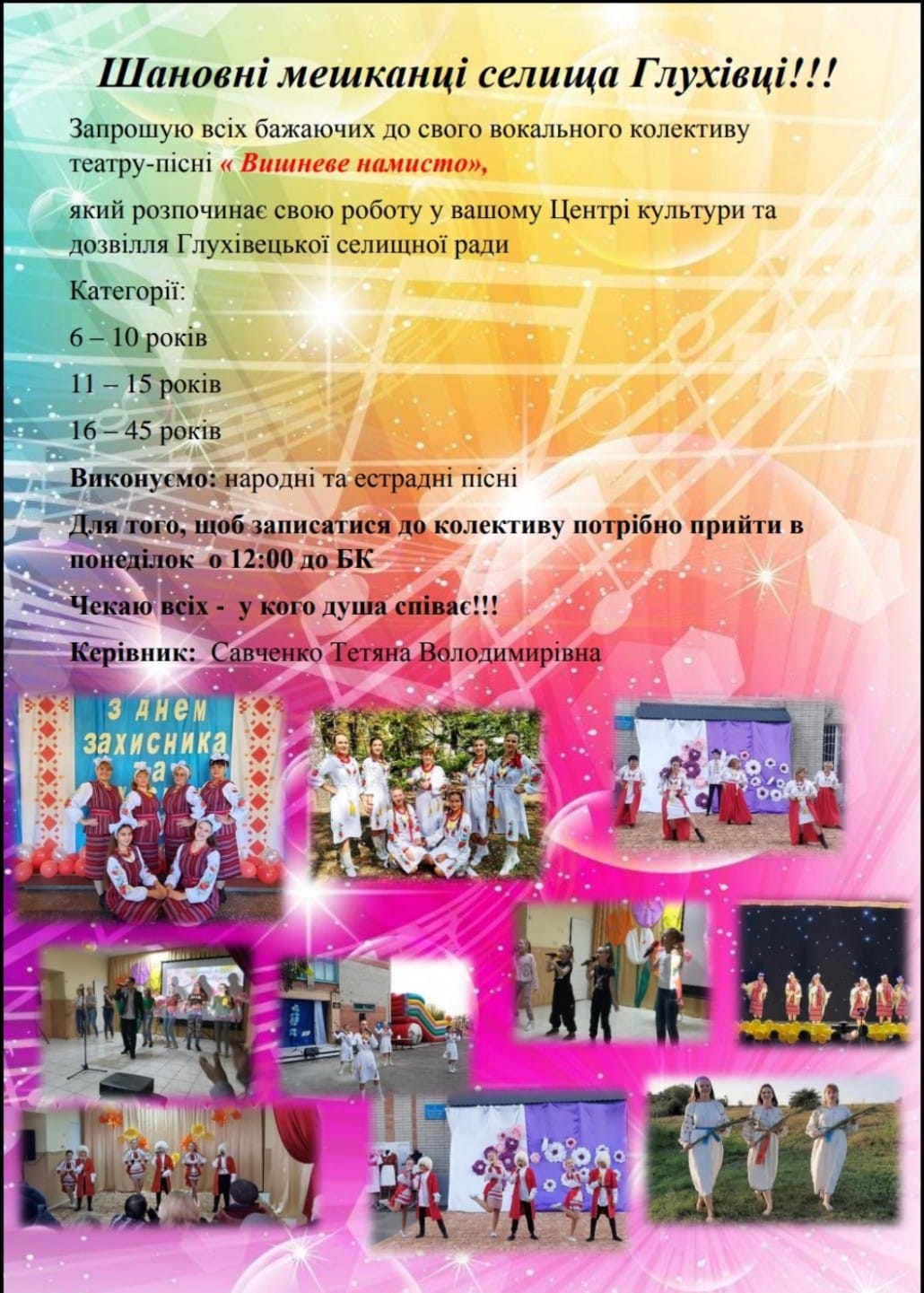 - Центр культури та дозвілля Глуховецької селищної ради оголошує про відкриття вокального гуртка театру-пісні «Вишневе намисто».