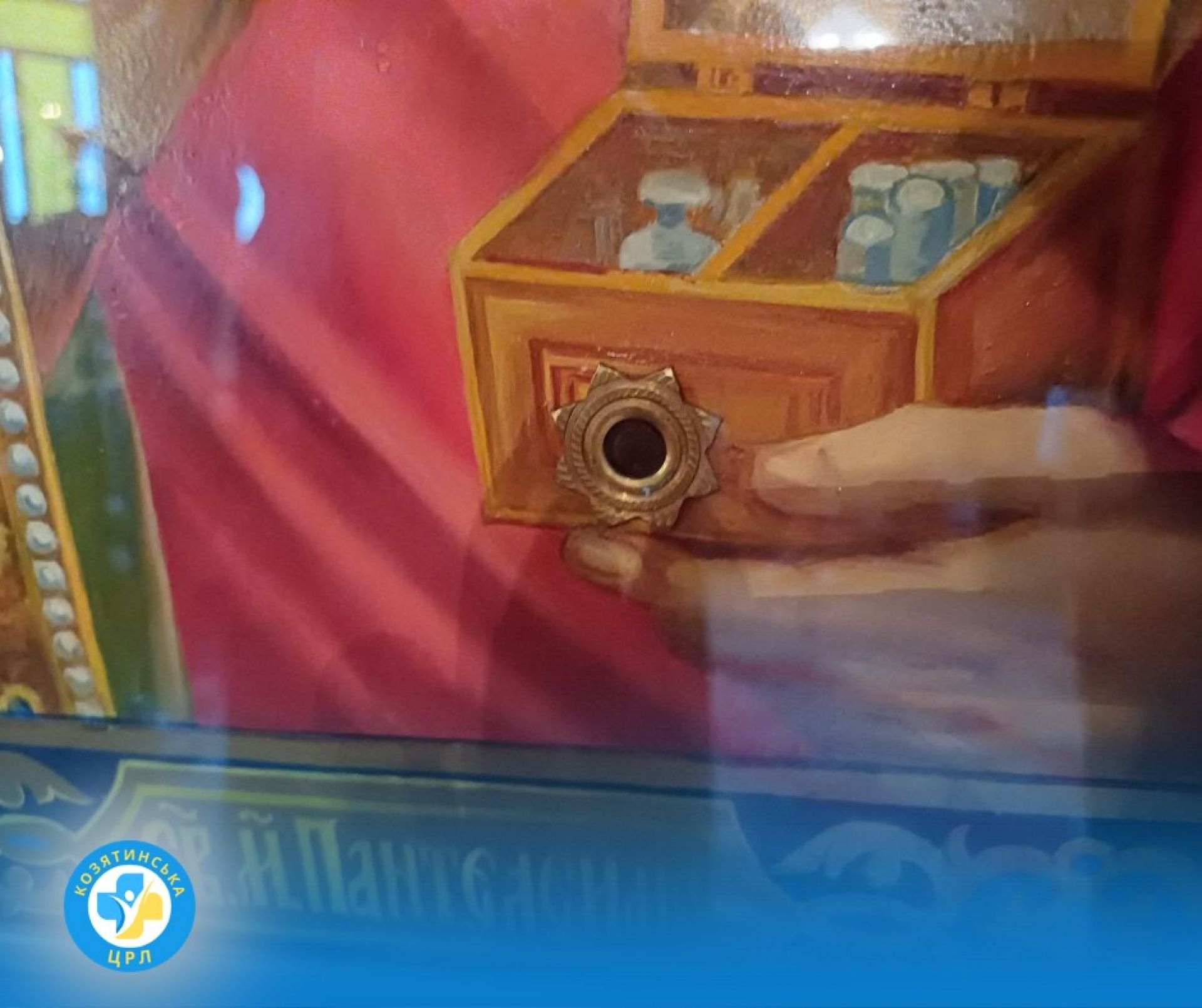 До каплички настоятель парафії митрофорний протоієрей отець Василь Влізло виніс святиню — ікону зі святою часточкою мощей Святого Пантелеймона. Як розповів священник, ікону спеціально для оздоблення його храму Покрови Пресвятої Богородиці (ПЦУ) написав відомий у Козятині художник 20 років тому. З часом у ікону внесли часточку мощей святого, яку подарував митрополит.