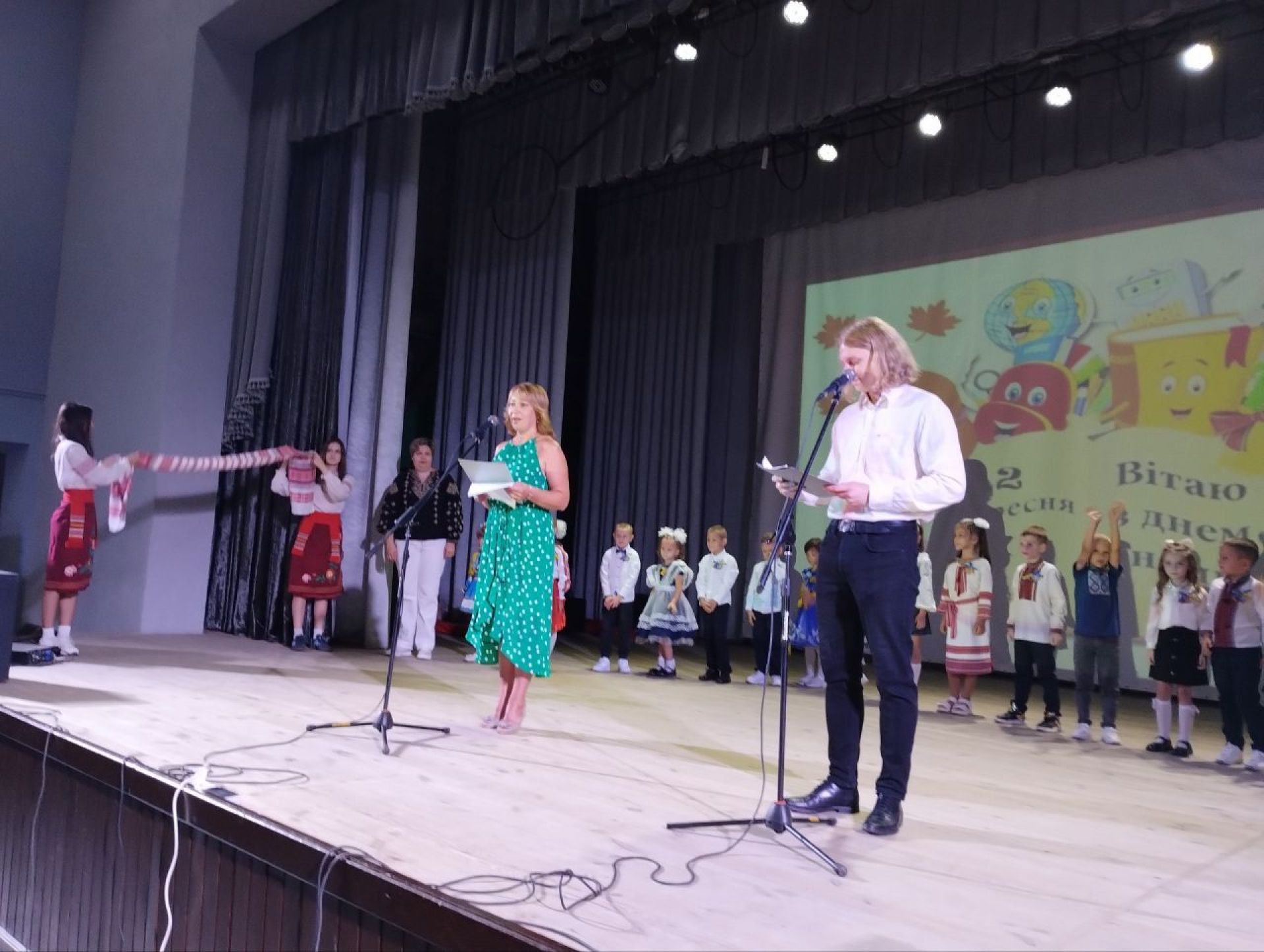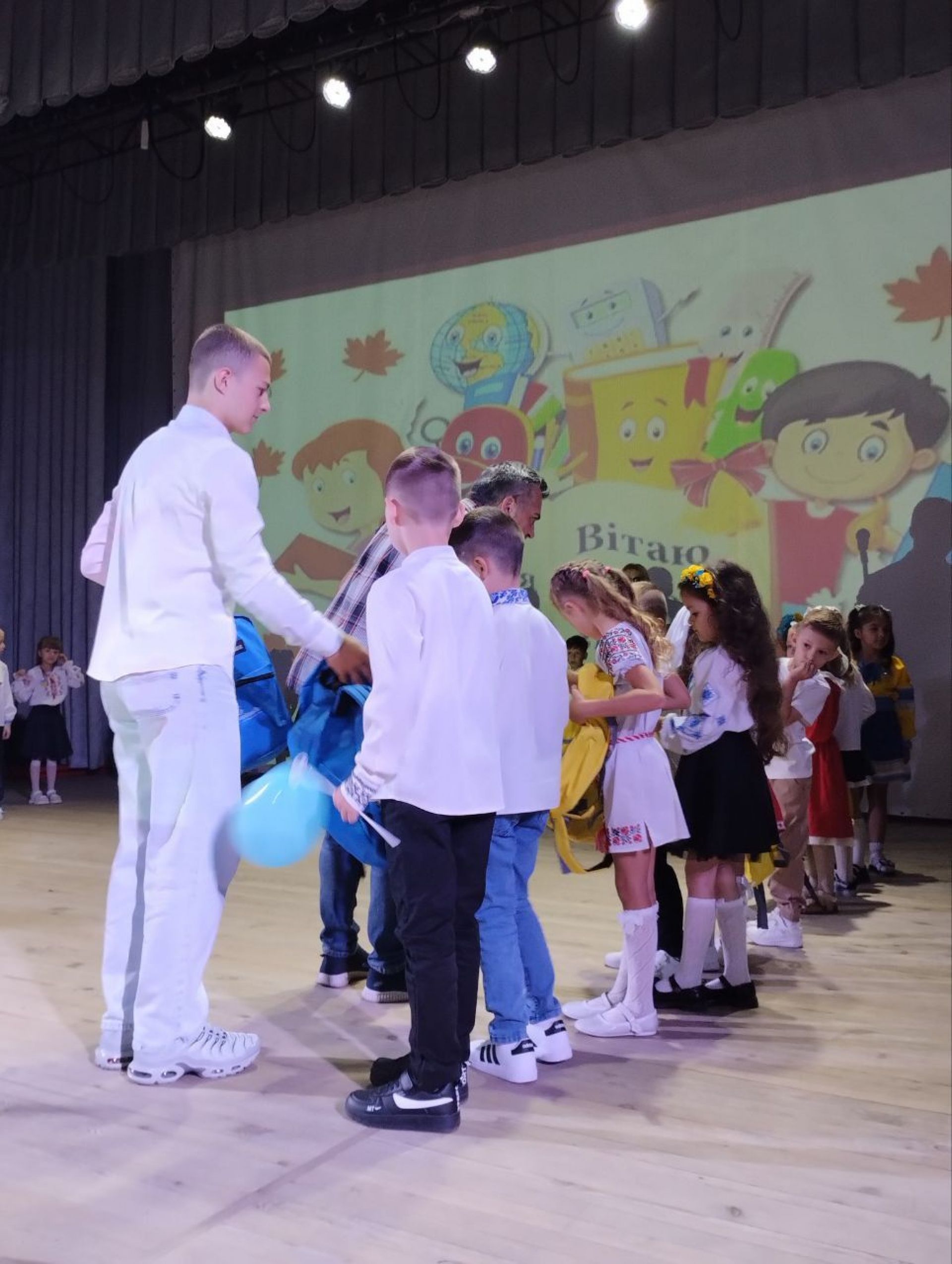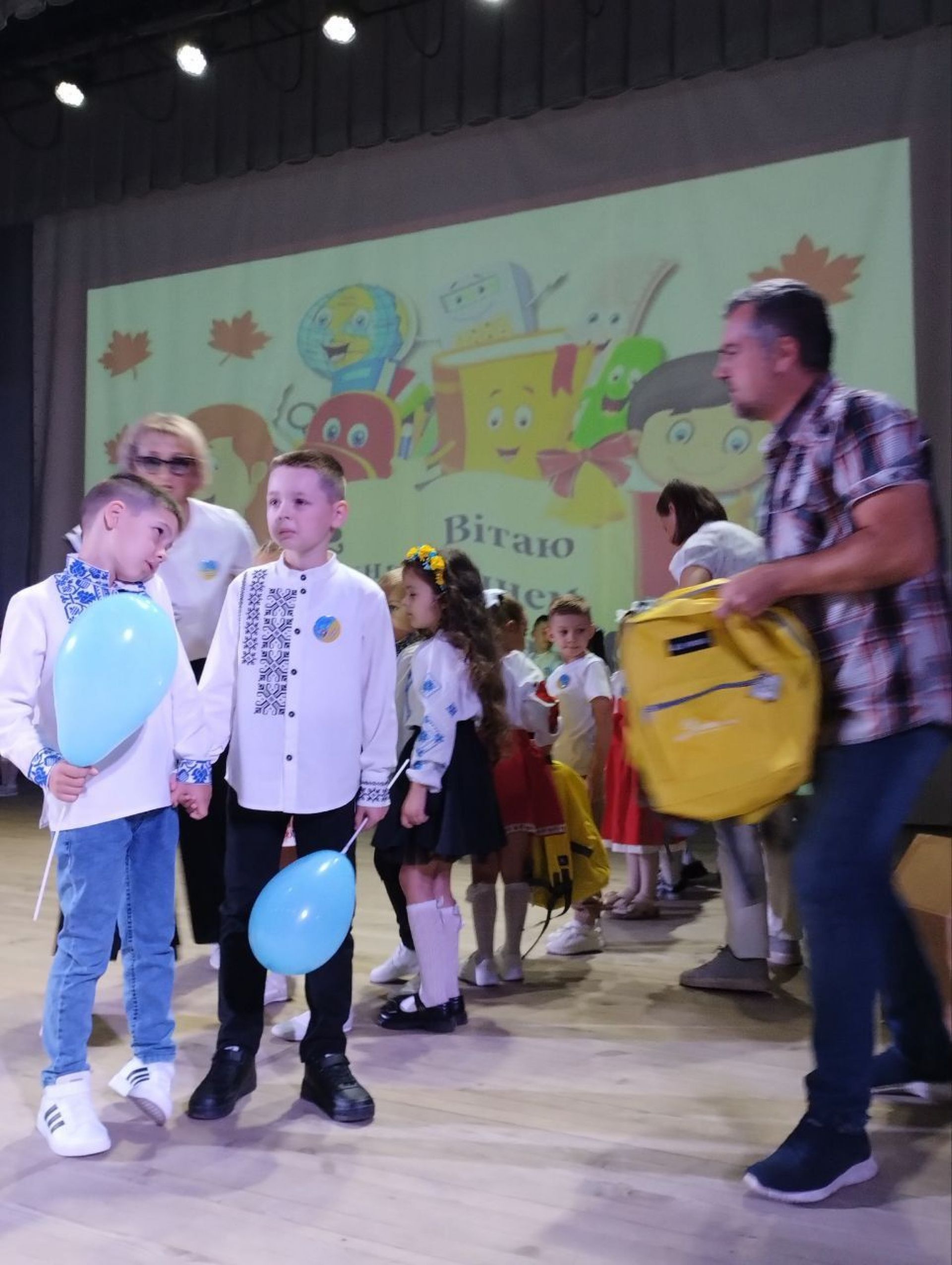 За доброю традицією учнів перших класів привітали зі святом ведучі, директор школи Оксана Кухар. та побажали мирного та щасливого майбутнього. Також діткам подарували шкільні портфелі у патріотичних кольорах.