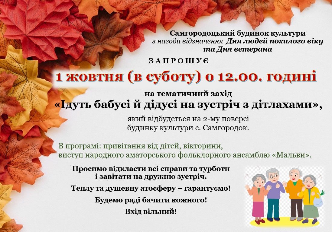 — З нагоди відзначення Дня людей похилого віку та Дня ветерана, запрошуємо на тематичний захід «Ідуть бабусі й дідусі на зустріч з дітлахами», який відбудеться на 2-му поверсі будинку культури села Самгородок. Будемо раді бачити кожного, — йдеться у повідомленні