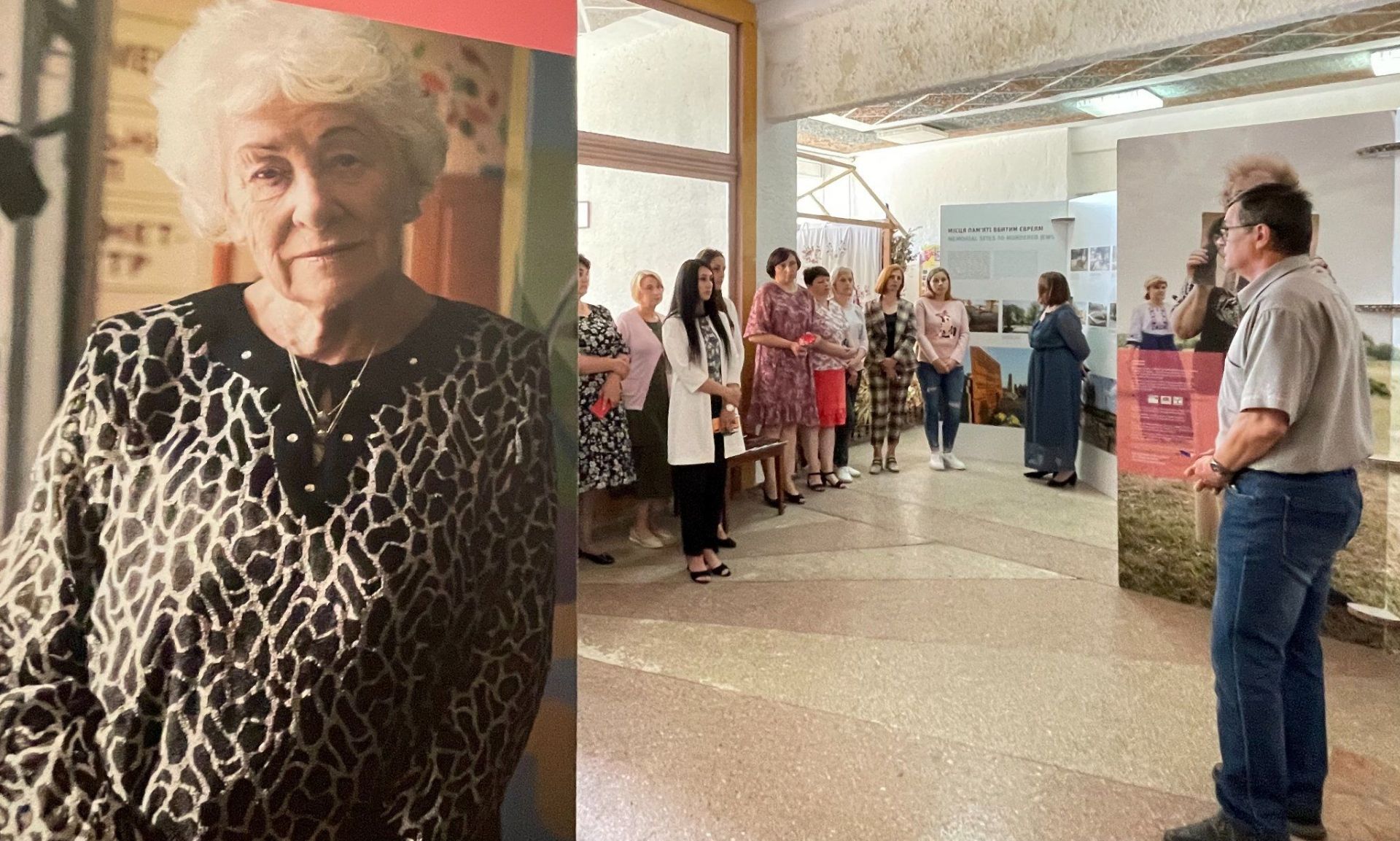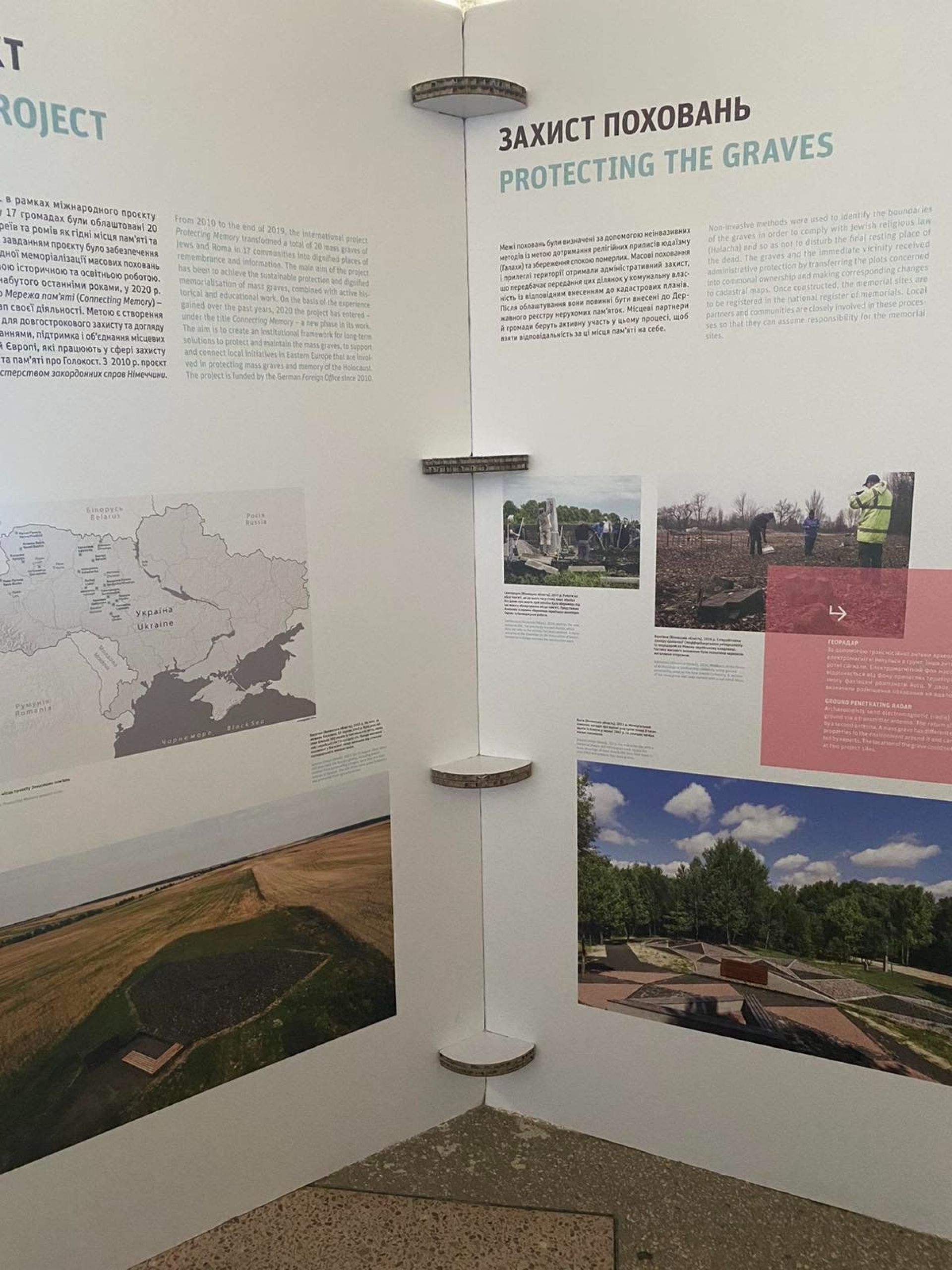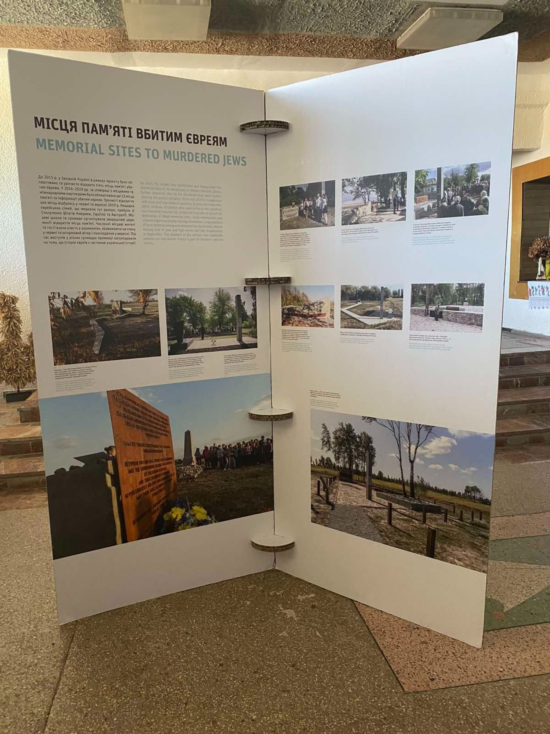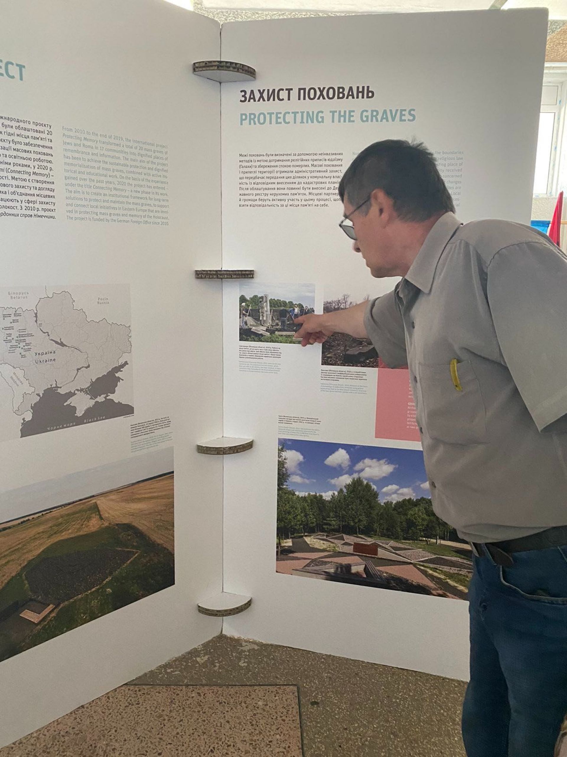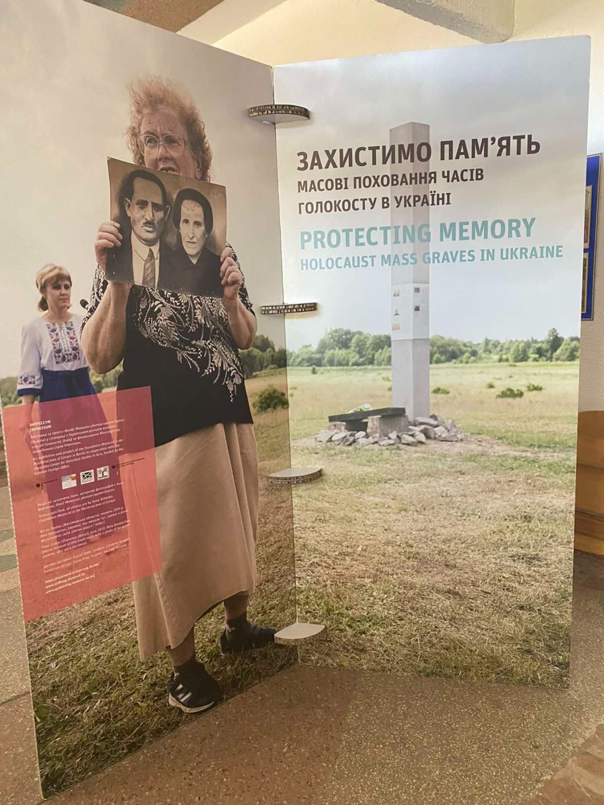 Виставка «Захистимо пам’ять» - це стенди з архівними фотографіями та свідченнями очевидців про масові розстріли євреїв в Україні. А також історії тих, хто пережив Голокост. Це один з інструментів повернення локальної історії про єврейську спільноту.