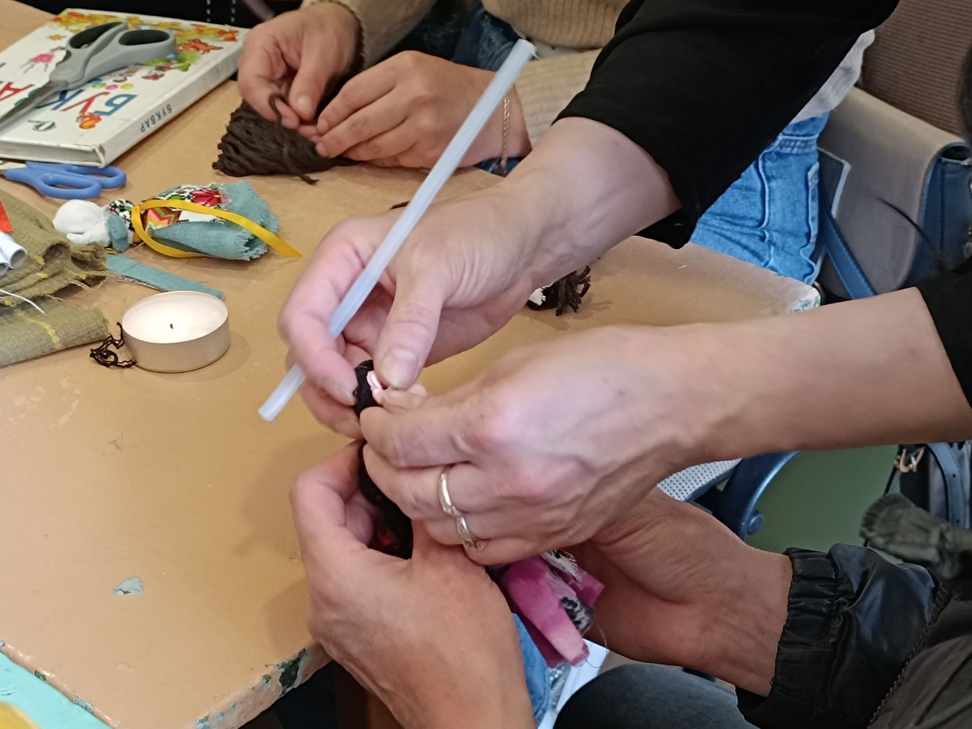 Потім майстриня демонструє, як зробити долоні. Аби було зрозуміліше, Наталія показує це на великому шматку тканини, адже долоню потрібно завернути правильно. На долонях майстриня радить зав’язати вузлики, щоб вони не розмоталися. За тим козятинчанки намотують своїм Щастячкам талію і руки, а тоді роблять коси з шерстяної нитки. Наталія ділиться секретом, як легко зробити волосся пишним та однакової довжини. Для цього учасниці майстер-класу використовують підручник.