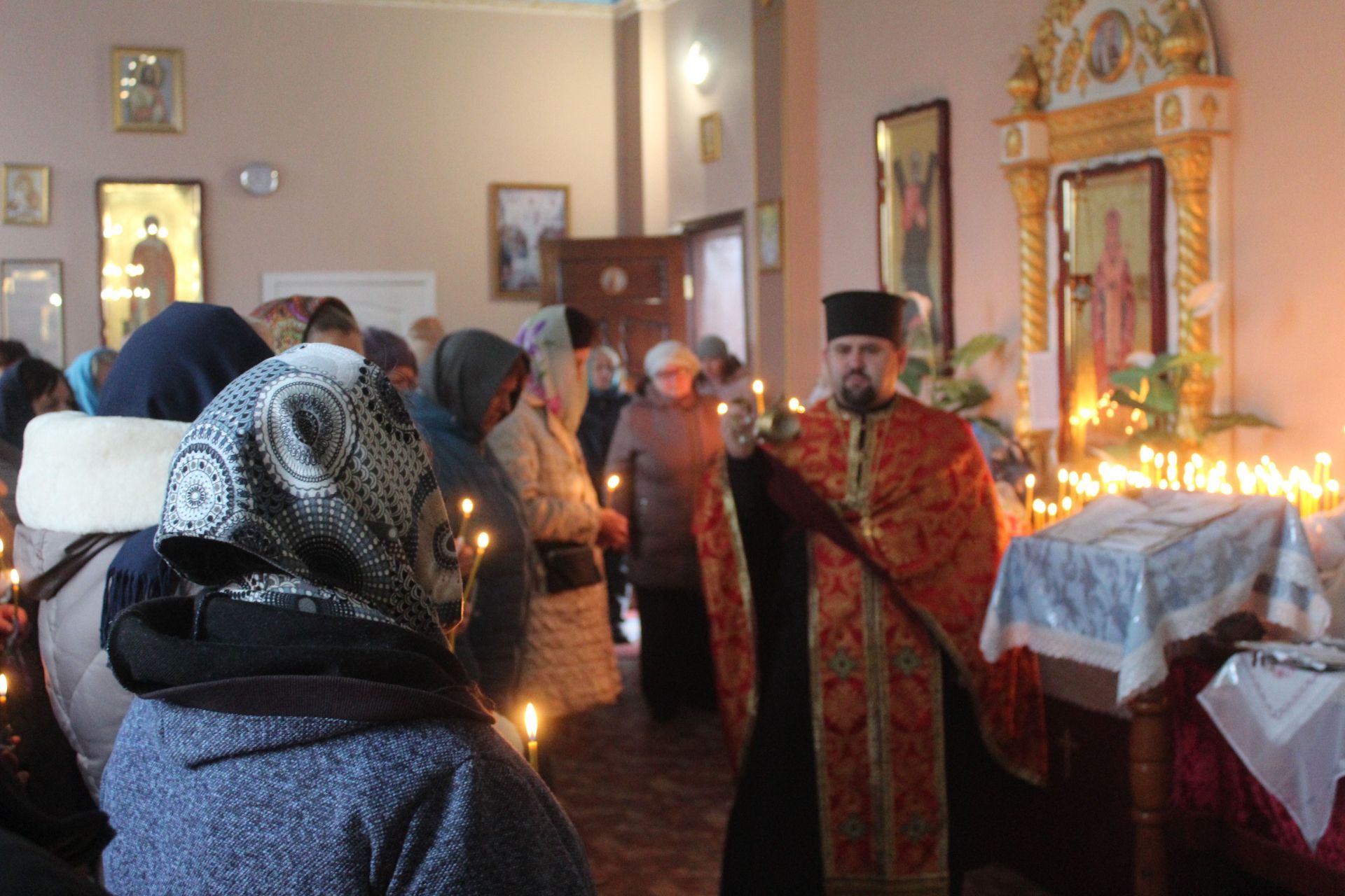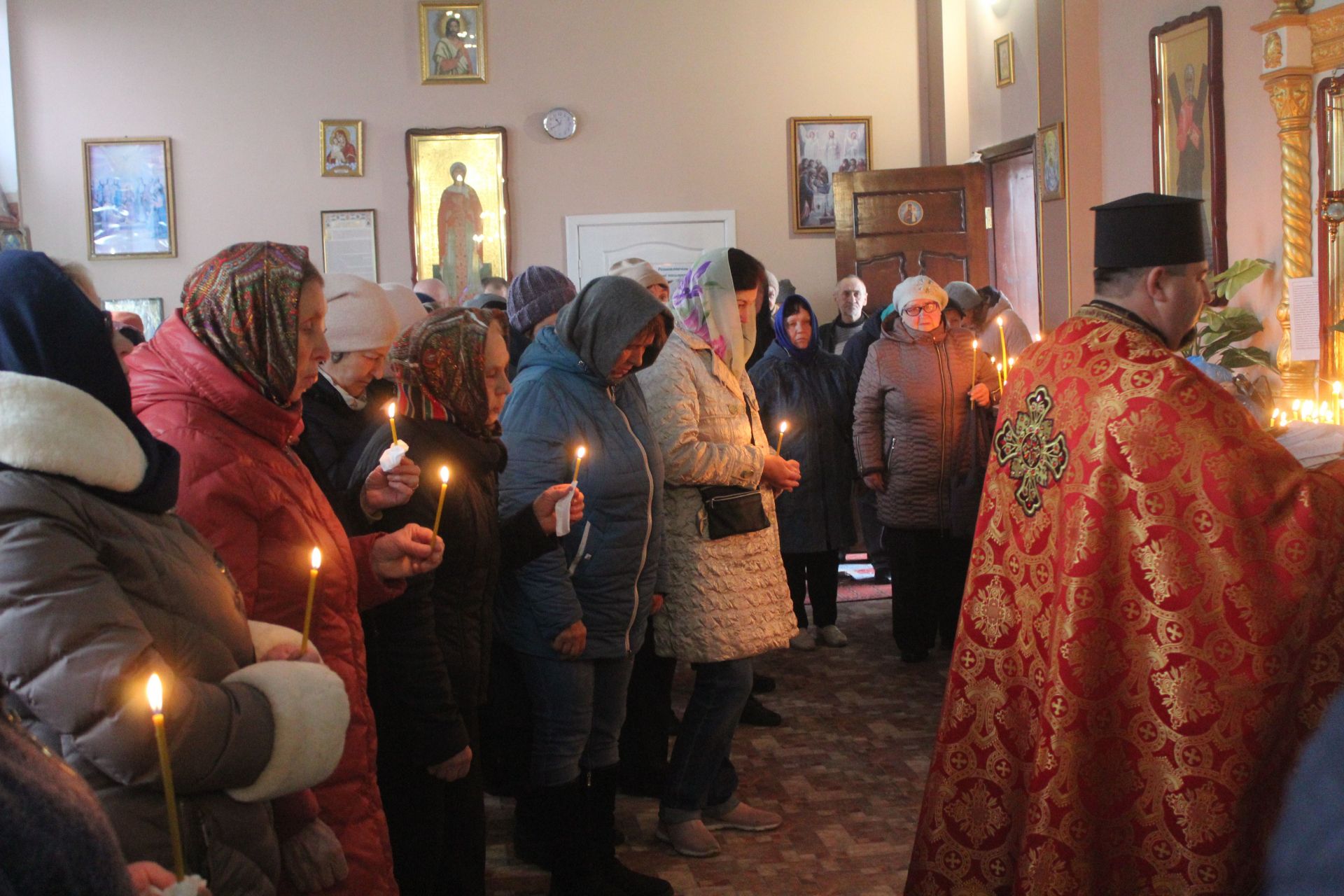 Почалося церковне Богослужіння о 8-й годині ранку. Службу Божу отець Василь почав з молитви за наших воїнів. Цілу годину він просив у Бога здоров’я для наших захисників і миру в Україні. Після служби Божої священик став проводити панахиду за загиблими. Отець Василь співав молитви, а прихожани храму, запаливши свічки тримали їх в руках протягом всієї служби Божої.
