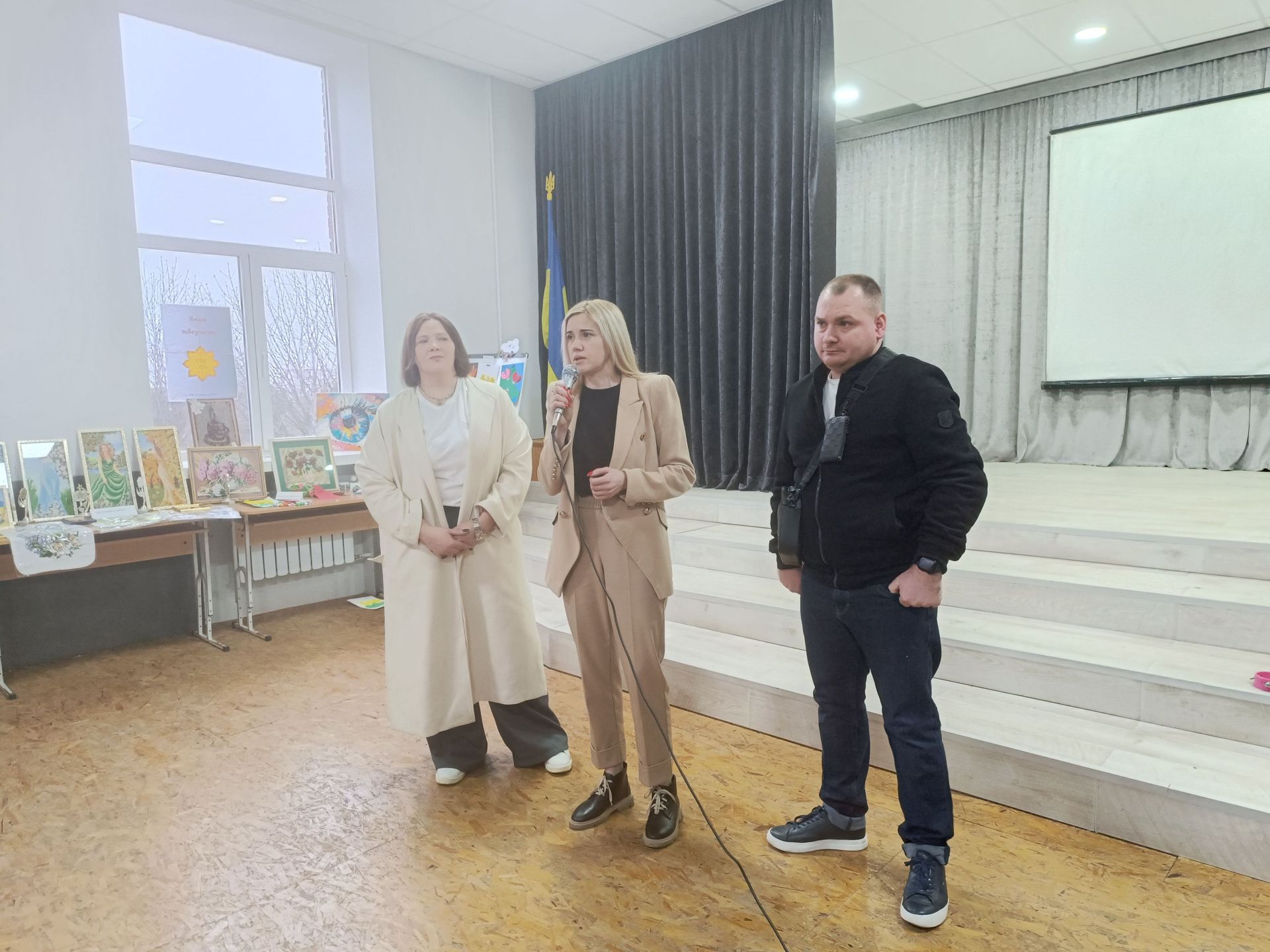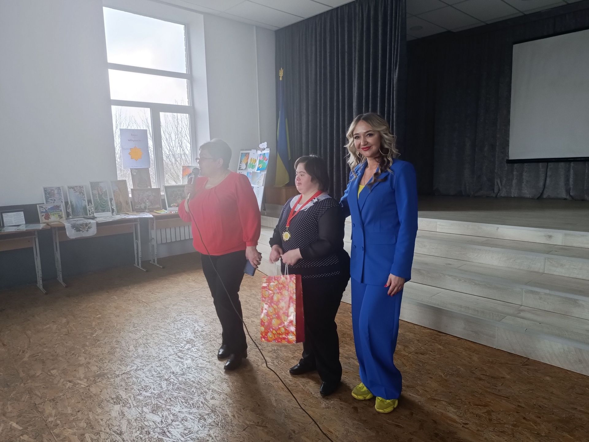 Поруч зі сценою облаштували виставку робіт людей з інвалідністю. Вишиті бісером картини — це творіння Анни Попович.