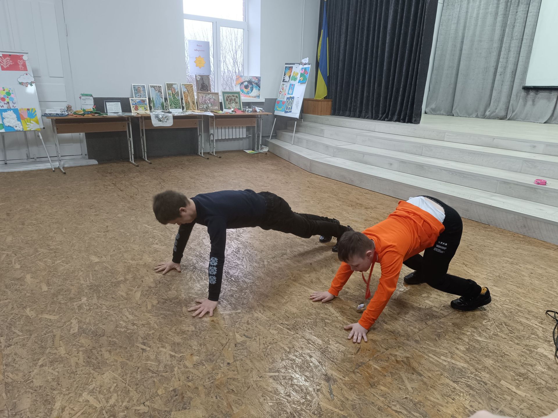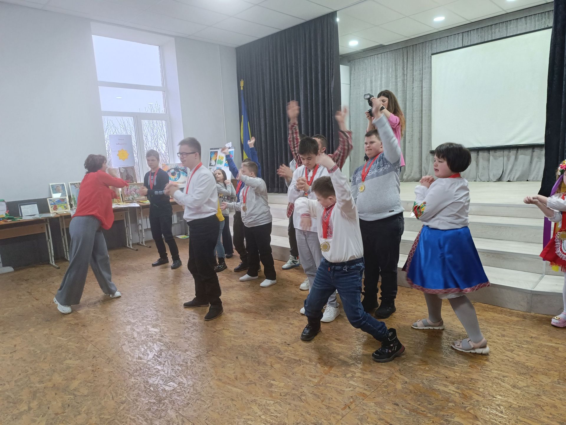 Усіх діток покликали на сцену на танцювальний флешмоб. Залунали акорди «Порічки» Yaktak. Хореограф Надія Бортюк показувала рухи, а діти за нею повторювали.