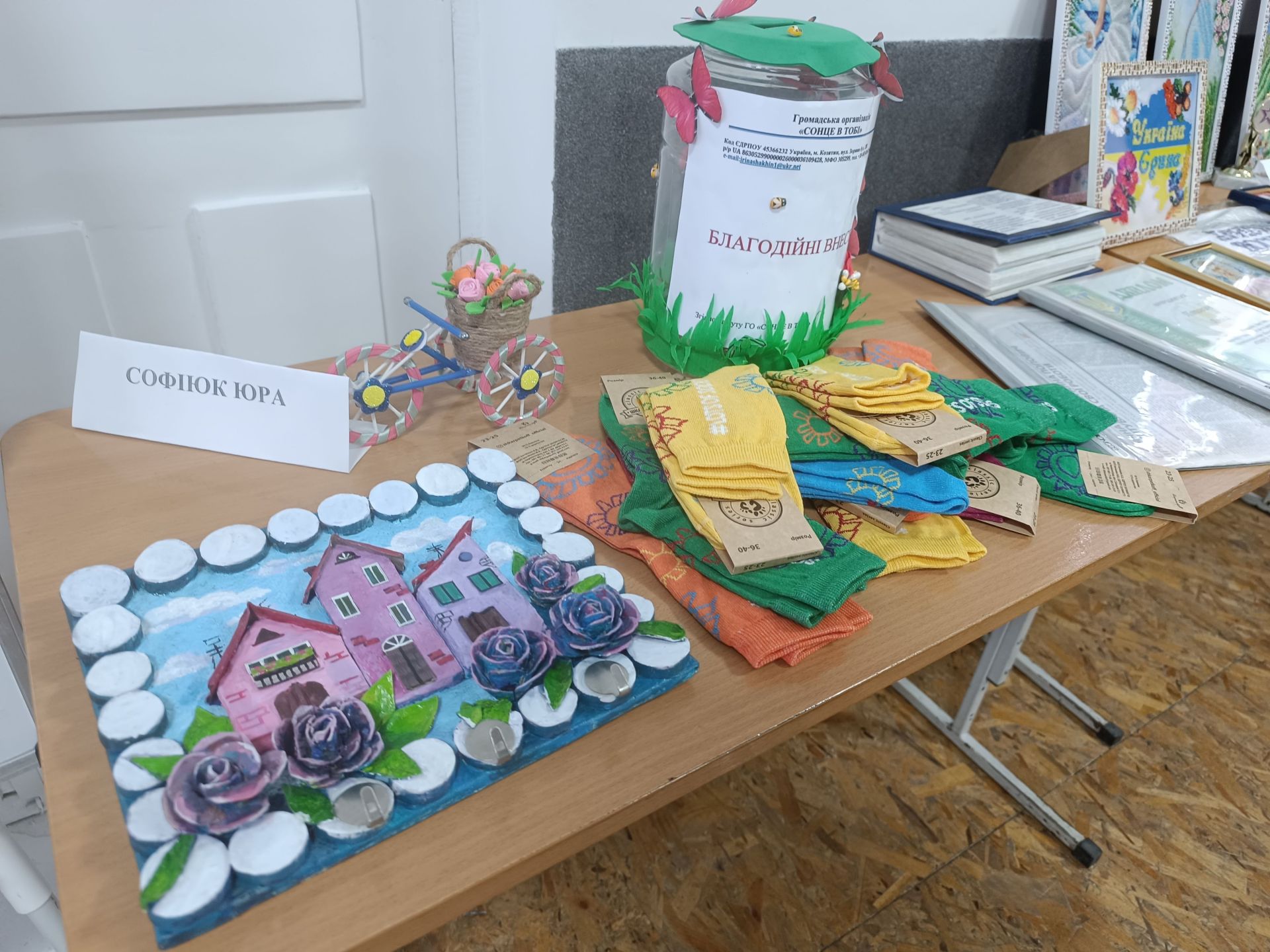 Юра також виготовляє декоративні вироби власноруч. Він — учасник багатьох виставок та благодійних ярмарок у нашому місті. Серед гостей, що завітали на захід, була волонтерка Вікторія Хоманець. Вона знайома з Юрієм особисто.