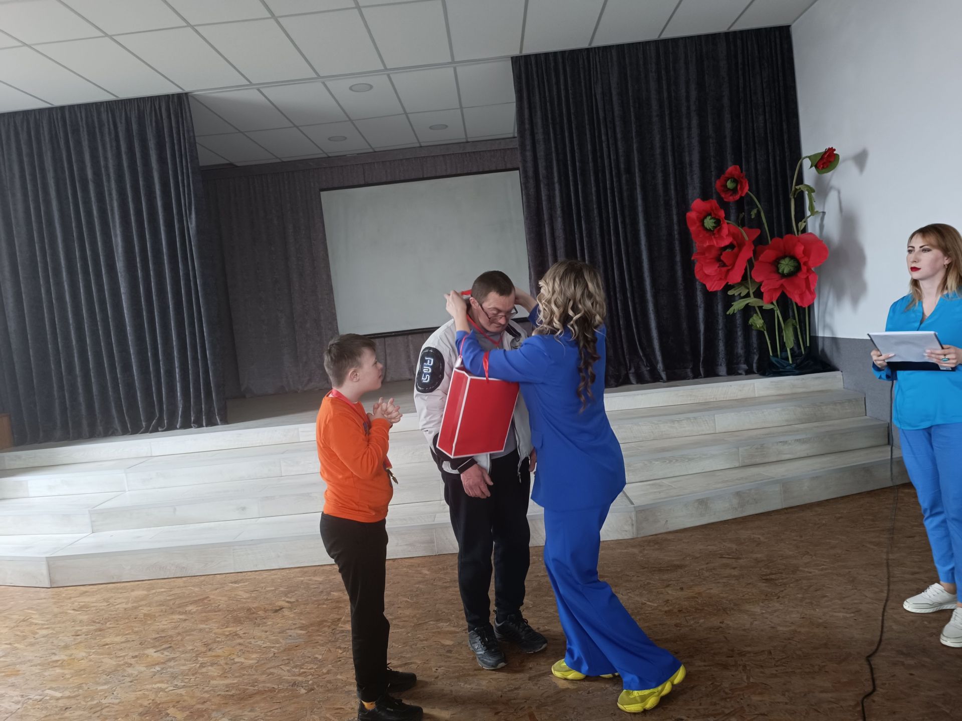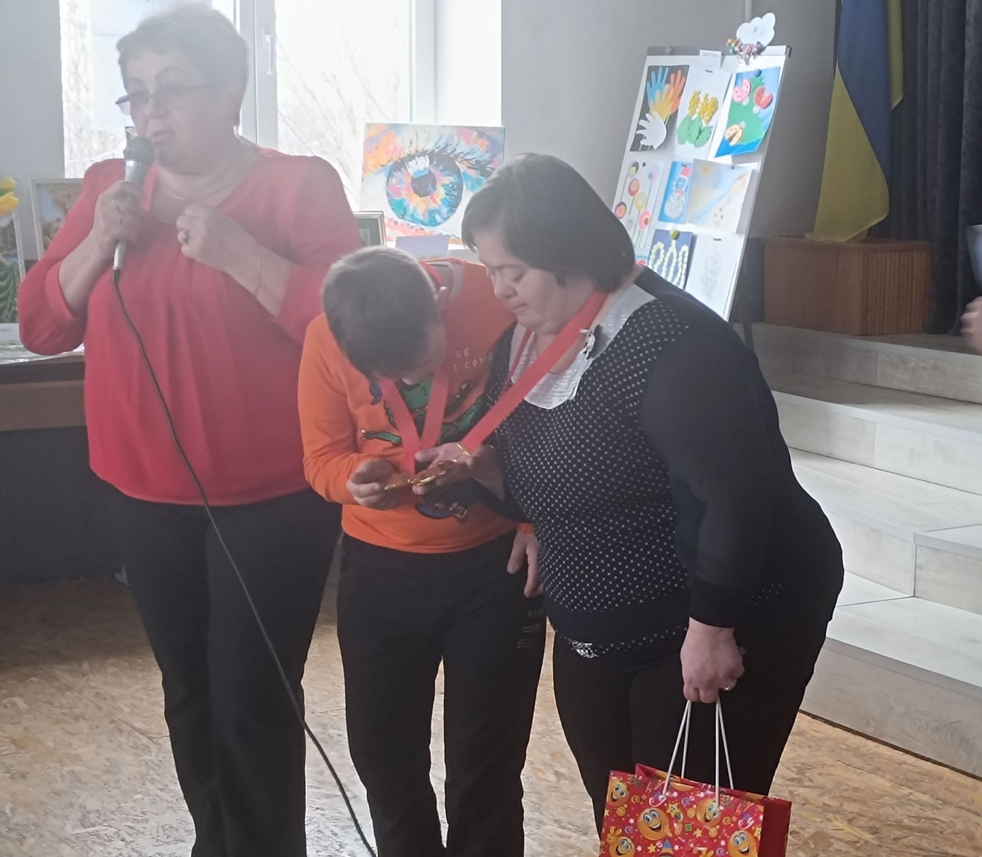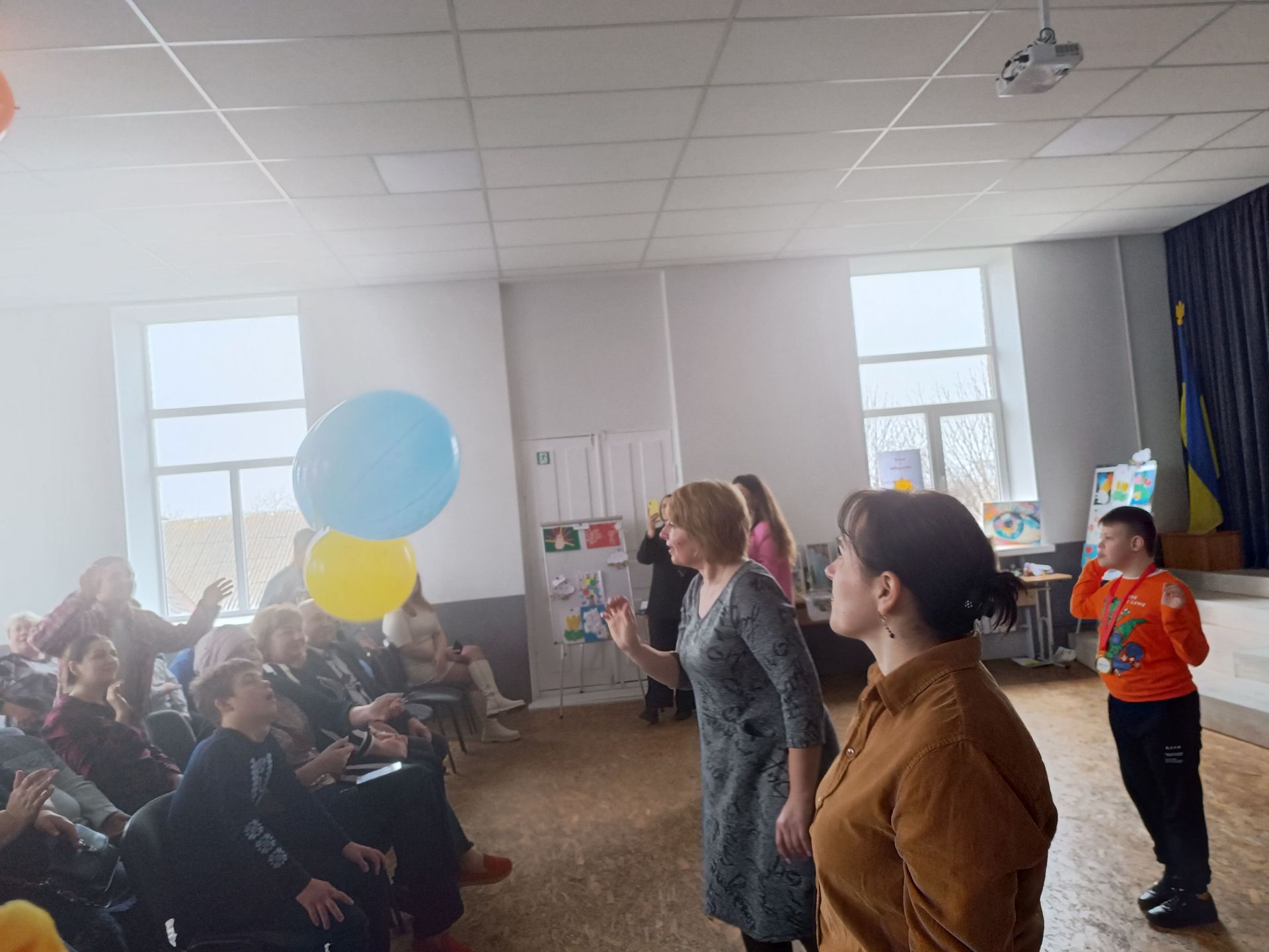 Анну та Юрія нагородили медалями громадської організації та вручили подарунки. А тоді влаштували музичну паузу, для якої до залу занесли реквізит — великі повітряні кулі.