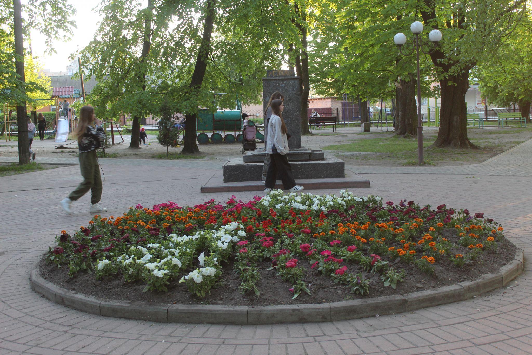 На лавочках біля центрального входу ми помітили відразу три зміни. Не стало чергового скейт-трампліна, комунальники оновили клумби, а на п'єдесталі, де колись був пушкін, стояв хлопчина у шортах, якого діти назвали бюст Пушкін-Кіріл.