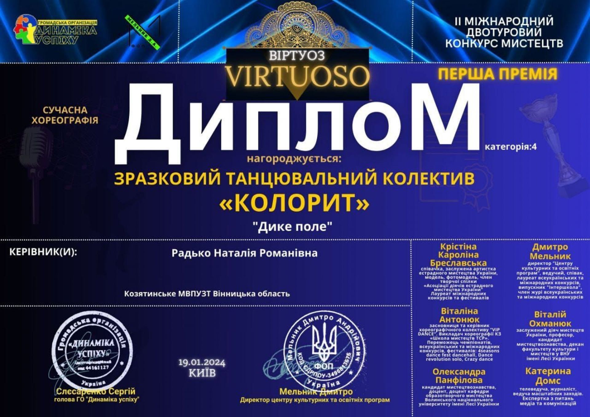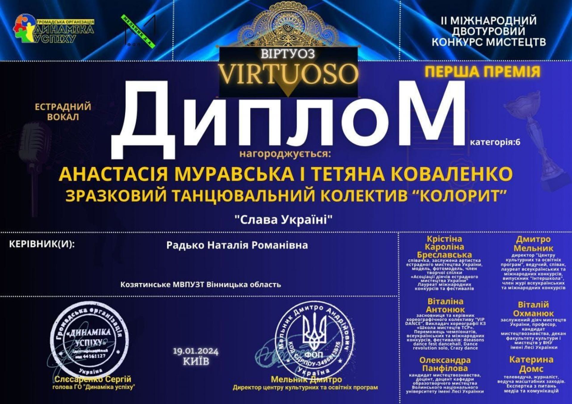 - Вихованці гуртків художньої самодіяльної творчості, під керівництвом Наталії Радько, Козятинського міжрегіонального вищого професійного училища залізничного транспорту приймають вітання із перемогою у ІІ Міжнародному двотуровому конкурсі мистецтв «VIRTUOSO» («ВІРТУОЗ»).