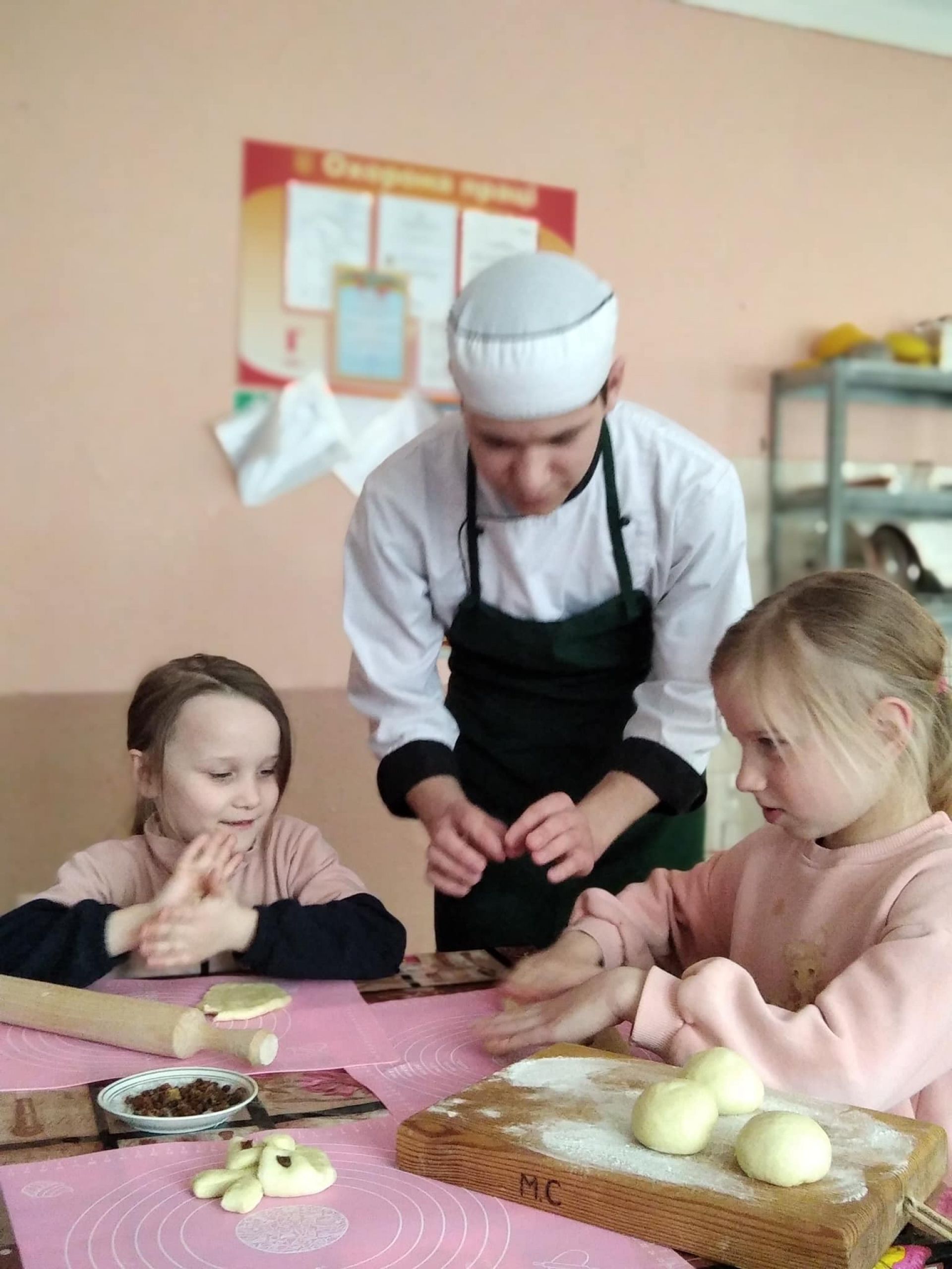 Учні групи №6 Артем Маковецький групи № 231 Катерина Жорноклей та Богдана Братун з задоволенням поділилися своїми навичками по формуванню виробів із дріжджового тіста.