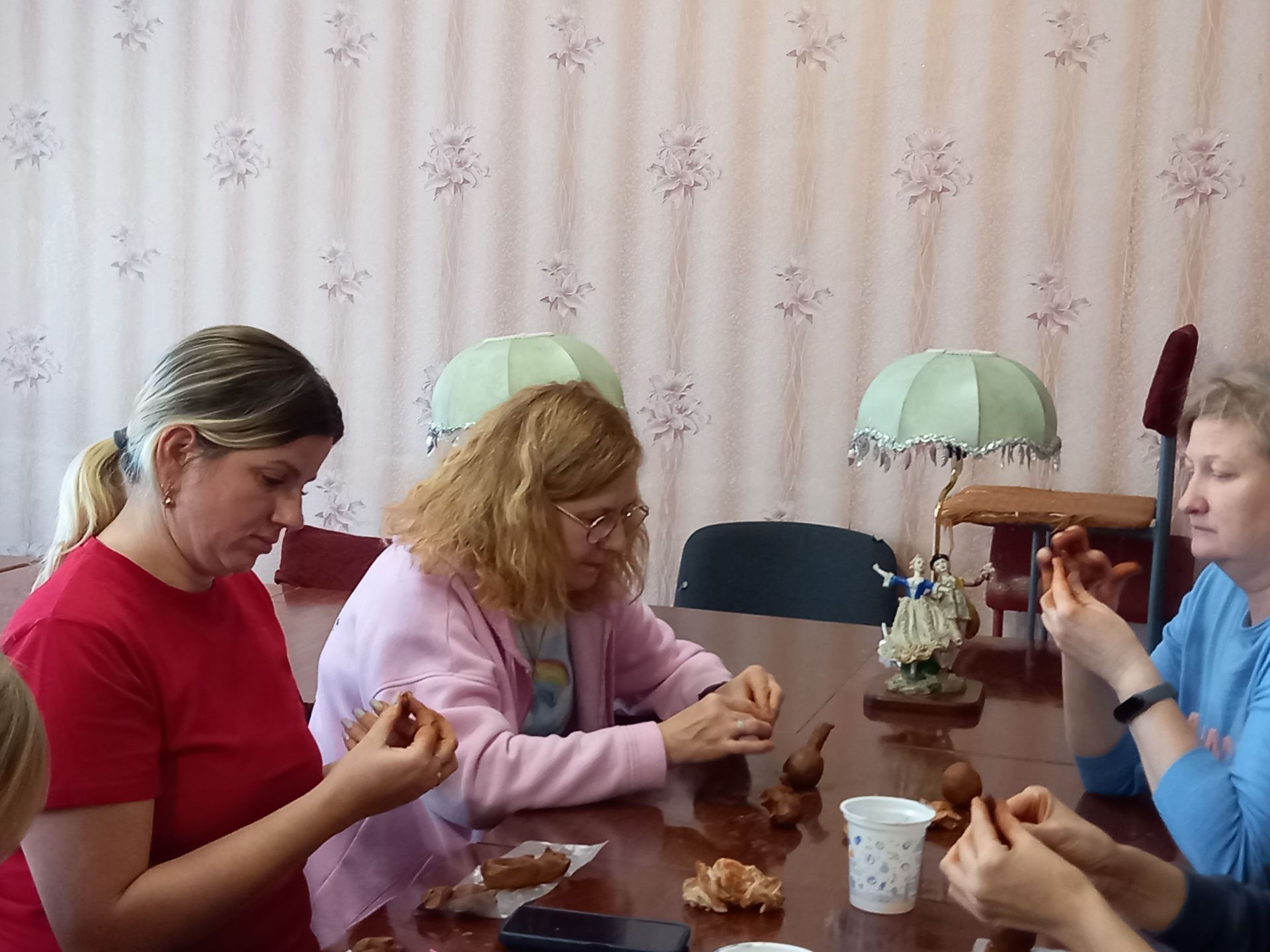 Наталія роздає жінкам шматочки червоної глини, а також вологу тканину. Вона необхідна, щоб зволожувати руки. Так глина під пальцями буде більш слухняною. Наталія наголошує — руки мають бути злегка зволоженими, а не мокрими, інакше виріб погано триматиме форму.