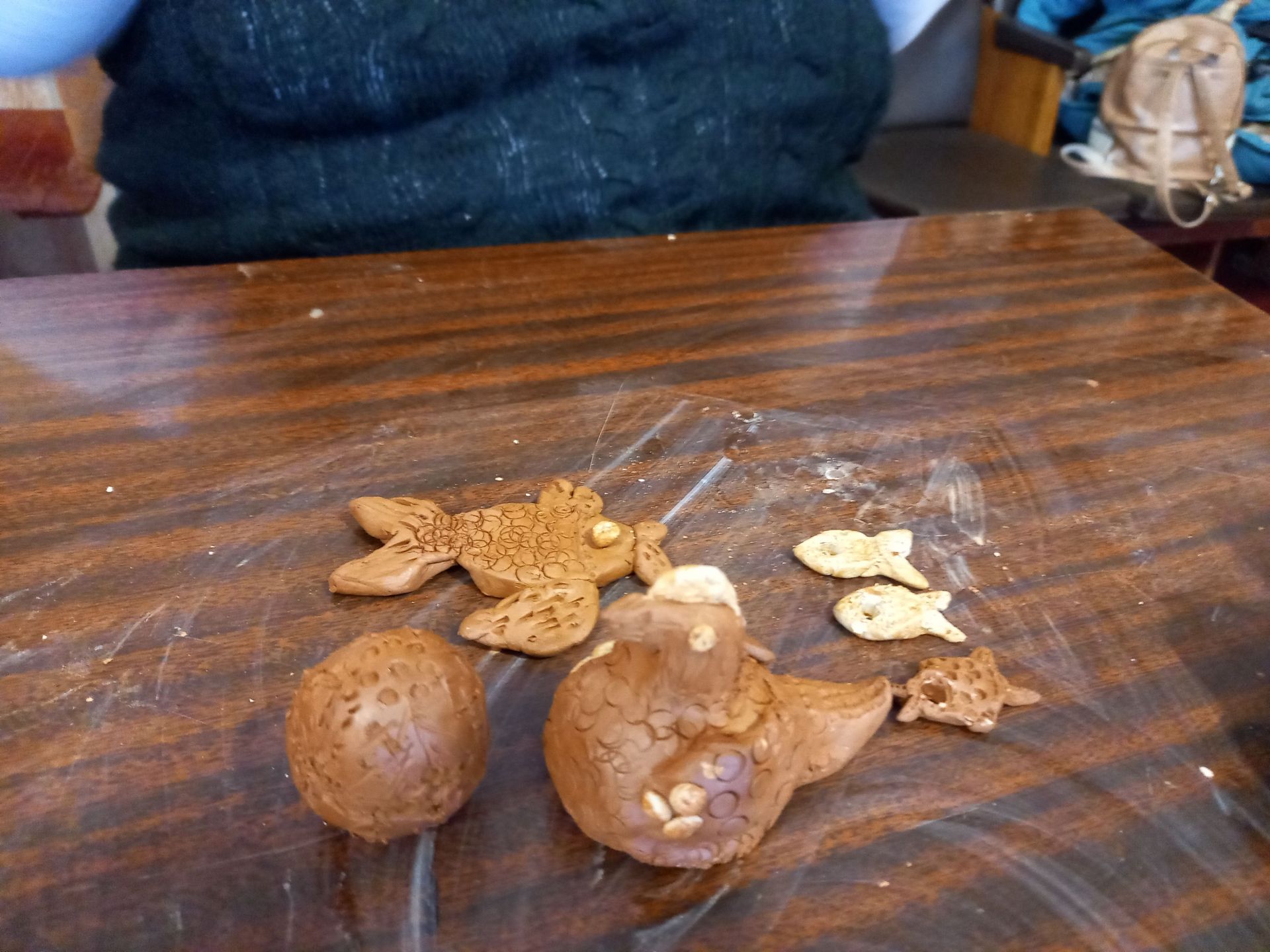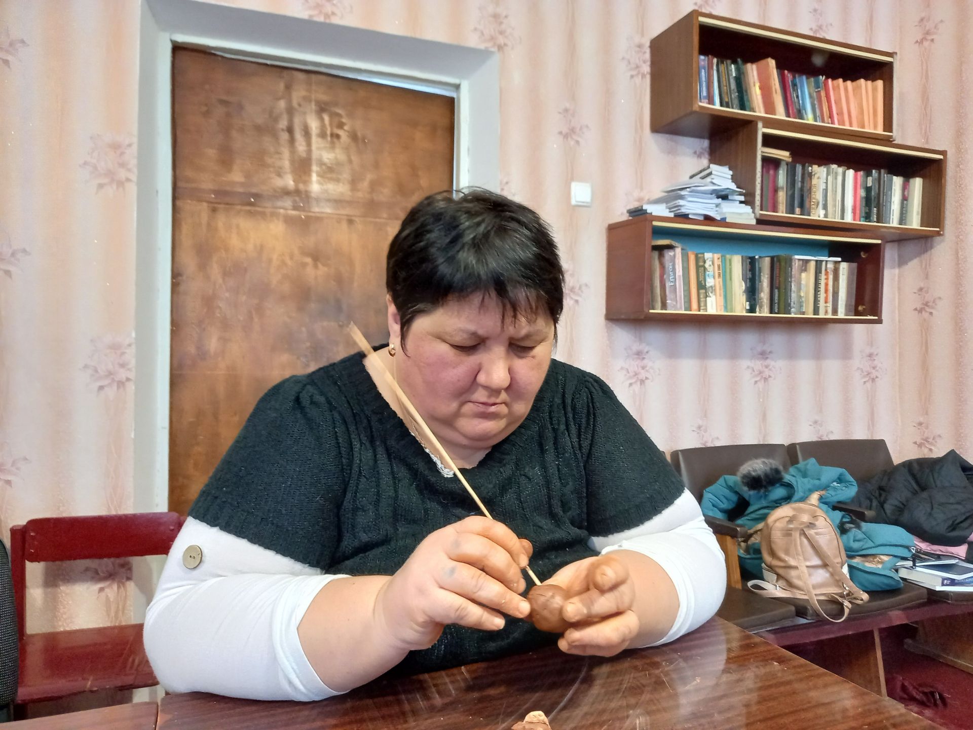 — Для того, щоб зробити пустотілу фігурку, ми робимо дві кульки приблизно однакового розміру, — дає настанови майстриня. — Тепер я роблю в кульці заглиблення великим пальцем, а потім обминаю краї. Так робиться пустостіле яйце. Якщо покласти всередину декілька шматочків глини, буде торохкальце — сира глина спочатку прилипне, а коли висохне, шматочки від’єднаються і будуть тарахкотіти. Але також таким способом можна і пташечку зробити.