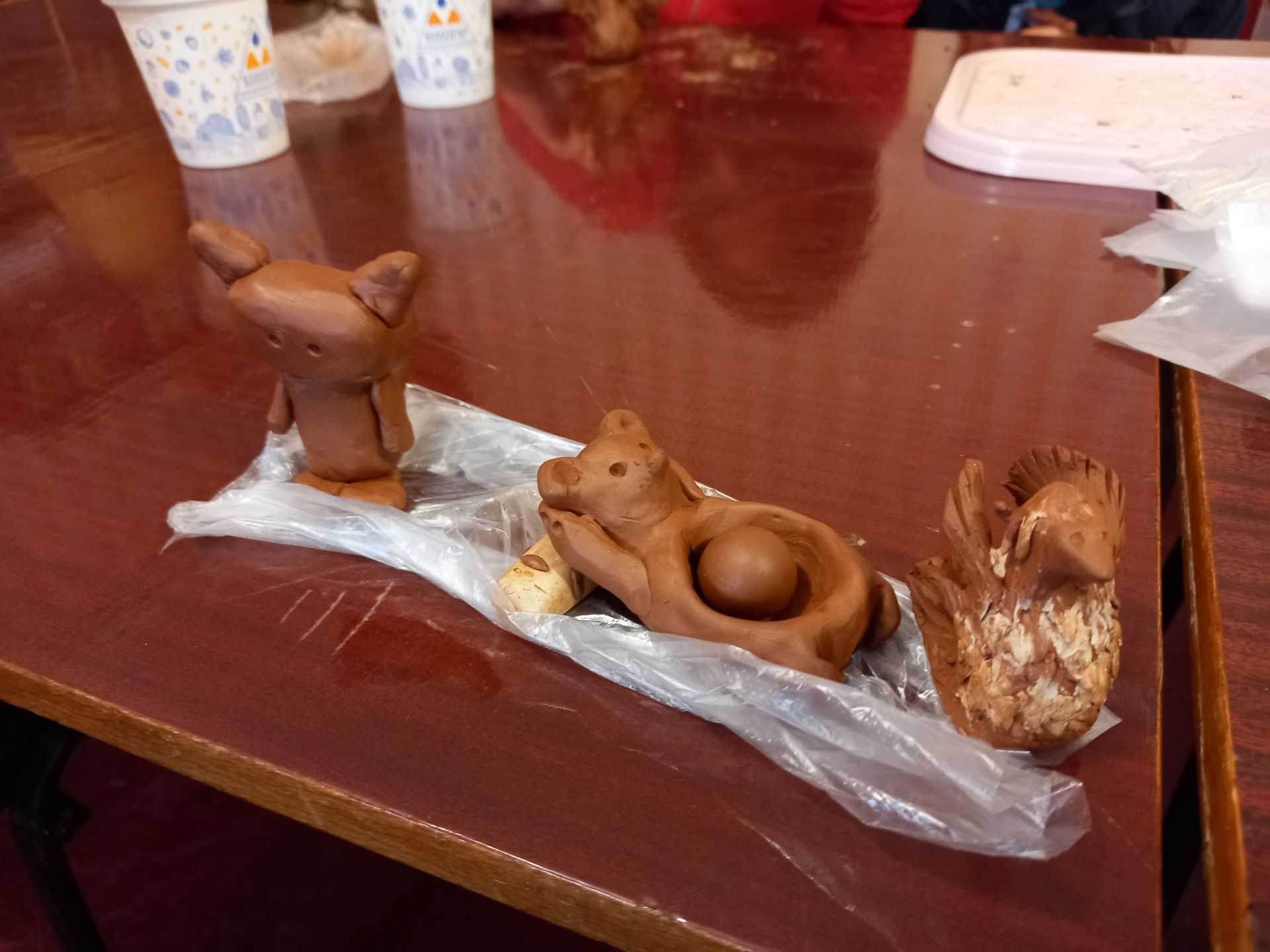 Першою впоралася Катерина. У неї вийшла велика сова. Зауважимо, що жінка ніколи не ліпила з глини. Наймолодша учасниця Каміла зробила котика, щоправда, не без допомоги мами — вона дороблювала хвоста. Матуся дівчинки встигла також зробити підсвічник у формі ведмедика, який відпочиває на пеньочку, і пташечку.