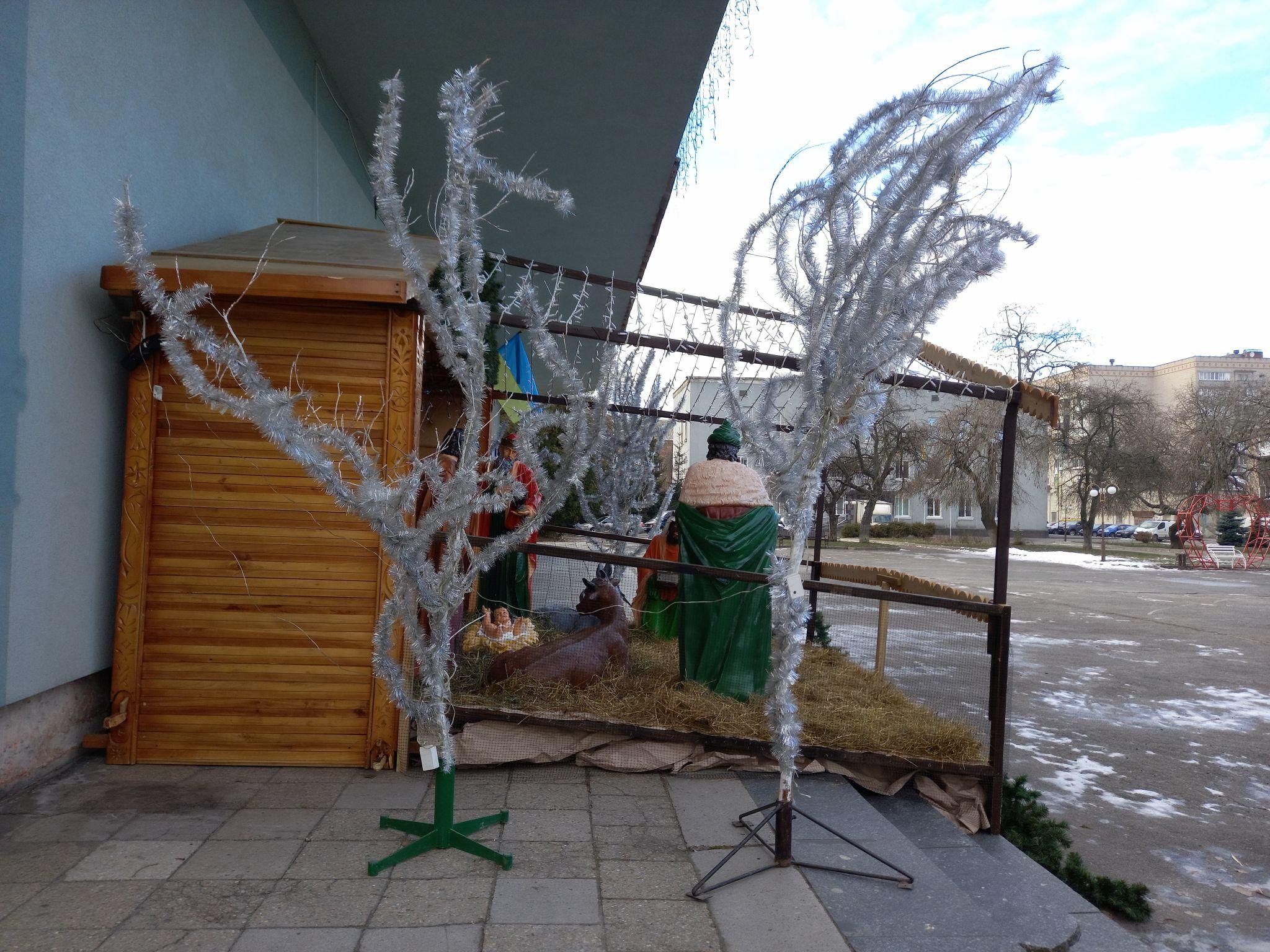 Вранці у середу, 21 грудня біля Міського будинку культури кипить робота. Тут готують святкові локації до Різдва. На ґанку стоїть вертеп, обабіч нього — по дві невеликі сріблясті ялинки. Поруч із ялинками заступник директора міського будинку культури Анатолій Луцков працює з інструментами.