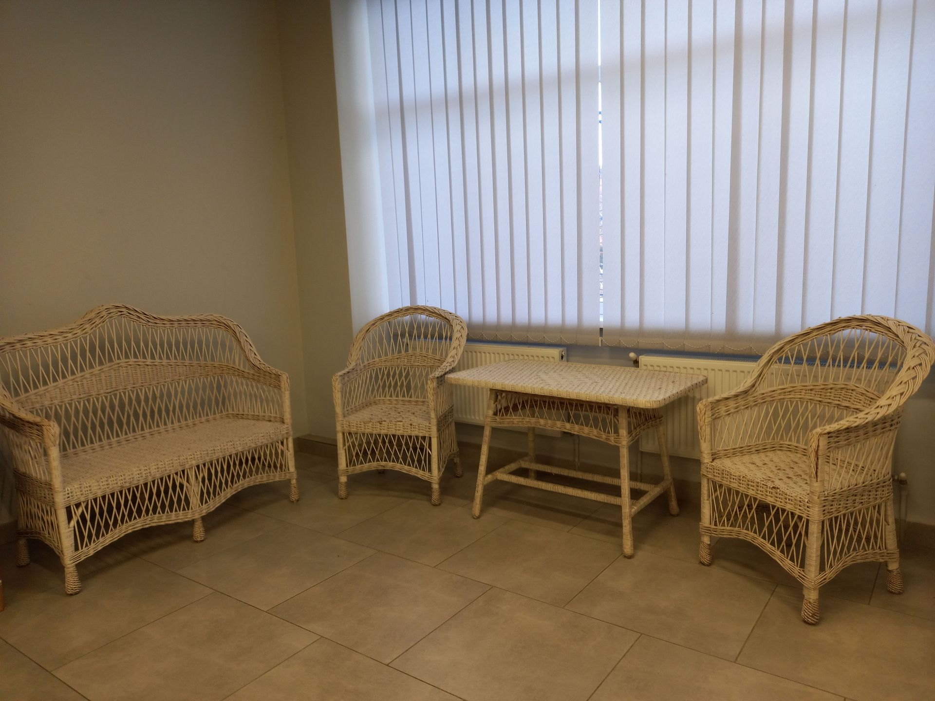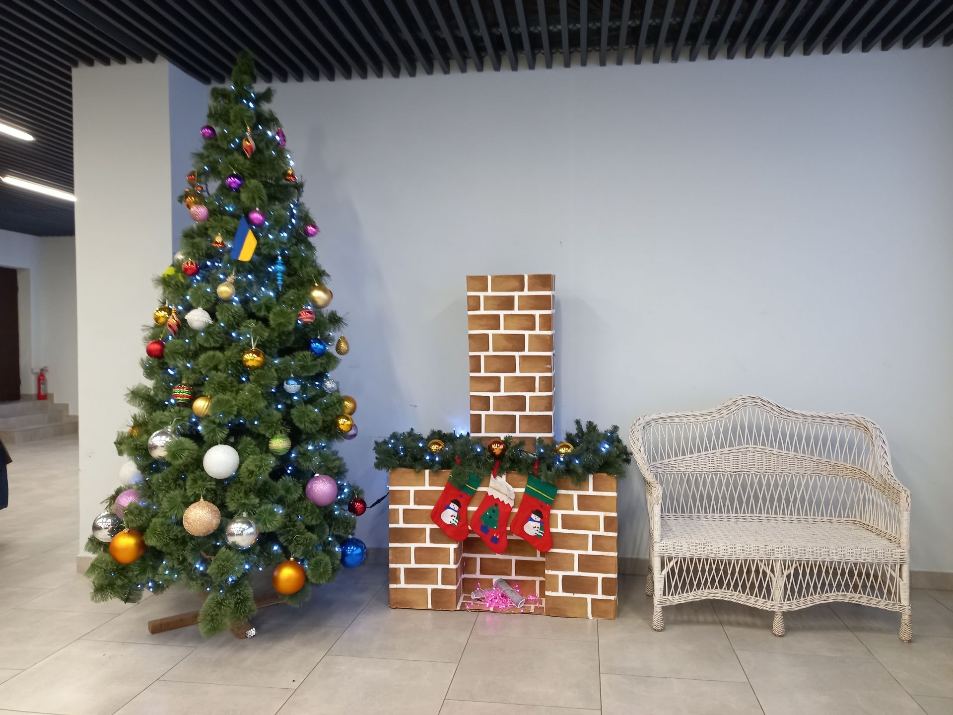 Праворуч від входу в будинок культури вже поставили фото-зони, які ми бачили торік. Вони теж будуть світитися. А в приміщенні самого будинку культури встановили ялинку, прикрашену не лише новорічними іграшками, а й жовто-блакитними прапорцями, облаштували декорації у вигляді каміну, а також поставили плетені крісла та столик, тож можна буде зробити фото на згадку.