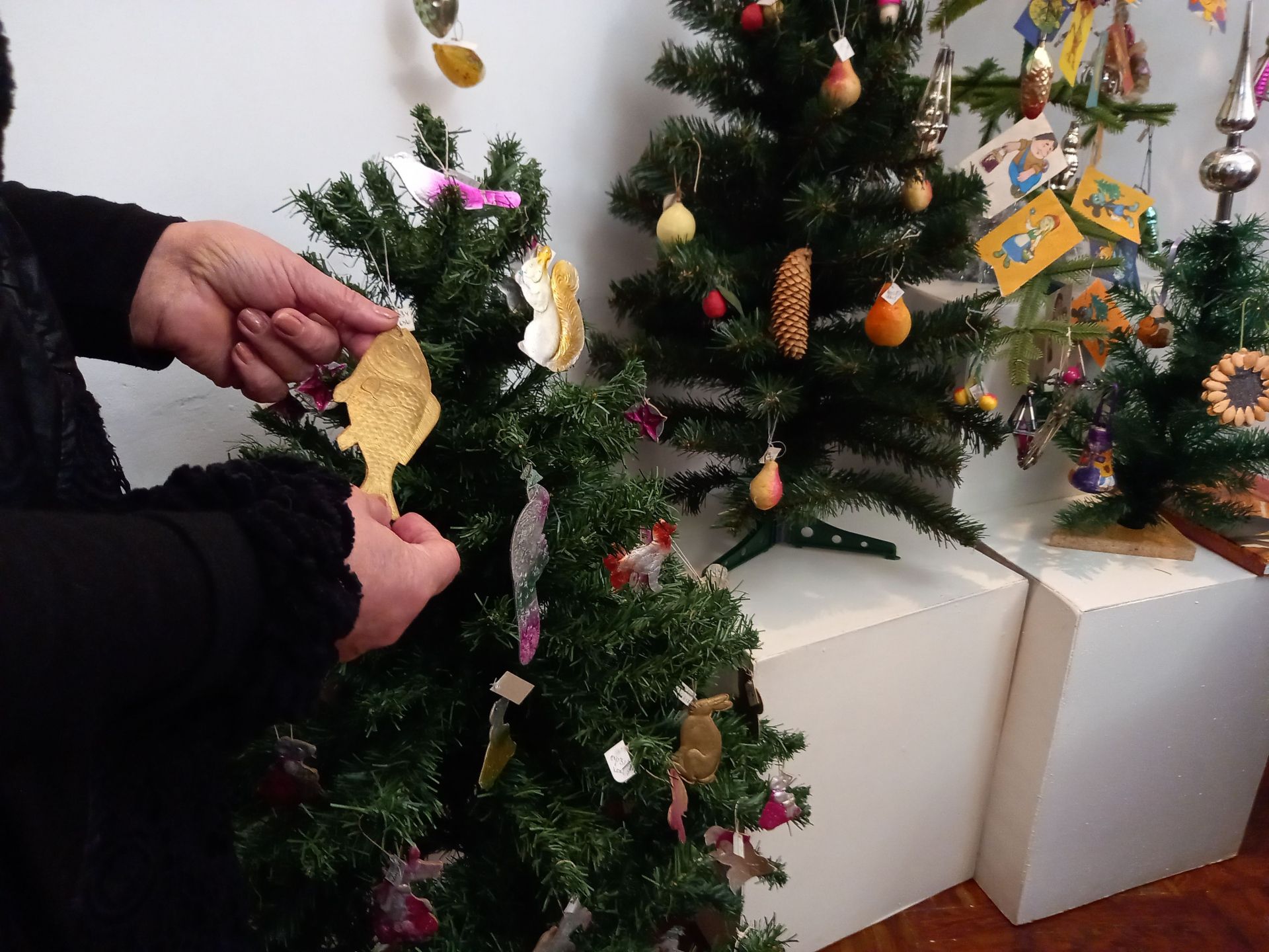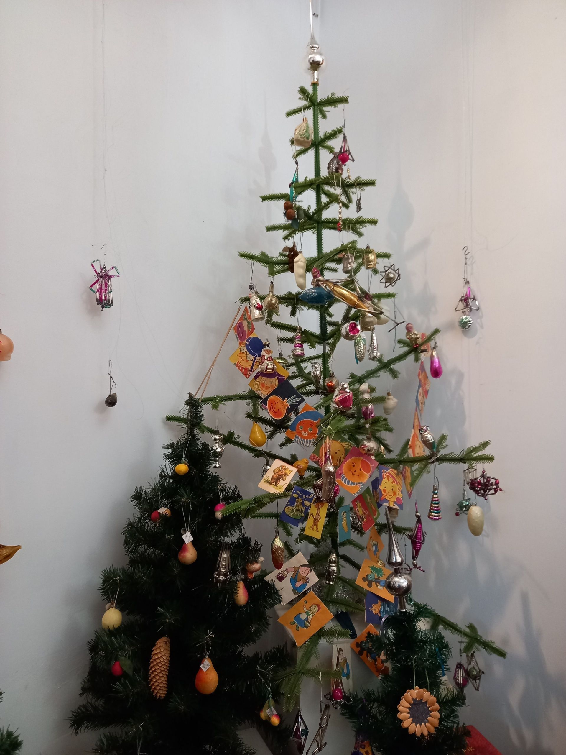 — Тепер хочу вам показати іграшки хрущовського періоду, — продовжує Макаревич. — Перед вами ялинка 1960-их років. Її подарувала нам Людмила Дзюбенко. Вона невелика і на ній маленькі іграшки. Колись у Козятині люди жили в невеликих квартирах-хрущовках, часто вони були комунальні. Такі міні-ялинки з’явилися для того, щоб була змога розмістити новорічне дерево навіть у крихітній комунальній квартирі. У нас в експозиції дві такі мініатюрні ялинки, іграшки до яких нам подарувала художниця Світлана Ігнатенко.