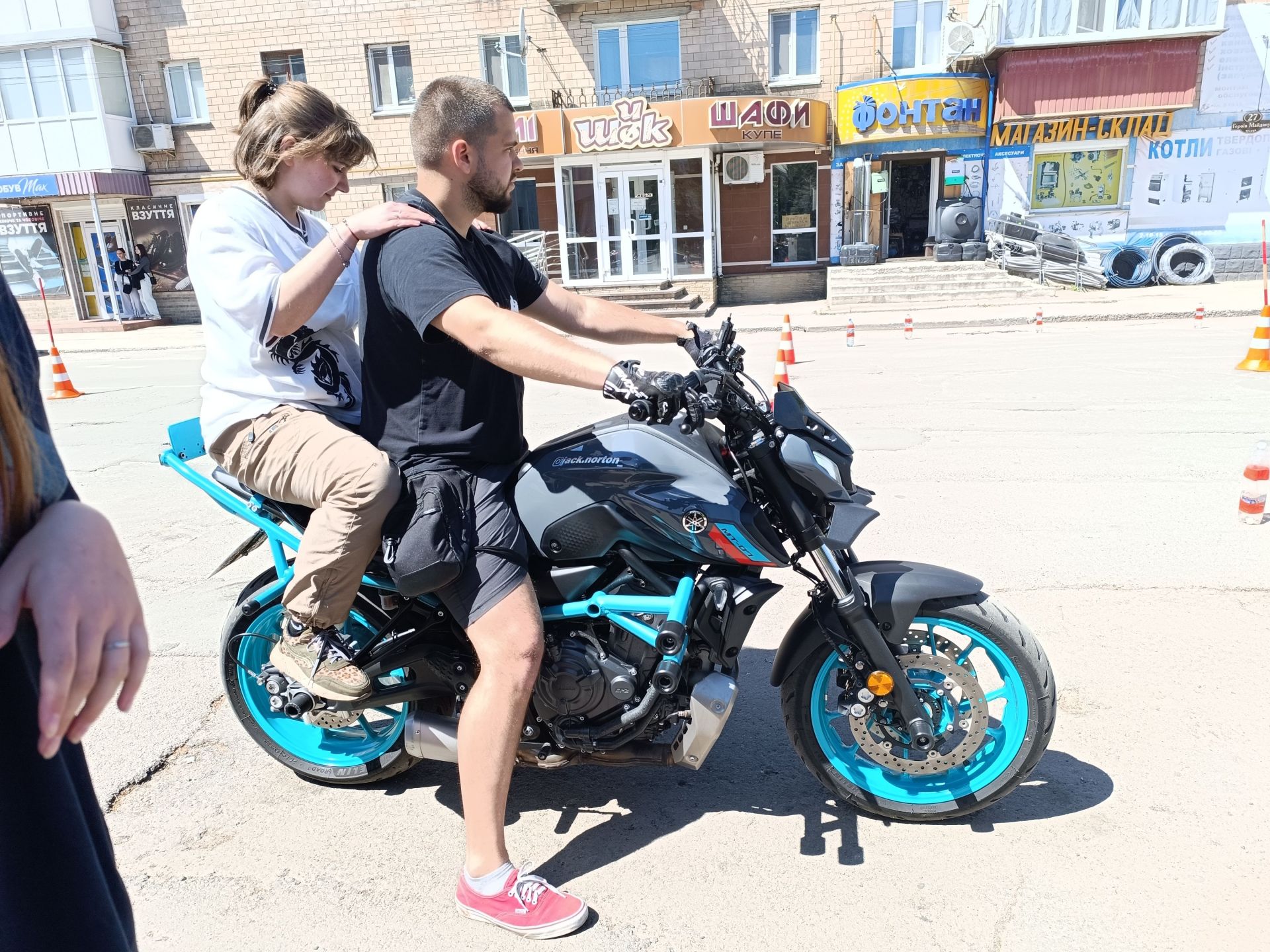 Байкери не тільки їздили самі, а й катали козятинчан за донат від 50 гривень. Спробувала Маша. Дівчина проїхала із Владом.