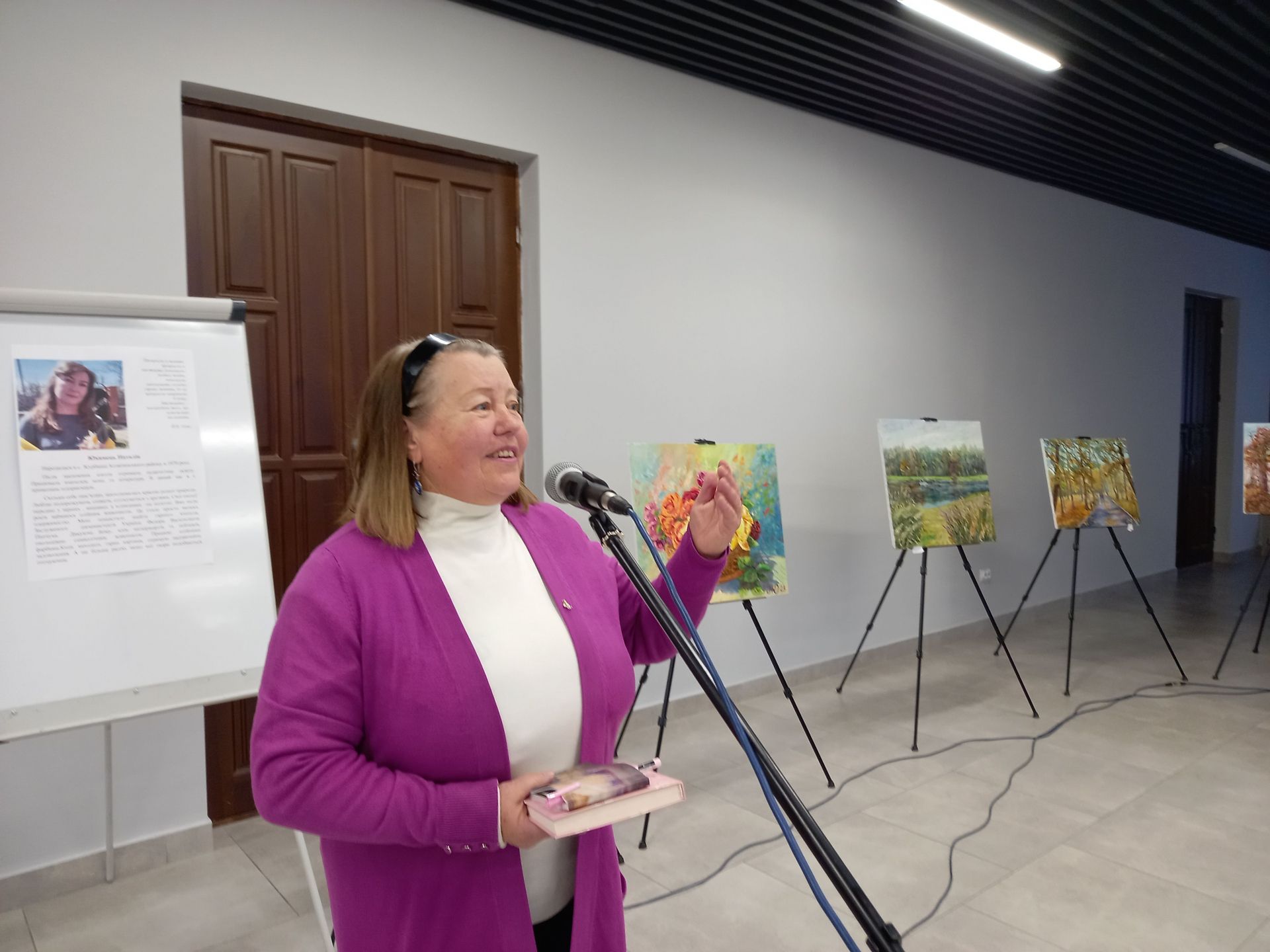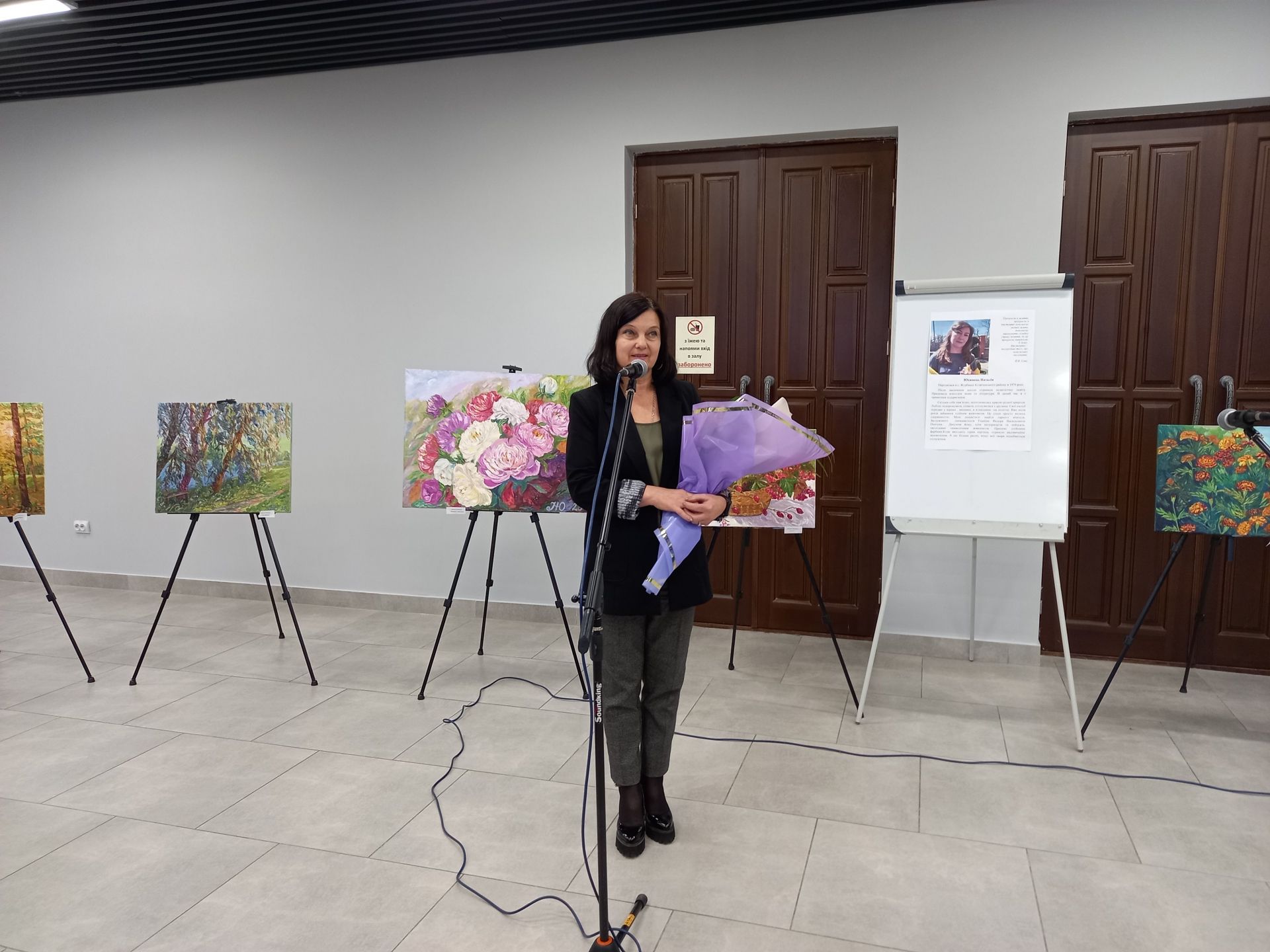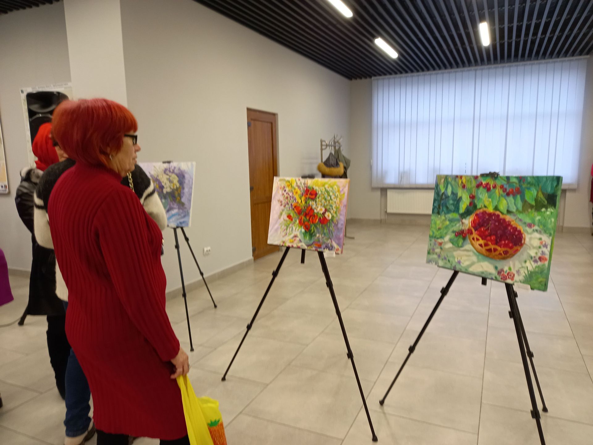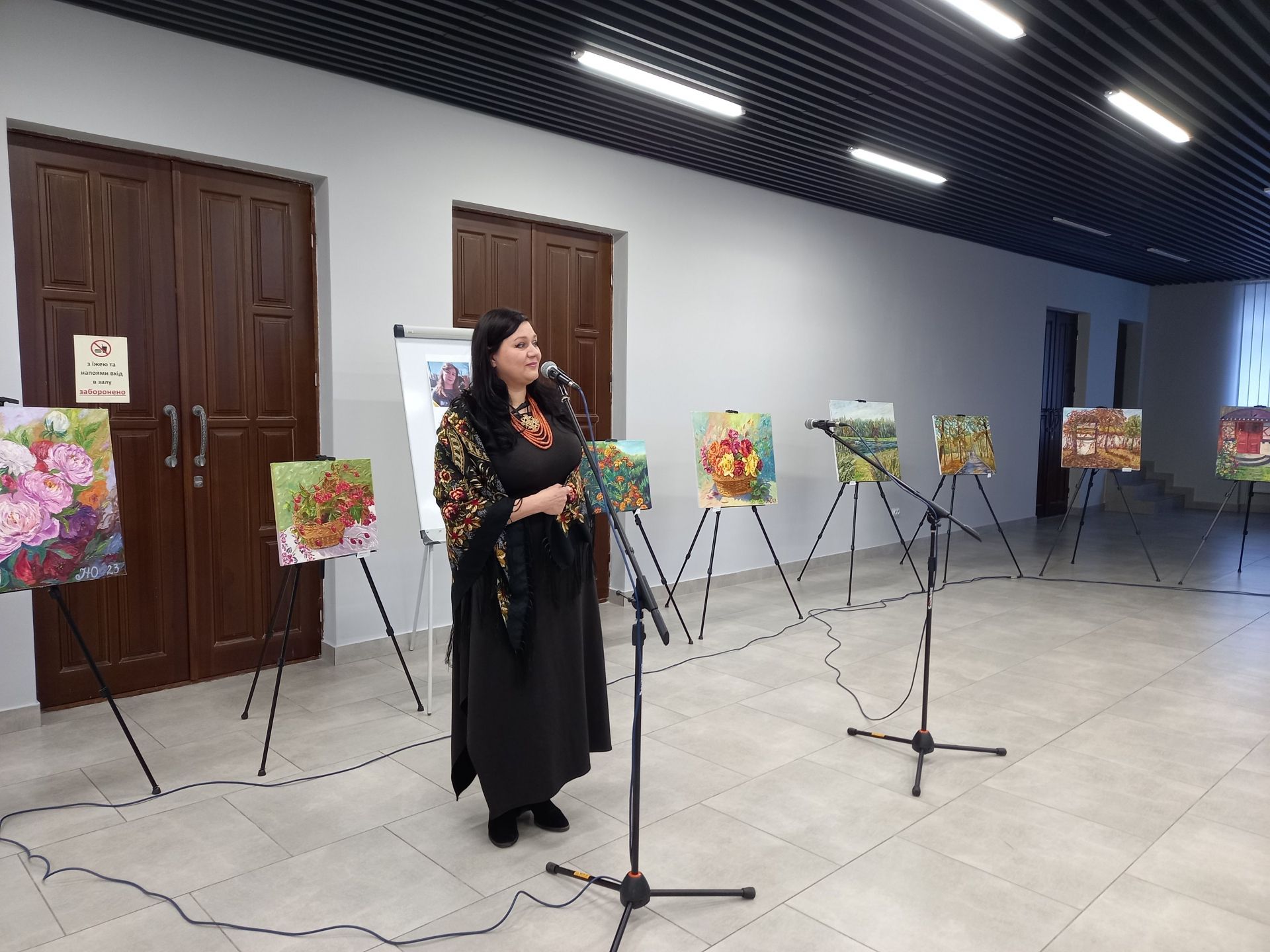 Чотирнадцять живописних полотен художниці експонували у фойє будинку культури. Це — пейзажі та натюрморти. Усі роботи — теплі та барвисті. Тож і виставку назвали «Сонячні барви».