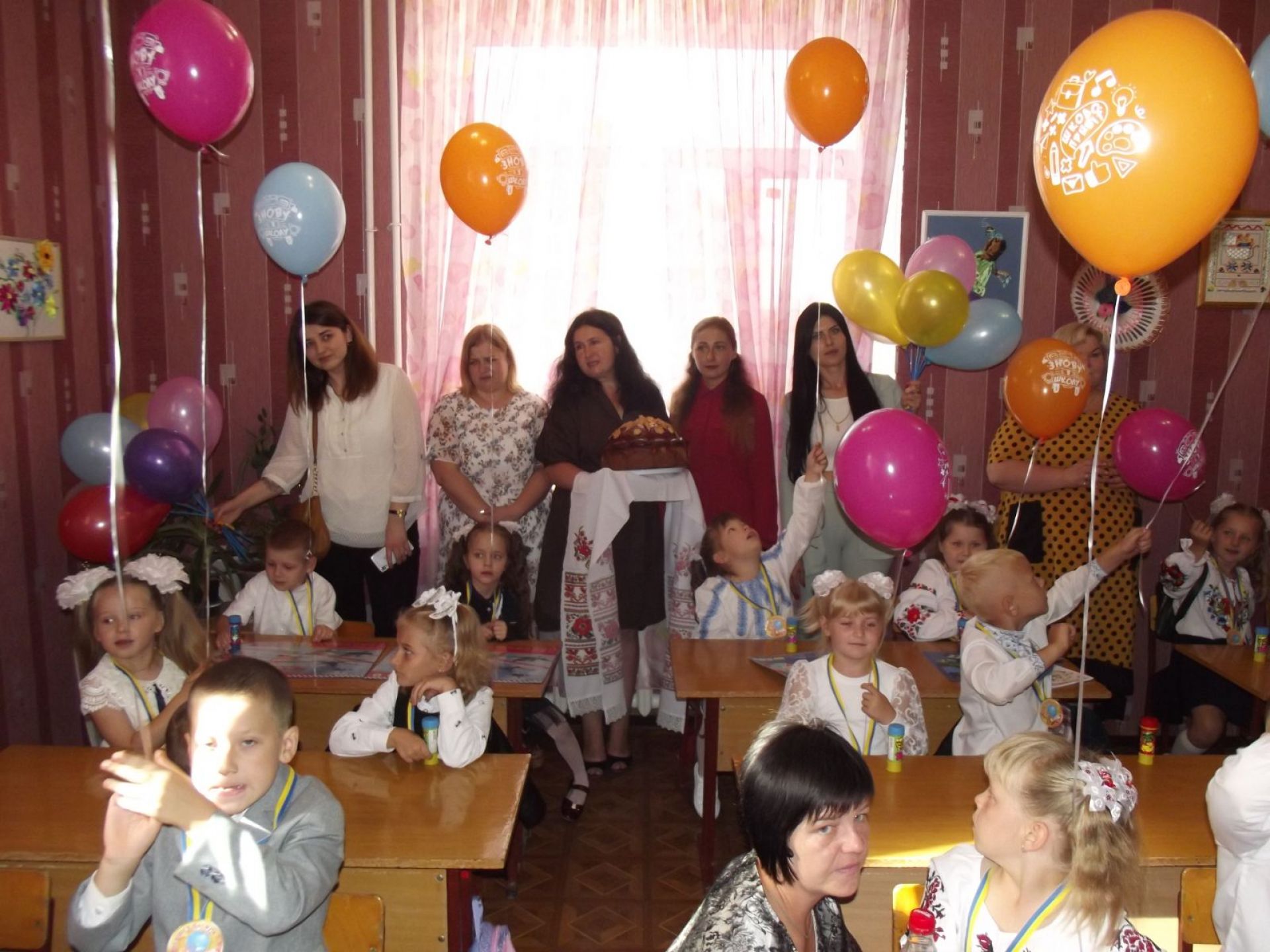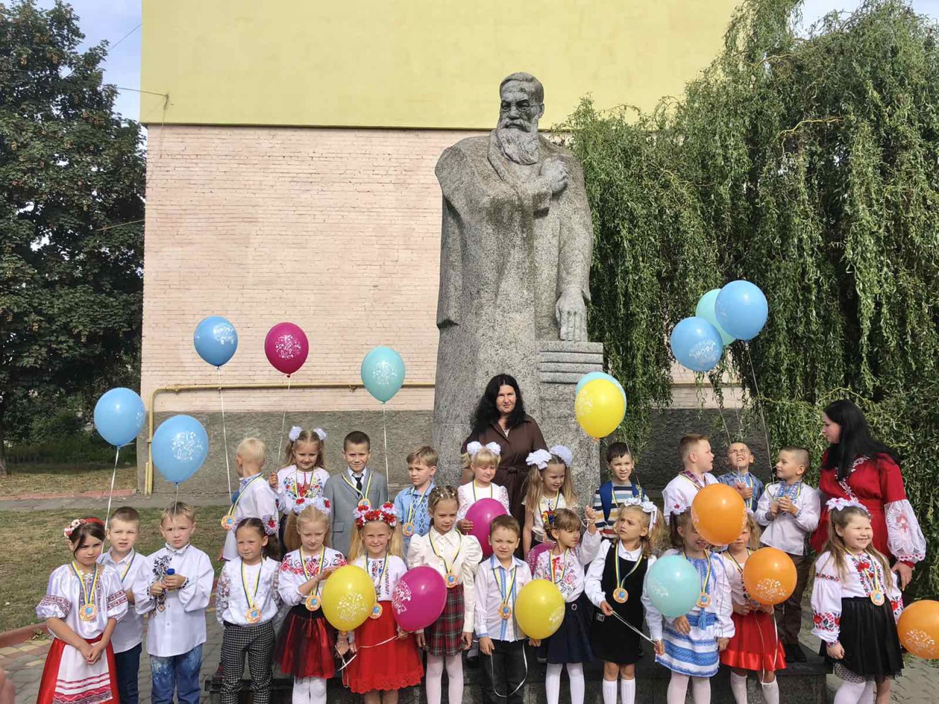 Веселе Лисеня, за допомогою якого школярі знайомились один з одним та своєю вчителькою, стало чудовим другом та розрядило обстановку, додало у класі сміху та дитячого гомону. А запашний коровай прийшов до смаку всім, і дорослим, і малим. Справжньою забавою для діток став подарунок-сюрприз. Це яскраві кульки та бульбашки. Ну і на останок гуртова фотосесія біля пам'ятника Михайла Грушевського.