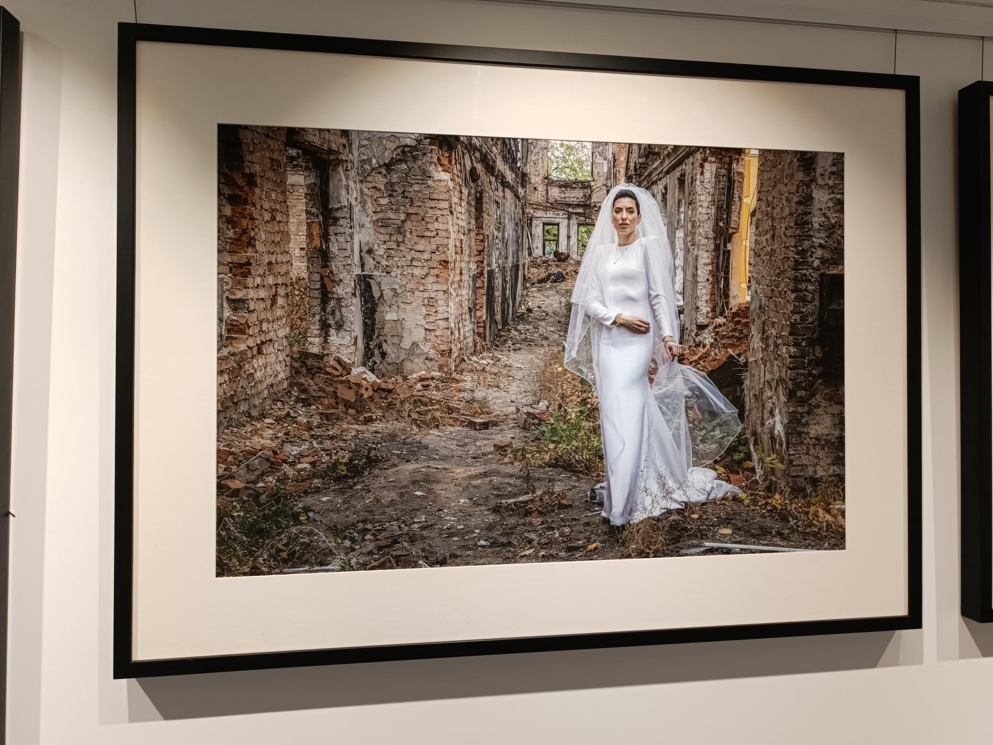 На іншому фото молода жінка, зодягнена у весільну сукню. Вона стоїть серед руїн української школи, яку знищила російська армія. Ця світлина демонструє контраст між реаліями війни, яка приносить руйнування, та жагою людей продовжувати жити своє життя, виходячи заміж і народжуючи дітей.
