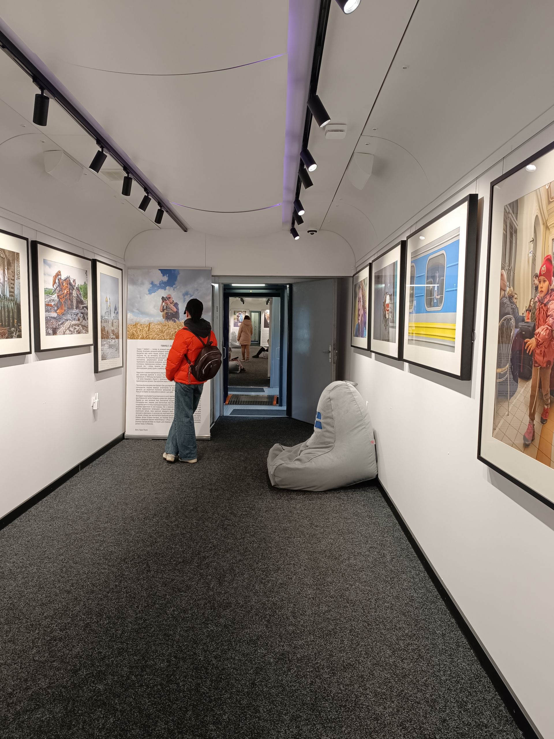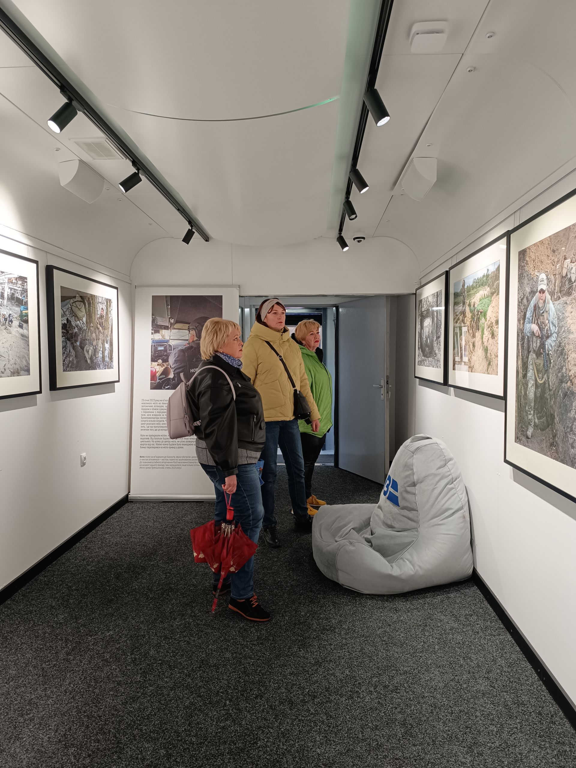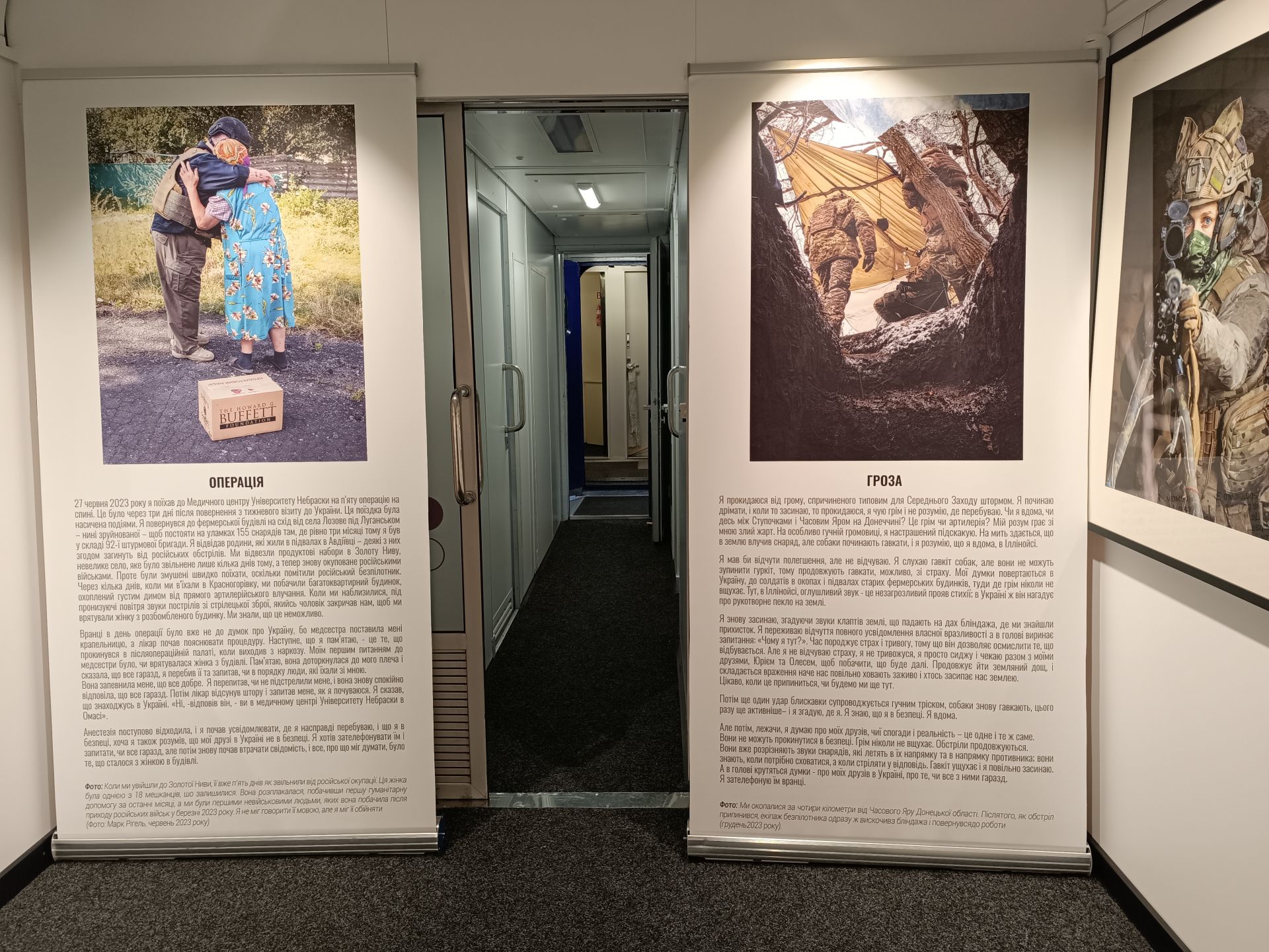 — Наш поїзд називається «Відвага нації», — розповідає Ольга Рандоха, начальник «Мистецького поїзда». — Він демонструє нашу міцність, нашу відвагу в боротьбі за демократію, за свободу і незалежність нашої країни. Цей поїзд унікальний, він складається з трьох вагонів. Два вагони перероблені суто під галерею з професійним освітленням та унікальним музичним оформленням. Третій вагон у нас лаунж-зона. Загалом на виставці представлено 60 світлин, які зробив Говард Баффет.